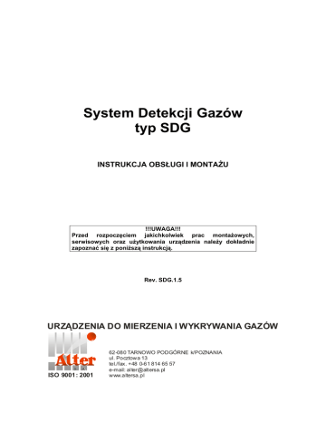 System Detekcji Gazów typ SDG INSTRUKCJA OBSŁUGI I MONTAŻU !!!UWAGA!!! Przed rozpoczęciem jakichkolwiek prac montażowych, serwisowych oraz użytkowania urządzenia należy dokładnie zapoznać się z poniższą instrukcją. Rev. SDG.1.5 URZĄDZENIA DO MIERZENIA I WYKRYWANIA GAZÓW ISO 9001: 2001 62-080 TARNOWO PODGÓRNE k/POZNANIA ul. Pocztowa 13 tel./fax. +48 0-61 814 65 57 e-mail: [email protected] www.altersa.pl SPIS TREŚCI OSTRZEŻENIA I ISTOTNE UWAGI ........................................................................................3 PRZEZNACZENIE URZĄDZENIA ...........................................................................................6 OGÓLNA CHARAKTERYSTYKA URZĄDZENIA.....................................................................6 OPIS FUNKCJONALNY CENTRALKI SDG.............................................................................9 Opis elementów płyty czołowej centralki sterującej ..............................................................9 Diody sygnalizacji stanu głowic detekcyjnych (1-4) ..........................................................9 Sygnalizacja zasilania .....................................................................................................10 Kasowanie pamięci alarmów 2 progu .............................................................................10 Wyłącznik akumulatora ...................................................................................................10 Komora zaciskowa..............................................................................................................10 Wewnętrzny sygnalizator akustyczny .................................................................................11 WSPÓŁPRACA Z ZEWNĘTRZNYM SYGNALIZATOREM AKUSTYCZNO-OPTYCZNYM ..11 WSPÓŁPRACA CENTRALKI Z INNYMI URZĄDZENIAMI WYKONAWCZYMI.....................11 KONFIGUROWANIE CENTRALKI STERUJĄCEJ ................................................................12 MONTAŻ SYSTEMU..............................................................................................................13 Montaż głowic detekcyjnych ...............................................................................................13 Montaż centralki sterującej .................................................................................................15 Dokonywanie podłączeń do centralki sterującej .................................................................16 URUCHAMIANIE SYSTEMU .................................................................................................19 ZACHOWANIE SIĘ W PRZYPADKU WYSTĄPIENIA ALARMU ...........................................20 KONTROLA OKRESOWA .....................................................................................................20 ZALECENIA EKSPLOATACYJNE .........................................................................................21 UWAGI DOTYCZĄCE ZŁOMOWANIA URZĄDZENIA ..........................................................21 PODSTAWOWE PARAMETRY TECHNICZNE .....................................................................22 SPECYFIKACJA GŁOWIC GD-73 .........................................................................................23 TYPOWE USTERKI I SPOSOBY ICH USUWANIA ...............................................................23 WYKAZ CZĘŚĆI ZAMIENNYCH I OPCJONALNYCH ...........................................................24 2 OSTRZEŻENIA I ISTOTNE UWAGI ! ! ! ! ! ! ! ! ! ! ! ! ! ! ! Dla zachowania bezpieczeństwa urządzenie musi być montowane, obsługiwane i konserwowane wyłącznie przez wykwalifikowany personel. Przed podjęciem jakichkolwiek prac montażowych bądź serwisowych należy dokładnie przeczytać w całości poniższą instrukcję. W urządzeniu znajduje się napięcie niebezpieczne dla życia ludzi i zwierząt. Zdejmowanie pokrywy komory zacisków lub płyty czołowej, oraz dokonywanie jakichkolwiek prac montażowych, konfiguracyjnych i serwisowych wolno dokonywać wyłącznie przy odłączonym zasilaniu. Zabrania się samodzielnego dokonywania jakichkolwiek napraw i zmian w układzie centrali i głowicach detekcyjnych. Urządzenie należy używać wyłącznie zgodnie z przeznaczeniem i opisami zawartymi w poniższej instrukcji, w przeciwnym razie urządzenie może działać nieprawidłowo i nie gwarantować bezpieczeństwa. Instalacja gazowa i urządzenie odcinające (zawór odcinający), jeśli jest, powinny być zgodne z państwowymi przepisami obowiązującymi w kraju, gdzie urządzenie będzie zainstalowane. Stała instalacja sieciowa, służąca do zasilania modułu, musi zostać wyposażona w urządzenie odłączające, umożliwiające odłączenie od sieci zasilającej, w którym odległość między stykami wszystkich biegunów wynosi nie mniej niż 3mm. Urządzenie odłączające musi zostać wbudowane zgodnie z przepisami dotyczącymi budowy takiej instalacji. Zastosowane czujniki eksplozymetryczne nie są selektywne w zbiorze gazów wybuchowych, tzn. reagują na obecność innych gazów palnych i wybuchowych zawyżając wskazania. Taka reakcja czujnika może powodować przedwczesne uruchamianie sygnalizacji alarmowej, tworzy to jednak dodatkowy margines bezpieczeństwa. Urządzenie może także generować sygnał alarmowy w przypadku użycia w jego otoczeniu dużych ilości niektórych środków kosmetycznych lub czyszczących zawierających alkohol, rozpuszczalniki lub węglowodory (np. dezodoranty). Fałszywe alarmy mogą także być generowane przy narażeniu czujnika na duże ilości oparów kuchennych i związków aromatycznych. Duże stężenia (kilkakrotnie przewyższające dopuszczalne – ze względów toksycznych – stężenia chwilowe) takich związków jak tlenki azotu i dwutlenek siarki mogą powodować zaniżenie wskazań progów alarmowych. Na obniżenie czułości czujników eksplozymetrycznych mają także wpływ takie związki lotne jak: par