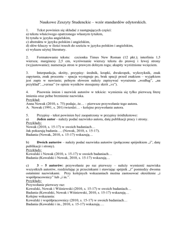 Naukowe Zeszyty Studenckie – wzór standardów edytorskich. 1. Tekst powinien się składać z następujących części: a) tekstu właściwego opatrzonego własnym tytułem, b) tytułu w języku angielskim, c) abstraktu w języku polskim i angielskim, d) słów-kluczy w ilości trzech do sześciu w języku polskim i angielskim, e) wykazu użytej literatury. 2. Formatowanie tekstu: czcionka Times New Roman (12 pkt.); interlinia 1,5 wiersza; marginesy 2,5 cm, wyrównanie wierszy tekstu do prawej i lewej strony (wyjustowanie); numeracja stron w prawym dolnym rogu; akapity wyróżnione wcięciem. 3. Interpunkcja, skróty, przypisy: średnik, kropki, dwukropek, wykrzyknik, znak zapytania, znak procentu – spacja występuje po, brak spacji przed znakiem – wyjątkiem jest zapis w nawiasie; pełnym słowem należy zapisywać wyrażenia „według”, „na przykład”, „versus” (w opisie wyników stosujemy skrót „vs”). 4. Pisownia imion i nazwisk autorów w tekście: wymienia się tylko pierwszą literę imienia oraz pełne brzmienie nazwiska. Przykład: Anna Nowak (2010, s. 75) podaje, że… - pierwsze przywołanie tego autora. A. Nowak (1991, s. 201) twierdzi… - kolejne przywołanie autora. 5. Przypisy - tekst powinien być zaopatrzony w przypisy śródtekstowe: a) Jeden autor - należy podać nazwisko autora, datę publikacji pracy i strony. Przykłady: Nowak (2010, s. 15-17) w swoich badaniach… Jak pokazują badania…. (Nowak, 2010, s. 15-17). Badania (Nowak, 2010, s. 15-17) wskazują… b) Dwóch autorów – należy podać nazwiska autorów (połączone spójnikiem „i”, datę publikacji i strony). Przykłady: Kowalski i Nowak (2010, s. 15-17) w swoich badaniach… Badania (Kowalski i Nowak, 2010, s. 15-17) wskazują… c) 3 – 5 autorów: przywołanie po raz pierwszy – należy wymienić nazwiska wszystkich autorów, rozdzielając je przecinkami i stawiając spójnik „i” pomiedzy dwoma ostatnimi nazwiskami. Przy kolejnych wskazaniach można zastosować określenie „i współpracownicy” lub „i in.”. Przykłady: Przywołanie pierwszy raz: Kowalski, Nowak i Wiśniewski (2010, s. 15-17) w swoich badaniach… Badania (Kowalski, Nowak i Wiśniewski, 2010, s. 15-17) wskazują… Kolejne wskazania: Kowalski i współpracownicy (2010, s. 15-17) w swoich badaniach… Badania (Kowalski i in., 2010, s. 15-17) wskazują…. d) Przywoływanie jednocześnie kilku prac: należy wymienić je w kolejności alfabetycznej, według nazwiska pierwszego autora oddzielając je od siebie średnikiem. Przykłady: (Kowalski, 2008; Wiśniewski, 2007) (Kowalski, 2008, 2010; Nowak i Wiśniewski, 2009) e) Przywołanie publikacji internetowej: należy wymienić nazwisko autora, tytuł artykułu, pełny adres strony internetowej, data dostępu w kwadracie prostokątnym. Przykład: (Nowak, Przemoc w rodzinie, http://www.przykladowy_adres.pl, [12.03.2012]) f) Przytaczanie fragmentu pracy: należy zawsze podać autora/autorów, rok wydania i numer strony. Przykład: (Nowak, 2007, s. 89) 6. Bibliografia: Każdą pozycję należy zacząć od nowego wiersza, stosując wcięcie specjalne – wysunięcie (patrz formatowanie akapitu). Prace zapisujemy alfabetycznie według nazwisk autorów. Przykłady (proszę zwrócić uwagę na kursywę i wysunięcie tekstu): a) Publikacja zwarta: Chrzanowska I., Problemy edukacji dzieci i młodzieży z niepełnosprawnością. Regionalna specyfika czy ogólnopolska tendencja?, Kraków 2010. b) Rozdziały w książkach: Bartkowski J., Między stygmatyzacją a odrzuceniem. System szkolny a przygotowanie zawodowe młodych osób niepełnosprawnych, [w:] Młodzi niepełnosprawni – aktywizacja zawodowa i nietypowe formy zatrudnienia, red. E. Giermanowska, Warszawa 2007. Gajda M., Przybyszewski T. Są różne szkoły…, [w:] Wsparcie dziecka z niepełnosprawnością w rodzinie i szkole, red. D. Gorajewska, Warszawa 2008. Galas-Kowalczyk E., Wpływ rodziny na wybór zawodu młodzieży niepełnosprawnej intelektualnie w stopniu lekkim, [w:] Edukacja- Wsparcie – Praca w życiu osób niepełnosprawnych. Wybrane aspekty, red. D. Kukla, Ł. Bednarczyk, WarszawaCzęstochowa 2008. c) Artykuły w czasopismach: Pawlas-Czyż S., Przeciw ageizmowi. O potrzebie wzmacniania społecznej pozycji człowieka starego, [w:] „Wychowanie na co dzień”, nr 7-8, 2008. Konieczna R., Starzenie się i starość w opinii i ocenie ludzi młodych, [w:] „Studia edukacyjne”, nr 1, 1995. Bogucka J., Orzeczenia o potrzebie kształcenia specjalnego, [w:] „Integracja”, nr 2, 2002. d) Strony internetowe: Pisula E., Dzień za dniem. Jak rodzice radzą sobie ze stresem związanym z problemami w rozwoju dzieci, http://sonia.low.pl/sonia/konf_bk/8_pisula.htm, 2005 [13.08.2009].