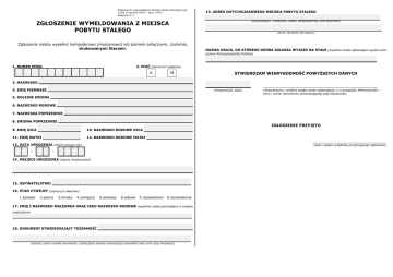 Załącznik do rozporządzenia Ministra Spraw Wewnętrznych z dnia 19 grudnia 2012 r. (poz. 1475). Załącznik nr 3. 19. ADRES DOTYCHCZASOWEGO MIEJSCA POBYTU STAŁEGO ________________________________________________________________________ (MIEJSCOWOŚĆ – DZIELNICA, GMINA, WOJEWÓDZTWO, KOD POCZTOWY) ZGŁOSZENIE WYMELDOWANIA Z MIEJSCA POBYTU STAŁEGO ________________________________________________________________________ (ULICA, NR DOMU, NR LOKALU) Zgłoszenie należy wypełnić komputerowo (maszynowo) lub pismem odręcznym, czytelnie, drukowanymi literami. NAZWA KRAJU, DO KTÓREGO OSOBA ZGŁASZA WYJAZD NA STAŁE (wypełnia osoba zgłaszająca wyjazd poza granice Rzeczypospolitej Polskiej) ________________________________________________________________________ 1. NUMER PESEL 2. PŁEĆ (zaznaczyć właściwe) K M 3. NAZWISKO _________________________________________________________________ 4. IMIĘ PIERWSZE ______________________________________________________________________ STWIERDZAM WIARYGODNOŚĆ POWYŻSZYCH DANYCH ___________________ (miejscowość, data) ________________________________________________ (własnoręczny, czytelny podpis osoby zgłaszającej, a w przypadku Pełnomocnika – seria i numer dokumentu stwierdzającego jego tożsamość) 5. KOLEJNE IMIONA ____________________________________________________________________ 6. NAZWISKO RODOWE _________________________________________________________ 7. NAZWISKA POPRZEDNIE ______________________________________________________ 8. IMIONA POPRZEDNIE ________________________________________________________ 9. IMIĘ OJCA __________________ 10. NAZWISKO RODOWE OJCA ____________________ 11. IMIĘ MATKI __________________ 12. NAZWISKO RODOWE MATKI ______________________ 13. DATA URODZENIA (dzień-miesiąc-rok) - - ____________________________________________________________________________ 15. OBYWATELSTWO ___________________________________________________________________ 16. STAN CYWILNY (zaznaczyć właściwe) 2.panna 3.żonaty 4.zamężna _______________________________ (data i podpis urzędnika przyjmującego zgłoszenie) 14. MIEJSCE URODZENIA (nazwa miejscowości) 1.kawaler ZGŁOSZENIE PRZYJĘTO 5.wdowiec 6.wdowa 7.rozwiedziony 8.rozwiedziona 17. IMIĘ I NAZWISKO MAŁŻONKA ORAZ JEGO NAZWISKO RODOWE (wypełnia osoba pozostająca w związku małżeńskim) _____________________________________________________________________________________________________ 18. DOKUMENT STWIERDZAJĄCY TOŻSAMOŚĆ ________________________________________ ______________________________________________________________________________________ (RODZAJ, SERIA I NUMER DOKUMENTU, OZNACZENIE ORGANU WYDAJĄCEGO DOKUMENT ORAZ DATA JEGO WAŻNOŚCI)