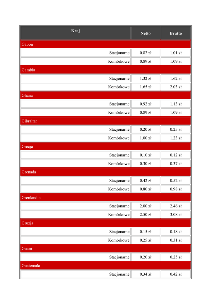Kraj Netto Brutto Stacjonarne 0.82 zł 1.01 zł Komórkowe 0.89 zł 1.09 zł Stacjonarne 1.32 zł 1.62 zł Komórkowe 1.65 zł 2.03 zł Stacjonarne 0.92 zł 1.13 zł Komórkowe 0.89 zł 1.09 zł Stacjonarne 0.20 zł 0.25 zł Komórkowe 1.00 zł 1.23 zł Stacjonarne 0.10 zł 0.12 zł Komórkowe 0.30 zł 0.37 zł Stacjonarne 0.42 zł 0.52 zł Komórkowe 0.80 zł 0.98 zł Stacjonarne 2.00 zł 2.46 zł Komórkowe 2.50 zł 3.08 zł Stacjonarne 0.15 zł 0.18 zł Komórkowe 0.25 zł 0.31 zł Stacjonarne 0.20 zł 0.25 zł Stacjonarne 0.34 zł 0.42 zł Gabon Gambia Ghana Gibraltar Grecja Grenada Grenlandia Gruzja Guam Guatemala Komórkowe 0.54 zł 0.66 zł Stacjonarne 0.79 zł 0.97 zł Komórkowe 0.72 zł 0.89 zł Stacjonarne 0.15 zł 0.18 zł Komórkowe 0.50 zł 0.62 zł Stacjonarne 0.20 zł 0.25 zł Komórkowe 0.50 zł 0.62 zł Stacjonarne 1.00 zł 1.23 zł Komórkowe 1.30 zł 1.60 zł Stacjonarne 0.87 zł 1.07 zł Komórkowe 0.98 zł 1.21 zł Gujana Gujana Francuska Gwadelupa Gwinea Równikowa Gwinea Równikowa