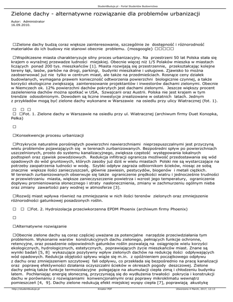 pomieszczeń [4, 9]. Dachy zielone redukują efekt miejskiej wyspy ciepła [7], poprawiają akustykę