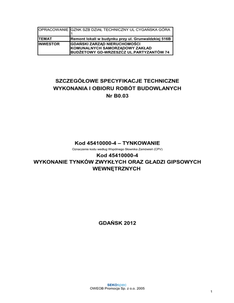 OPRACOWANIE GZNK SZB DZIAŁ TECHNICZNY UL CYGAŃSKA GÓRA 1 TEMAT Remont lokali w budynku przy ul. Grunwaldzkiej 516B INWESTOR GDAŃSKI ZARZĄD NIERUCHOMOŚCI KOMUNALNYCH SAMORZĄDOWY ZAKŁAD BUDśETOWY GD-WRZESZCZ UL.PARTYZANTÓW 74 SZCZEGÓŁOWE SPECYFIKACJE TECHNICZNE WYKONANIA I OBIORU ROBÓT BUDOWLANYCH Nr B0.03 Kod 45410000-4 – TYNKOWANIE Oznaczenie kodu według Wspólnego Słownika Zamówień (CPV) Kod 45410000-4 WYKONANIE TYNKÓW ZWYKŁYCH ORAZ GŁADZI GIPSOWYCH WEWNĘTRZNYCH GDAŃSK 2012 SEKOspec OWEOB Promocja Sp. z o.o. 2005 1 1. WSTĘP 1.1. Przedmiot ST Przedmiotem niniejszej szczegółowej specyfikacji technicznej (SST) są wymagania dotyczące wykonania i odbioru tynków zwykłych i gipsowych wewnętrznych w remontowanych lokalach w Gdańsk przy ul. Grunwaldzkiej 516B 1.2. Zakres stosowania ST Szczegółowa specyfikacja techniczna (SST) stosowana jest jako dokument przetargowy i kontraktowy przy zlecaniu i realizacji robót wymienionych w pkt. 1.1. 1.3. Zakres robót objętych ST – Tynki zwykłe, których dotyczy specyfikacja, stanowią warstwę ochronną, wyrównawczą lub kształtującą formę architektoniczną tynkowanego elementu, nanoszoną ręcznie lub mechanicznie, do której wykonania zostały uŜyte zaprawy odpowiadające wymaganiom norm lub aprobat technicznych. – Tynki zwykłe ze względu na miejsce stosowania, rodzaj podłoŜa, rodzaj zaprawy, liczbę warstw i technikę wykonania powinny odpowiadać normie PN-70/B-10100 p. 3. „Roboty tynkowe. Tynki zwykłe. Wymagania i badania przy odbiorze”. – Przy wykonaniu tynków zwykłych naleŜy przestrzegać zasad podanych w normie PN-70/B-10100 p. 3.1.1. – PodłoŜa w zaleŜności od ich rodzaju powinny być przygotowane zgodnie z wymaganiami normy PN-70/B-10100 p. 3.3.2. W remontowanym lokalu naleŜy wykonać: - zbicie tynków - gruntowanie ścian Uni Gruntem - wykonanie nowych tynków - wykonanie gładzi gipsowych 1.4. Określenia podstawowe Określenia podane w niniejszej ST są zgodne z obowiązującymi normami oraz przepisami i oznaczają: – roboty budowlane – wszystkie prace budowlane związane z wykonaniem tynków zgodnie z ustaleniami dokumentacji projektowej, – Wykonawca – osoba lub organizacja wykonująca roboty budowlane, – wykonanie – wszystkie działania przeprowadzane w celu wykonania robót, – procedura – dokument zapewniający jakość; definiujący, jak, kiedy, gdzie i kto wykonuje i kontroluje poszczególne operacje robocze; procedura moŜe być zastąpiona normami, aprobatami technicznymi i instrukcjami, – ustalenia projektowe – ustalenia podane w dokumentacji projektowej zawierające dane opisujące przedmiot i wymagania dla określonego obiektu lub roboty oraz niezbędne do jego wykonania. 1.5. Ogólne wymagania dotyczące robót Wykonawca robót jest odpowiedzialny za jakość ich wykonania oraz za ich zgodność z dokumentacją projektową, ST i poleceniami Inspektora nadzoru. Ogólne wymagania dotyczące robót podano w ST Kod CPV 45000000-7 „Wymagania ogólne” pkt 1.5. SEKOspec OWEOB Promocja Sp. z o.o. 2005 2 2. MATERIAŁY 2.1. Ogólne wymagania dotyczące materiałów, ich pozyskiwania i składowania podano w ST Kod CPV 45000000-7 „Wymagania ogólne” pkt 2. 2.2. Zaprawy do wykonania tynków zwykłych powinny odpowiadać wymaganiom normy PN-90/B-14501 „Zaprawy budowlane zwykłe” lub aprobatom technicznym. 2.3. Woda Do przygotowania zapraw i skrapiania podłoŜa stosować moŜna wodę odpowiadającą wymaganiom normy PN-88/B-32250 „Materiały budowlane. Woda do betonów i zapraw”. Bez badań laboratoryjnych moŜna stosować wodociągową wodę pitną. Niedozwolone jest uŜycie wód ściekowych, kanalizacyjnych, bagiennych oraz wód zawierających tłuszcze organiczne, oleje i muł. 2.4. Piasek Piasek powinien spełniać wymagania normy PN-79/B-06711 „Kru-szywa mineralne. Piaski do zapraw budowlanych”, a w szczególności: 2.4.1. – – nie zawierać domieszek organicznych, mieć frakcje róŜnych wymiarów, a mianowicie: piasek drobnoziarnisty 0,25-0,5 mm, piasek średnioziarnisty 0,5-1,0 mm, piasek gruboziarnisty 1,0-2,0 mm. 2.4.2. Do spodnich warstw tynku naleŜy stosować piasek gruboziarnisty odmiany 1, do warstw wierzchnich – średnioziarnisty odmiany 2. 2.4.3. Do gładzi piasek powinien być drobnoziarnisty i przechodzić całkowicie przez sito o prześwicie 0,5 mm. 2.5. Zaprawy budowlane cementowo-wapienne • Marka i skład zaprawy powinny być zgodne z wymaganiami normy PN-90/B-14501 „Zaprawy budowlane zwykłe”. • Przygotowanie zapraw do robót tynkarskich powinno być wykonywane mechanicznie. • Zaprawę naleŜy przygotować w takiej ilości, aby mogła być wbudowana moŜliwie szybko po jej przygotowaniu, tj. w okresie ok. 3 godzin. • Do zaprawy tynkarskiej naleŜy stosować piasek rzeczny lub kopalniany. • Do zaprawy cementowo-wapiennej naleŜy stosować cement portlandzki według normy PN-B-19701;1997 „Cementy powszechnego uŜytku” PN-EN 197-1:2002. Za zgodą Inspektora nadzoru moŜna stosować cement z dodatkiem ŜuŜla lub popiołów lotnych 25 i 35 oraz cement hutniczy 25 pod warunkiem, Ŝe temperatura otoczenia w ciągu 7 dni od chwili wbudowania zaprawy nie będzie niŜsza niŜ +5°C. • Do zapraw cementowo-wapiennych naleŜy stosować wapno suchogaszone lub gaszo-ne w postaci ciasta wapiennego otrzymanego z wapna niegaszonego, które powinno tworzyć jednolitą i jednobarwną masę, bez grudek niegaszonego wapna i zanieczyszczeń obcych. Skład objętościowych składników zapraw naleŜy dobierać doświadczalnie, w zaleŜności od wymaganej marki zaprawy oraz rodzaju cementu i wapna. 2.6 gips wg PN-B-30041:1997 Preparat gruntujący jest impregnatem przeznaczonym do gruntowania i wzmacniania wszystkich nasiąkliwych, nadmiernie chłonnych i osłabionych podłoŜy, wykonanych z betonu, gazobetonu, płyt cementowych, gipsowych i gipsowo-kartonowych, tynków gipsowych, cementowych i cementowo-wapiennych ora
