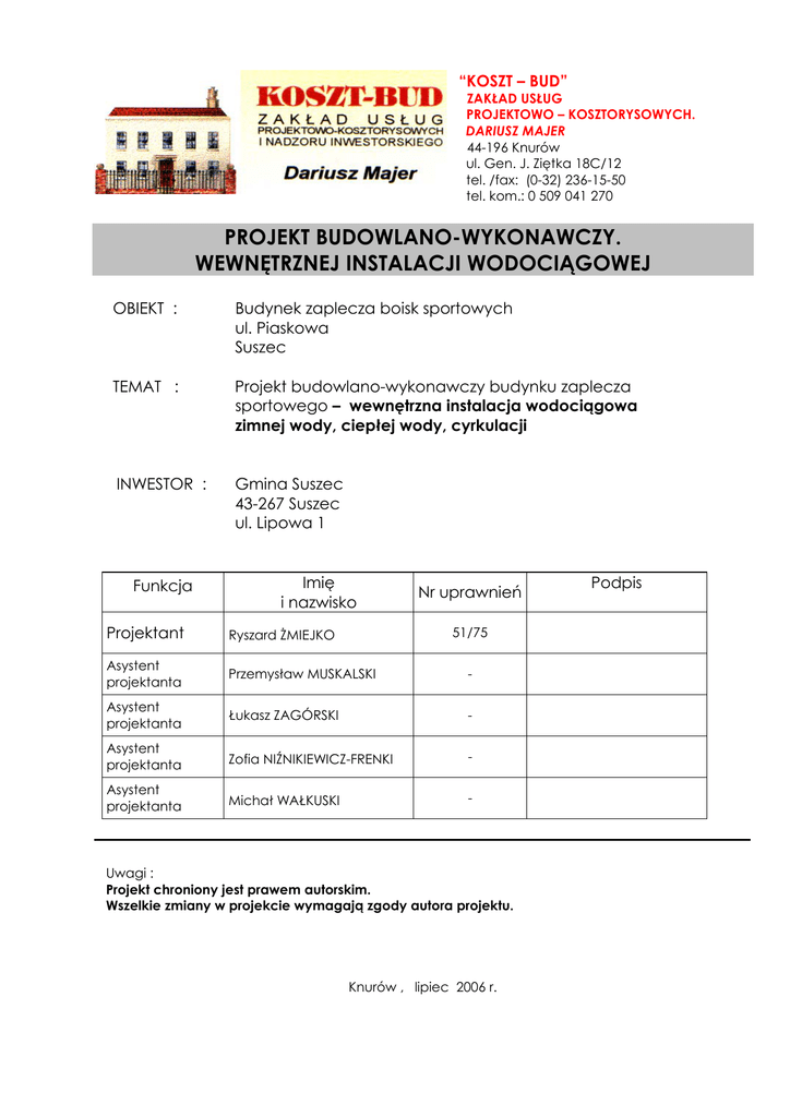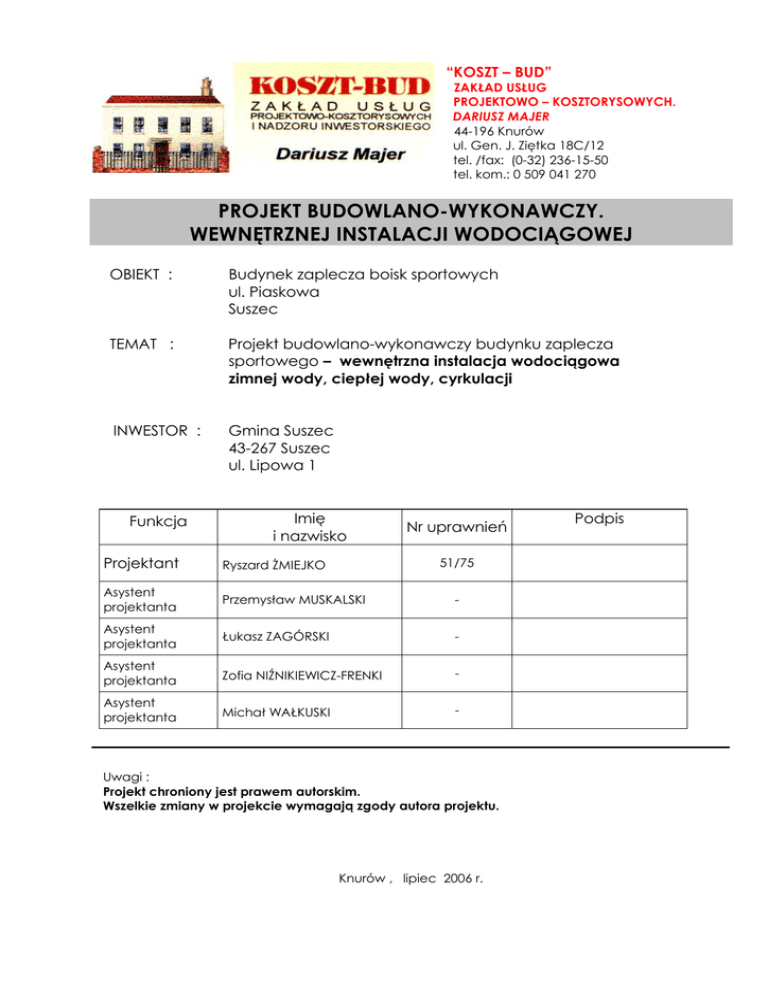 “KOSZT – BUD” ZAKŁAD USŁUG PROJEKTOWO – KOSZTORYSOWYCH. DARIUSZ MAJER 44-196 Knurów ul. Gen. J. Ziętka 18C/12 tel. /fax: (0-32) 236-15-50 tel. kom.: 0 509 041 270 PROJEKT BUDOWLANO-WYKONAWCZY. WEWNĘTRZNEJ INSTALACJI WODOCIĄGOWEJ OBIEKT : Budynek zaplecza boisk sportowych ul. Piaskowa Suszec TEMAT : Projekt budowlano-wykonawczy budynku zaplecza sportowego – wewnętrzna instalacja wodociągowa zimnej wody, ciepłej wody, cyrkulacji INWESTOR : Gmina Suszec 43-267 Suszec ul. Lipowa 1 Funkcja Imię i nazwisko Nr uprawnień Projektant Ryszard ŻMIEJKO Asystent projektanta Przemysław MUSKALSKI - Asystent projektanta Łukasz ZAGÓRSKI - Asystent projektanta Zofia NIŹNIKIEWICZ-FRENKI - Asystent projektanta Michał WAŁKUSKI - 51/75 Uwagi : Projekt chroniony jest prawem autorskim. Wszelkie zmiany w projekcie wymagają zgody autora projektu. Knurów , lipiec 2006 r. Podpis KOSZT-BUD Projekt budowlano-wykonawczy budynku zaplecza sportowego- wewnętrzna instalacja zimnej i ciepłej wody i cyrkulacji Spis treści: 1. Podstawa opracowania ................................................................................................ 2 2. Zakres opracowania ....................................................................................................... 2 3. Charakterystyka obiektu ................................................................................................ 2 4. Wyposażenie budynku w urządzenia sanitarne...................................................... 3 5. Opis projektowanej instalacji zimnej wody, ciepłej wody i cyrkulacji........... 3 5.1. Projektowana instalacja zimnej wody i ciepłej wody i cyrkulacji ................. 3 5.2 Warunki podłączenia projektowanej instalacji................................................. 4 5. 3 Określenie przepływów obliczeniowych ............................................................... 4 6. Wentylacja w projektowanych pomieszczeniach higieniczno-sanitarnych. . 5 7. Uwagi montażowe i wytyczne instalacyjne ............................................................. 5 8. Zestawienie materiałów ................................................................................................. 6 Załączniki: • Kopia uprawnień Ryszard Żmiejko • Zaświadczenie Ryszard Żmiejko • Oświadczenie Ryszard Żmiejko Spis rysunków: Rys. 1. Instalacja wewnętrzna zimnej wody, ciepłej wody, cyrkulacji – rzut parteru Rys. 2. Instalacja wewnętrzna zimnej wody, ciepłej wody, cyrkulacji – rozwinięcie instalacji Str. 1 KOSZT-BUD 1. Projekt budowlano-wykonawczy budynku zaplecza sportowego- wewnętrzna instalacja zimnej i ciepłej wody i cyrkulacji Str. 2 Podstawa opracowania Podstawę opracowania stanowią: • umowa z Inwestorem • projekt architektoniczno-budowlany budynku zaplecza klubu sportowego • obowiązujące normy i przepisy, m. in.: [1] Rozporządzenie Ministra Infrastruktury z dnia 12.04.2002r. (Dz. U. Nr 75, poz. 690), „W sprawie warunków jakim powinny odpowiadać budynki i ich usytuowanie (z późniejszymi zmianami).” [2] PN-92/B-01706 „Instalacje wodociągowe. Wymagania w projektowaniu” [3] PN-81/B-10700/02 „Instalacje wewnętrzne wodociągowe i kanalizacyjne. Wymagania i badania przy odbiorze. Instalacje wodociągowe.” [5] PN-81/B-10700/00 „Instalacje wewnętrzne wodociągowe i kanalizacyjne. Wymagania i badania przy odbiorze. Wspólne wymagania.” 2. Zakres opracowania Opracowanie zawiera projekt budowlano-wykonawczy instalacji wewnętrznej wodociągowej zimnej, ciepłej wody oraz cyrkulacji. Opracowanie obejmuje: • określenie przepływów obliczeniowych zimnej wody, ciepłej wody i cyrkulacji oraz niezbędnych ciśnień dyspozycyjnych, • projekt wewnętrznej instalacji wodociągowej zimnej wody, ciepłej wody oraz cyrkulacji, 3. Charakterystyka obiektu Projektowany budynek zaplecza klubu sportowego jest obiektem parterowym, niepodpiwniczonym. Przedmiotowy budynek zawiera pomieszczenia dla zawodników i sędziów, pomieszczenia administracyjne gospodarcze i magazynowe. Przewiduje się, że pomieszczenia projektowanego budynku dostosowane będą dla potrzeb osób niepełnosprawnych. Ściany fundamentowe betonowe monolityczne gr. 30 cm. Ściany nośne zewnętrzne zaprojektowano z pustaków POROTHERM P+W gr.44cm. Ściany nośne wewnętrzne zaprojektowano z pustaków POROTHERM P+W gr.25cm. Ściany działowe zostały zaprojektowane z cegły pełnej o gr. 12cm. Dach o konstrukcji z kratownic drewnianych pokryty blachodachówką. Nad całym obiektem wykonano sufit podwieszany ocieplony wełną mineralną grubości 15 cm. KOSZT-BUD 4. Projekt budowlano-wykonawczy budynku zaplecza sportowego- wewnętrzna instalacja zimnej i ciepłej wody i cyrkulacji Str. 3 Wyposażenie budynku w urządzenia sanitarne W budynek będzie wyposażony w typowe urządzenia i przybory sanitarne, takie jak: • Baterie czerpalne stojące DN15, z ruchomą wylewką umywalkową, • Natryski typowe oraz natryski przeznaczone dla osób niepełnosprawnych, z bateriami natryskowymi montowanymi 1,0 m nad powierzchnią posadzki • Kurki czerpalne DN15 ze złączką do węża, • Zawory odcinające ćwierćobrotowe DN15 z wężykiem – dla zbiorników płuczących zestawów kompaktowych WC, 5. Opis projektowanej instalacji zimnej wody, ciepłej wody i cyrkulacji 5.1. Projektowana instalacja zimnej wody i ciepłej wody i cyrkulacji Instalację zimnej i ciepłej wody oraz cyrkulacji w pomieszczeniu kotłowni zaprojektowano z rur stalowych średnich ze szwem - ocynkowanych wg PN – 74/H 74200 łączonych przy użyciu typowych łączników gwintowanych. W pozostałej części budynku instalacje zimnej i ciepłej wody oraz cyrkulacji zaprojektowano z rur zespolonych Tigris Alupex, z polietylenu sieciowanego z płaszczem aluminiowym. Rury należy łączyć poprzez złączki zaciskowe wykonane z polifenylosulfonu (PPSU) wyposażonych w zaciskowe tuleje ze stali szlachetnej. Przewody wodociągowe rozprowadzając