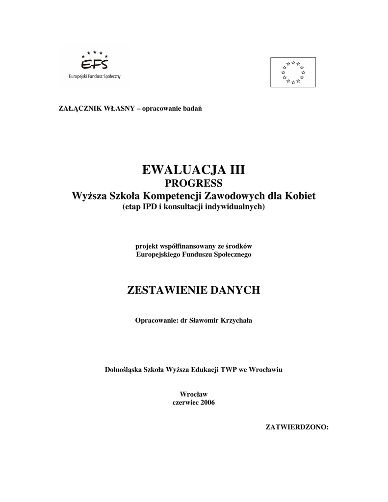 ZAŁĄCZNIK WŁASNY – opracowanie badań EWALUACJA III PROGRESS Wyższa Szkoła Kompetencji Zawodowych dla Kobiet (etap IPD i konsultacji indywidualnych) projekt współfinansowany ze środków Europejskiego Funduszu Społecznego ZESTAWIENIE DANYCH Opracowanie: dr Sławomir Krzychała Dolnośląska Szkoła Wyższa Edukacji TWP we Wrocławiu Wrocław czerwiec 2006 ZATWIERDZONO: 2 1. Uwagi wstępne Trzeci etap ewaluacji projektu PROGRESS „Wyższa Szkoła Kompetencji Zawodowych dla Kobiet” oparty został na indywidualnych ankietach otwartych standaryzowanych złożonych z ośmiu pytań: 1. Jak z perspektywy czasu opisałaby Pani swoje doświadczenia związane z projektem PROGRESS? Jakie zmiany dostrzegła Pani w swoim życiu? Co szczególnie zwróciło Pani uwagę i zainteresowanie w trakcie trwania projektu? 2. Prosimy o ogólną ocenę I etapu projektu, tj. szkoleń (z zakresu psychologii, aktywizacji zawodowej, prawa, przedsiębiorczości z obsługą komputera), ich treści, przebiegu i organizacji. 3. Jakie zagadnienia poruszane na zajęciach okazały się dla Pani przydatne w poszukiwaniu pracy? Jak je Pani wykorzystała? 4. Czego nauczyła się Pani od innych uczestniczek i czy kontakty te zmieniły coś w Pani życiu? 5. Prosimy o ogólną ocenę II etapu projektu, tj. konsultacji indywidualnych (z doradcą zawodu, psychologiem, prawnikiem), ich przebiegu i organizacji. Czy uzyskała Pani oczekiwaną pomoc? W jakim zakresie odpowiadały one Pani potrzebom? 6. Proszę opisać, na ile udało się Pani zrealizować Indywidualny Plan Działania ustalony wcześniej z doradcą zawodu? Na jakie trudności Pani natrafiła i jak udało się Pani je przezwyciężyć? Jakie sukcesy odniosła Pani na tym polu? 7. Jakie konkretne działania związane z pracą zawodową i kształceniem zamierza Pani podjąć w najbliższej przyszłości (np. do końca tego roku)? 8. Czy udział w projekcie zmienił coś w Pani życiu osobistym, w relacjach z najbliższymi, w organizacji i nastawieniu do swojego życia? Uczestniczki udzielały odpowiedzi już po zakończeniu części konsultacyjnej projektu, t.j. po opracowaniu Indywidualnych Planów Działania oraz po konsultacjach indywidualnych. Niniejsze opracowanie danych zostało oparte na 55 wypełnionych przez uczestniczki ankietach. 3 2. Ogólna ocena Projektu PROGRESS Wyniesione z projektu korzyści zostały przez uczestniczki określone w pierwszej kolejności w kategoriach tzw. umiejętności ‘miękkich’, t.j. psychospołecznych predyspozycji pozwalających z większą pewnością i sprawnością radzić sobie z codziennymi sytuacjami, z własnymi emocjami oraz lepiej przygotować się do poszukiwania pracy i przygotowania materiałów aplikacyjnych. Najczęściej pojawia się temat asertywności, którą uczestniczki nauczyły się stosować po szkoleniach w różnorakich sytuacjach związanych z poszukiwaniem pracy oraz z kontaktami z urzędnikami. W dalszej kolejności zmiany dotyczą nowych perspektyw postrzegania własnej osoby, własnych postaw oraz umiejętności zarządzania czasem. Zmiany te łączone są przez osoby badane z wiedzą nabytą w czasie szkoleń, z umiejętnościami wypracowanymi w toku zajęć warsztatowych, z indywidualnymi konsultacjami z psychologami, prawnikami i doradcami zawodu, ze wsparciem otrzymanym od innych kobiet, z wymianą doświadczeń i spostrzeżeń, z przykładem i życzliwością prowadzących, z doświadczeniem dobrej organizacji Projektu PROGRESS, która staje się dla uczestniczek wzorcem i modelem dobrej praktyki organizacji czasu oraz pracy w zespole. Uczestniczki w wieku średnim (po 40 roku życia) mocno podkreślają efekt wyjścia z izolacji gospodarstwa domowego, w którym pełniły role matek i żon. Kobiety te w toku projektu doświadczyły szczególnego przewartościowania perspektyw życiowych i motywowane są do zmiany własnego położenia. Zmiana ta jednak nie jest łatwa, łączy się z wieloma obawami i niepewnością przyszłości, z przeświadczeniem ‘nieprzydatności’ do zmieniającego się rynku pracy, różnego od tego, które respondentki opuściły w swej młodości podejmując funkcje wychowawcze. W tym kontekście nie dziwi, że szczególnie cenne dla tych kobiet były najpierw kontakty z innymi kobietami znajdującymi się w podobnej sytuacji życiowej, a następnie konsultacje indywidualne, w tym również z psychologiem. Młode kobiety, w znacznej mierze studentki oraz osoby wchodzące dopiero na rynek pracy, nie podkreślały problemu łączenia życia rodzinnego i zawodowego. Ich uwaga skupiona była przede wszystkim na nabyciu wiedzy z zakresu prawa i przedsiębiorczości, umiejętności przygotowania autoprezentacji niezbędnej w rozmowach kwalifikacyjnych oraz związanych z pragmatycznym planowaniem kariery zawodowej. Uczestniczki wysoko oceniły zaangażowanie organizatorów, opisywane jako dokładne i konsekwentne przygotowanie całego projektu, jako życzliwa i otwarta postawa względem 4 uczestniczek, jako gotowość do elastycznego reagowania na potrzeby uczestniczek oraz jako wysoka kultura osobista osób prowadzących zajęcia i obsługujących administracyjną część projektu. REKOMENDACJE: W przyszłych edycjach projektu można pomyśleć o warsztatach metodycznego projektowania własnej ścieżki zawodowej oraz o warsztatach psychologicznych, przepracowujących problem łączenia pracy zawodowej oraz organizacji życia rodzinnego (szczególnie dla kobiet wychowujących dzieci). Wybrane wypowiedzi uczestniczek: Bardzo pozytywnie wspominam czas szkoleń i indywidualnych konsultacji. Do tej pory utrzymuję stały kontakt z niektórymi uczestniczkami szkolenia. Zauważyłam, że w wielu sytuacjach, tj. sprawy urzędowe, organizacja czasu pracy, nauki itd. wykorzystuję doświadczenia, umiejętności i wiadomości, które otrzymałam w trakcie szkolenia. Bardzo cenne okazały się dla mnie konsultacje indywidualne, dzięki którym mogłam nakreślić ramy
