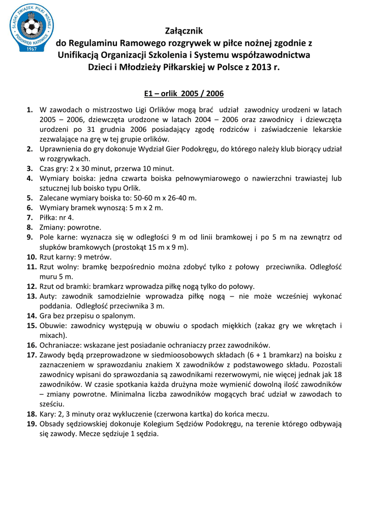 Załącznik do Regulaminu Ramowego rozgrywek w piłce nożnej zgodnie z Unifikacją Organizacji Szkolenia i Systemu współzawodnictwa Dzieci i Młodzieży Piłkarskiej w Polsce z 2013 r. E1 – orlik 2005 / 2006 1. W zawodach o mistrzostwo Ligi Orlików mogą brać udział zawodnicy urodzeni w latach 2005 – 2006, dziewczęta urodzone w latach 2004 – 2006 oraz zawodnicy i dziewczęta urodzeni po 31 grudnia 2006 posiadający zgodę rodziców i zaświadczenie lekarskie zezwalające na grę w tej grupie orlików. 2. Uprawnienia do gry dokonuje Wydział Gier Podokręgu, do którego należy klub biorący udział w rozgrywkach. 3. Czas gry: 2 x 30 minut, przerwa 10 minut. 4. Wymiary boiska: jedna czwarta boiska pełnowymiarowego o nawierzchni trawiastej lub sztucznej lub boisko typu Orlik. 5. Zalecane wymiary boiska to: 50-60 m x 26-40 m. 6. Wymiary bramek wynoszą: 5 m x 2 m. 7. Piłka: nr 4. 8. Zmiany: powrotne. 9. Pole karne: wyznacza się w odległości 9 m od linii bramkowej i po 5 m na zewnątrz od słupków bramkowych (prostokąt 15 m x 9 m). 10. Rzut karny: 9 metrów. 11. Rzut wolny: bramkę bezpośrednio można zdobyć tylko z połowy przeciwnika. Odległość muru 5 m. 12. Rzut od bramki: bramkarz wprowadza piłkę nogą tylko do połowy. 13. Auty: zawodnik samodzielnie wprowadza piłkę nogą – nie może wcześniej wykonać poddania. Odległość przeciwnika 3 m. 14. Gra bez przepisu o spalonym. 15. Obuwie: zawodnicy występują w obuwiu o spodach miękkich (zakaz gry we wkrętach i mixach). 16. Ochraniacze: wskazane jest posiadanie ochraniaczy przez zawodników. 17. Zawody będą przeprowadzone w siedmioosobowych składach (6 + 1 bramkarz) na boisku z zaznaczeniem w sprawozdaniu znakiem X zawodników z podstawowego składu. Pozostali zawodnicy wpisani do sprawozdania są zawodnikami rezerwowymi, nie więcej jednak jak 18 zawodników. W czasie spotkania każda drużyna może wymienić dowolną ilość zawodników – zmiany powrotne. Minimalna liczba zawodników mogących brać udział w zawodach to sześciu. 18. Kary: 2, 3 minuty oraz wykluczenie (czerwona kartka) do końca meczu. 19. Obsady sędziowskiej dokonuje Kolegium Sędziów Podokręgu, na terenie którego odbywają się zawody. Mecze sędziuje 1 sędzia. Załącznik nr 2 do Regulamin Ramowego rozgrywek w piłce nożnej dotyczący awansów i spadków i innych uwarunkowań w sezonie 2015/2016 ORLIKI STARSI – E1 2005 / 2006 1) IV Liga Katowicka Orlików Starszych (E1) – 2005/2006 i młodsi Runda jesienna: 1 miejsce – 7 i 8 miejsce – 8 zespołów, 14 kolejek bez awansu spadek do V ligi Runda wiosenna: 8 zespołów, 14 kolejek 1,2,3,4 miejsce – awans do III ligi Wojewódzkiej Młodzików Młodszych (D2) grupa Katowice - Sosnowiec Spadków brak 2) V Liga Katowicka Orlików Starszych (E1) – 2005/2006 i młodsi Runda jesienna: 1 i 2 miejsce – 7 i 8 miejsce – 8 zespołów, 14 kolejek awans do IV ligi Katowickiej spadek do VI ligi Runda wiosenna: 1,2,3,4 miejsce Spadków brak 8 zespołów, 14 kolejek – awans do IV ligi Katowickiej 2