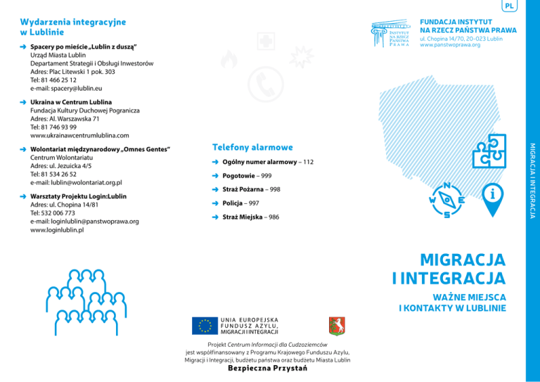 PL Wydarzenia integracyjne w Lublinie Fundacja Instytut na rzecz Państwa Prawa ul. Chopina 14/70, 20-023 Lublin www.panstwoprawa.org pacery po mieście „Lublin z duszą” S Urząd Miasta Lublin Departament Strategii i Obsługi Inwestorów Adres: Plac Litewski 1 pok. 303 Tel: 81 466 25 12 e-mail: [email protected] kraina w Centrum Lublina U Fundacja Kultury Duchowej Pogranicza Adres: Al. Warszawska 71 Tel: 81 746 93 99 www.ukrainawcentrumlublina.com arsztaty Projektu Login:Lublin W Adres: ul. Chopina 14/81 Tel: 532 006 773 e-mail: [email protected] www.loginlublin.pl Telefony alarmowe MIGRACJA I INTEGRACJA olontariat międzynarodowy „Omnes Gentes” W Centrum Wolontariatu Adres: ul. Jezuicka 4/5 Tel: 81 534 26 52 e-mail: [email protected] Ogólny numer alarmowy – 112 Pogotowie – 999 Straż Pożarna – 998 Policja – 997 Straż Miejska – 986 MIGRACJA I INTEGRACJA WAŻNE MIEJSCA I KONTAKTY W LUBLINIE Projekt Centrum Informacji dla Cudzoziemców jest współfinansowany z Programu Krajowego Funduszu Azylu, Migracji i Integracji, budżetu państwa oraz budżetu Miasta Lublin Bezpieczna Przystań Lublin to miasto inspiracji i młodzieży. Jest on domem dla kilku tysięcy obcokrajowców, w tym ponad 6000 studentów. Lublin oferuje wiele możliwości integracji z polskim społeczeństwem. Kursy języka polskiego undacja Instytut F na rzecz Państwa Prawa Аdres: ul. Chopina 14/81 Tel: 532 006 773 e-mail: [email protected] entrum Wolontariatu C Adres: ul. Głęboka 17 Tel: 81 534 26 52 e-mail: [email protected] towarzyszenie Homo Faber S Adres: ul. Bursaki 12 Tel: 81 534 45 13 e-mail: [email protected] undacja Nowy Staw F Adres: ul. Przechodnia 4 Tel: 81 534 61 91 e-mail: [email protected] Ważne Biura ubelski Urząd Wojewódzki L tutaj możesz ubiegać się o wydanie karty pobytu, zarejestrować zaproszenie dla cudzoziemca czy też złożyć dokumenty na otrzymanie obywatelstwa polskiego Adres: ul. Spokojna 4 Tel: 81 742 45 49 e-mail: [email protected] Godziny pracy: pn-pt: 8:00-14:30 iuro Obsługi Mieszkańców B Urzędu Miasta Lublin Adres: ul. Wieniawska 14 tutaj możesz się zameldować czy uzyskać numer PESEL Adres: ul. Leszczyńskiego 20 zarejestrujesz tutaj swoją działalność gospodarczą w CEIDG, wyrobisz prawo jazdy, zarejestrujesz samochód Tel: 81 466 10 00 e-mail: [email protected] Godziny pracy: pn, wt: 7:45-16:45 śr-pt: 7:45-15:45 entrum Wolontariatu C wolontariat, pomoc osobom ubogim, kurs języka polskiego, praca z dziećmi Adres: ul. Jezuicka 4/5 Tel: 81 534 26 52 www.wolontariat.org.pl/lublin iejski Urząd Pracy M tutaj możesz się zarejestrować jako osoba bezrobotna, dowiedzieć się o sytuacji na rynku pracy i znaleźć aktualne oferty pracy, dokonać rejestracji „oświadczenia” Adres: ul. Niecała 14 Tel: 81 466 52 00 e-mail: [email protected] Godziny pracy: pn-pt: 7:45-15:00 undacja F Kultury Duchowej Pogranicza zajęcia artystyczne, praca z dziećmi i młodzieżą, szkolenia, wolontariat Adres: Al. Warszawska 71 Tel: 81 746 93 99 www.fkdp.pl • • iejski Ośrodek Pomocy Rodzinie M tutaj możesz ubiegać się o różnego rodzaju świadczenia: 500+, świadczenia rodzinne i opiekuńcze, pomoc dla osób niepełnosprawnych Adres: ul. Marii Koryznowej 2d e-mail: [email protected] Godziny pracy: pn-pt: 7:30-15:30 Organizacje pozarządowe Lublina undacja Instytut na rzecz Państwa Prawa F bezpłatna pomoc prawna, kurs języka polskiego, szkolenia dla cudzoziemców, program partnerski Adres: ul. Chopina 14/70 Tel: 81 743 68 05 www.panstwoprawa.org towarzyszenie Homo Faber S punkt poradnictwa antydyskryminacyjnego, kurs języka polskiego, spacery po Lublinie Adres: ul. Bursaki 12 Tel: 81 534 45 13 www.hf.org.pl undacja Nowy Staw F promocja wolontariatu, praca z młodzieżą, badania rynku pracy, kurs języka polskiego Adres: ul. Przechodnia 4 Tel: 81 534 61 91 www.eds-fundacja.pl undacja Sempre a Frente F praca z młodzieżą, centrum informacji Erasmus +, wolontariat, nauczanie nieformalne Adres: ul. Grodzka 14 Tel: 690 008 018 www.sempre.org.pl towarzyszenie dla Ziemi S praca z dziećmi i młodzieżą, działania edukacyjne, rozwój wolontariatu Adres: Bratnik 5, 21-132 Kamionka Tel: 81 852 78 76 www.dlaziemi.org