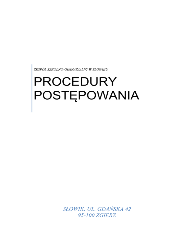 ZESPÓŁ SZKOLNO-GIMNAZJALNY W SŁOWIKU PROCEDURY POSTĘPOWANIA SŁOWIK, UL. GDAŃSKA 42 95-100 ZGIERZ Wybrane procedury postępowania w Zespole Szkolno-Gimnazjalnym w Słowiku §1 Opieka i wychowanie. I. SYTUACJA PROBLEMOWA Rodzice odmawiający współpracy ze szkołą Dziecko uczestnikiem lub ofiarą przemocy domowej, w tym zaniedbywanie (głodne, brudne, nieadekwatnie ubrane, bez przyborów szkolnych, pozbawione opieki, nieleczone) Nieuregulowana sytuacja prawna dziecka Rodzice uzależnieni od alkoholu lub narkotyków lub innych środków psychoaktywnych Rodzina niewydolna wychowawczo, w tym rodzice chorzy psychicznie ZALECANA PROCEDURA: 1. Poinformować pisemnie sąd rodzinny wraz z przekazaniem kompletu dokumentów; powyższe informacje przesłać także do wiadomości właściwego ośrodka pomocy społecznej. 2. Objąć problem pracą „zespołu wychowawczego” (pracownicy szkoły, pracownik socjalny, kurator sądowy jeżeli rodzina objęta jest nadzorem i inni) oraz współpracować z organizacjami specjalistycznymi, w tym pozarządowymi (poradnie, świetlice, ośrodki wsparcia i interwencji kryzysowej); dokumentować pracę. II. SYTUACJA PROBLEMOWA Dziecko odmawia powrotu do domu Pijani rodzice lub opiekunowie w szkole lub brak kontaktu z rodzicami lub opiekunami po zajęciach ZALECANA PROCEDURA 1. Powiadomić dyrekcję szkoły 2. W oparciu o wcześniejszą diagnozę przekazać dziecko osobom uprawnionym (wskazanym wcześniej pisemnie przez rodziców lub opiekunów) 3. Jeżeli nie ma osób uprawnionych przekazać dziecko do całodobowej placówki interwencyjnej (np. pogotowie opiekuńcze; niezależnie od zgody rodziców i dziecka). 4. Poinformować Policję o zaistniałej sytuacji. 1 Wybrane procedury postępowania w Zespole Szkolno-Gimnazjalnym w Słowiku 5. Jeżeli sytuacja nie miała miejsca jednorazowo lub dziecko zostało umieszczone w placówce interwencyjnej, powiadomić pisemnie sąd rodzinny oraz dostarczyć dokumentację z przeprowadzonych działań szkoły III. SYTUACJA PROBLEMOWA Brak informacji o decyzjach instytucji związanych z małoletnim i brak informacji jego sytuacji Udział w grupach destruktywnych (np. sekty, gangi, pseudokibice) ZALECANA PROCEDURA Objąć problem pracą „zespołu wychowawczego” (pracownicy szkoły, pracownik socjalny, kurator sądowy jeżeli rodzina objęta jest nadzorem i inni) oraz współpracować z organizacjami specjalistycznymi, w tym pozarządowymi (poradnie, świetlice, ośrodki wsparcia i interwencji kryzysowej). Pracę dokumentować. IV. SYTUACJA PROBLEMOWA Groźby, sygnały i zachowania samobójcze ZALECANA PROCEDURA 1. Jeżeli dziecko jest obecne w szkole – powiadomić policję (997) oraz w oczekiwaniu na funkcjonariuszy rozpytać osoby mogące mieć wiedzę co do okoliczności sprawy 2. Wezwać rodziców oraz poinformować ich o konieczności zapewnienia dziecku stałej opieki 3. Objąć problem pracą „zespołu wychowawczego”, dokumentować pracę V. SYTUACJA PROBLEMOWA Agresywni wobec pracowników szkoły rodzice lub opiekunowie ZALECANA PROCEDURA 1. Powiadomić Policję (997) lub Straż Miejską (996) 2. Poinformować pisemnie dzielnicowego i sąd rodzinny wraz z przekazaniem kompletu dokumentów; powyższe informacje przesłać do wiadomości właściwego ośrodka pomocy społecznej 2 Wybrane procedury postępowania w Zespole Szkolno-Gimnazjalnym w Słowiku VI. SYTUACJA PROBLEMOWA Niebezpieczne przedmioty i substancje (np. kij bejsbolowy, skalpel, przedmioty przypominające broń palną, rozpylanie gazu itd.) w szkole ZALECANA PROCEDURA: 1. Jeśli substancja lub przedmiot może spowodować powszechne zagrożenie, ewakuować szkołę wg przyjętych procedur 2. Jeżeli substancja lub przedmiot stanowi istotne zagrożenie dla życia lub 3. zdrowia (np. broń) odebrać je; jeżeli odebranie wymaga przeszukania, odizolować dziecko, sprawować nad nim pieczę i wezwać Policję (997); pracownik oświaty nie ma prawa dokonywać przeszukania 4. W uzasadnionych przypadkach wezwać policję, pogotowie ratunkowe(999) lub inne służby specjalistyczne 5. Powiadomić wychowawcę klasy, pedagoga szkolnego, dyrektora szkoły 6. Powiadomić rodziców lub prawnych opiekunów sprawców i ofiar (do czasu przyjazdu rodziców lub Policji pieczę nad dzieckiem sprawuje nauczyciel; po ewentualnym przybyciu policji dostosować się do poleceń funkcjonariuszy). VII. SYTUACJA PROBLEMOWA Konflikt w relacjach nauczyciel – rodzic ZALECONA PROCEDURA: 1. Konflikt między nauczycielem a rodzicem ucznia rozstrzyga wychowawca klasy we współpracy z pedagogiem szkolnym na wniosek nauczyciela lub rodzica w terminie 7 dni od zaistniałej sytuacji. 2. Nauczyciel proponuje rodzicowi spotkanie i powiadamia o nim wychowawcę klasy informując o zaistniałej sytuacji. Wychowawca klasy sporządza notatkę służbową ze spotkania, która pozostaje w jego dokumentacji. 3. W razie długotrwałego, ostrego konfliktu o udział w spotkaniu wyjaśniającym i zamykającym konflikt proszony jest dyrektor szkoły. 4. W przypadku braku porozumienia, każda ze stron ma prawo powołać mediatora, wyłonionego z Rady Pedagogicznej lub Rady Rodziców, lub mediatora zewnętrznego. Mediatorzy informują dyrektora szkoły o terminie spotkania i istocie problemu. Jednocześnie powiadamiają zainteresowane 3 Wybrane procedury postępowania w Zespole Szkolno-Gimnazjalnym w Słowiku strony o terminie spotkania. W spotkaniu uczestniczy również pedagog szkoły, który sporządza notatkę służbową z jego przebiegu. 5. Wynik mediacji ma charakter ostateczny i nie podlega zmianie. 6. W wyjątkowych sytuacjach, nie zadowalających strony rodzic lub nauczyciel ma prawo odwołać się od podjętych decyzji do organu nadzorującego. VIII. SYTUACJA PROBLEMOWA Naruszenie godności osobistej ucznia ZALECONA PROCEDURA: 1. W przypadku uchybienia przez nauczyciela obowiązków wynikających z art. 6 Ustawy Karta Nauczyciela, a w rezultacie naruszenia godności osobistej ucznia, p