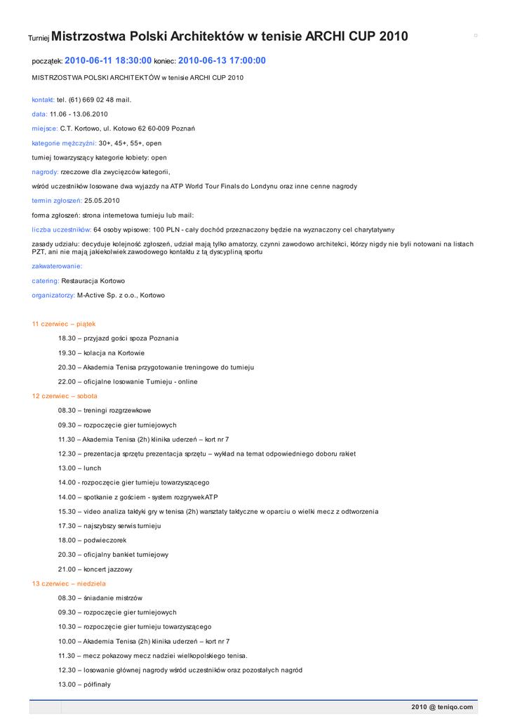 Turniej Mistrzostwa Polski Architektów w tenisie ARCHI CUP 2010 początek: 2010-06-11 18:30:00 koniec: 2010-06-13 17:00:00 MISTRZOSTWA POLSKI ARCHITEKTÓW w tenisie ARCHI CUP 2010 kontakt: tel. (61) 669 02 48 mail. biuro@m-ac tive.pl data: 11.06 - 13.06.2010 miejsc e: C.T. Kortowo, ul. Kotowo 62 60-009 Poznań kategorie mężc zyźni: 30+, 45+, 55+, open turniej towarzysząc y kategorie kobiety: open nagrody: rzec zowe dla zwyc ięzc ów kategorii, wśród uc zestników losowane dwa wyjazdy na ATP World Tour Finals do Londynu oraz inne c enne nagrody termin zgłoszeń: 25.05.2010 forma zgłoszeń: strona internetowa turnieju lub mail: biuro@m-ac tive.pl lic zba uc zestników: 64 osoby wpisowe: 100 PLN - c ały doc hód przeznac zony będzie na wyznac zony c el c harytatywny zasady udziału: dec yduje kolejność zgłoszeń, udział mają tylko amatorzy, c zynni zawodowo arc hitekc i, którzy nigdy nie byli notowani na listac h PZT, ani nie mają jakiekolwiek zawodowego kontaktu z tą dysc ypliną sportu zakwaterowanie: Hotel Kortowo c atering: Restaurac ja Kortowo organizatorzy: M-Ac tive Sp. z o.o., Kortowo 11 c zerwiec – piątek 18.30 – przyjazd gośc i spoza Poznania 19.30 – kolac ja na Kortowie 20.30 – Akademia Tenisa przygotowanie treningowe do turnieju 22.00 – ofic jalne losowanie Turnieju - online 12 c zerwiec – sobota 08.30 – treningi rozgrzewkowe 09.30 – rozpoc zęc ie gier turniejowyc h 11.30 – Akademia Tenisa (2h) klinika uderzeń – kort nr 7 12.30 – prezentac ja sprzętu prezentac ja sprzętu – wykład na temat odpowiedniego doboru rakiet 13.00 – lunc h 14.00 - rozpoc zęc ie gier turnieju towarzysząc ego 14.00 – spotkanie z gośc iem - system rozgrywek ATP 15.30 – video analiza taktyki gry w tenisa (2h) warsztaty taktyc zne w oparc iu o wielki mec z z odtworzenia 17.30 – najszybszy serwis turnieju 18.00 – podwiec zorek 20.30 – ofic jalny bankiet turniejowy 21.00 – konc ert jazzowy 13 c zerwiec – niedziela 08.30 – śniadanie mistrzów 09.30 – rozpoc zęc ie gier turniejowyc h 10.30 – rozpoc zęc ie gier turnieju towarzysząc ego 10.00 – Akademia Tenisa (2h) klinika uderzeń – kort nr 7 11.30 – mec z pokazowy mec z nadziei wielkopolskiego tenisa. 12.30 – losowanie głównej nagrody wśród uc zestników oraz pozostałyc h nagród 13.00 – półfinały 2010 @ teniqo.com 13.30 – Akademia Tenisa (2h) 14.00 – lunc h 15.30 – finały 17.00 – ofic jalne zakońc zenie turnieju sędzia głów ny: Dorota M ilczarek dyrektor turnieju: Krzysztof Wierszyłłowski Kategorie 1. SINGLE MĘŻCZYZN 45+ początek: 2010-06-13 17:00:00 koniec: 2010-06-11 18:30:00 2. SINGLE MĘŻCZYZN 55+ początek: 2010-06-13 17:00:00 koniec: 2010-06-11 18:30:00 3. SINGLE MĘŻCZYZN OPEN początek: 2010-06-13 17:00:00 koniec: 2010-06-11 18:30:00 4. SINGLE KOBIET OPEN początek: 2010-06-13 17:00:00 koniec: 2010-06-11 18:30:00 5. DEBLE MĘŻCZYZN OPEN początek: 2010-06-13 17:00:00 koniec: 2010-06-11 18:30:00 6. Turniej Pocieszenia Panów 45+ 55+ początek: 2010-06-13 17:00:00 koniec: 2010-06-11 18:30:00 7. Turniej Pocieszenia Pań początek: 2010-06-13 17:00:00 koniec: 2010-06-11 18:30:00 8. Turniej Pocieszenia Panów Open początek: 2010-06-13 17:00:00 koniec: 2010-06-11 18:30:00 2010 @ teniqo.com Zaw odnicy zarej estrow ani w turniej u 1. M agdalena 14. Adamczak 2. M agdalena Bartłomiej 27. Brzózka 15. Adamczak Katarzyna Waldemar Górka 28. Buczkowska Jarosław Grzybowski ARCHICUP 3. 4. M ichał 16. M arian 29. Robert Ankiersztajn Buława Gzyl Kortow o KLAN Kortow o M ikołaj 17. Banaś Andrzej 30. Cudniewicz Piotr Haber Art Space 5. 6. Grzegorz 18. Robert Baranowski Drobnik SKT Sopot archicup Andrzej 19. Bartnik Robert 31. Paweł Haberland 32. Drobnik Barbara Jezierska ARCHICUP 7. Oskar 20. Berent 8. 9. 10. Oskar 21. Warszaw a Piotr TUR Gliw ice Piotr Bernaczyk Fischer Kortow o Team ARCHICUP M arysia 23. Wojciech 24. Błaszak 12. Kortow o ARCHICUP 22. Przemysław 25. Borkowicz Piotr 34. Przemysław Borkowicz Krzysztof Jezierski 35. M arek Kędzior 36. Adam Frączek Kochański KKT MOFO Krynica Pro-Ten Katow ice Piotr 37. Wojciech Frączek Kolesiński ARCHICUP PPWK Architekci Bartek 38. Goliszek Wojciech Kolesiński Poznań 13. Krzysztof Jezierski Fischer M arysia 33. Fiedor Berent Bernaczyk 11. Karol ARCHICUP 26. Rafał Gosieniecki 39. Piotr Krawiec Kortow o 2010 @ teniqo.com Zaw odnicy zarej estrow ani w turniej u 40. Tomasz 53. Kurantowicz 41. Roman 54. Litwicki 42. Roman Zbigniew 66. Pyda Śliwa Poznan ARCHICUP Juliusz 67. Reichelt 55. Litwicki Lesław Leszek Katarzyna Tarnawska 68. Rubik M aciej Tomczak ARCHICUP 43. Ewa Kortow o 56. Łapczyński Lesław 69. Rubik Wiesław Vowie Archi Cup 44. 45. Leszek 57. Łapczyński Sakwerda ARCHICUP Prot - ten Katow ice M ałgorzata 58. M ercik 46. Ewa Stanisław 59. M ikołajczak M algorzata 70. Warczak 71. 48. Stanisław Warczak Gliw ice ARCHICUP M aciej 72. Siecla Jacek Wawrzyniak AAB Architekci 60. Ewa M ikołajczak Szczepańska ARCHICUP APA CAD Warszaw a Adam Łukasz Schmidt niezrzeszony 47. Łukasz 61. M yśliwiec Ewa 73. TOM ASZ WILKOWSKI 74. Szczepańska JAROSŁAW WROŃSKI ARCHICUP 49. Janusz 62. Nowakowski Andrzej 75. Szczudlik JAROSŁAW WROŃSKI ARCHICUP 50. 51. M arcin 63. Ochmański Szeliga SKT Sopot Lublin Piotr 64. Olszewski 52. Zbigniew M aciej 76. Tomasz Żabierek M ariusz Szmyd 65. Ewa Organista Śliwa Kortow o SKF Studio 2010 @ teniqo.com Turniej Mistrzostwa Polski Arc hitektów w tenisie ARCHI CUP 2010 SINGLE MĘŻCZYZN 45+ drabinka 16 l.p. rank runda 1 1. 2. A. Bartnik bye 3. 4. S. Mikołajc zak M. Buława 5. 6. Z. Pyda R. Litwic ki 7. 8. A. Koc hański W. Vowie 9. 10. R. Gzyl P. Borkowic z 11. 12. J. Wawrzyniak R. Drobnik 13. 14. M. Organista K. Jezierski 15. 16. J. WROŃSKI M. Oc hmański ć wierć -finał A. Bartnik v/o M. Buława 6:0 6:1 Z. Pyda 6:1 6:1 A. Koc hański 6:1 6:2 R. Gzyl 6:4 6:2 R. Drobnik 6:2 6:4 M. Organista 6:4 3:6 10:8 M. Oc hmański 6:1 6:2 pół-finał finał zwyc