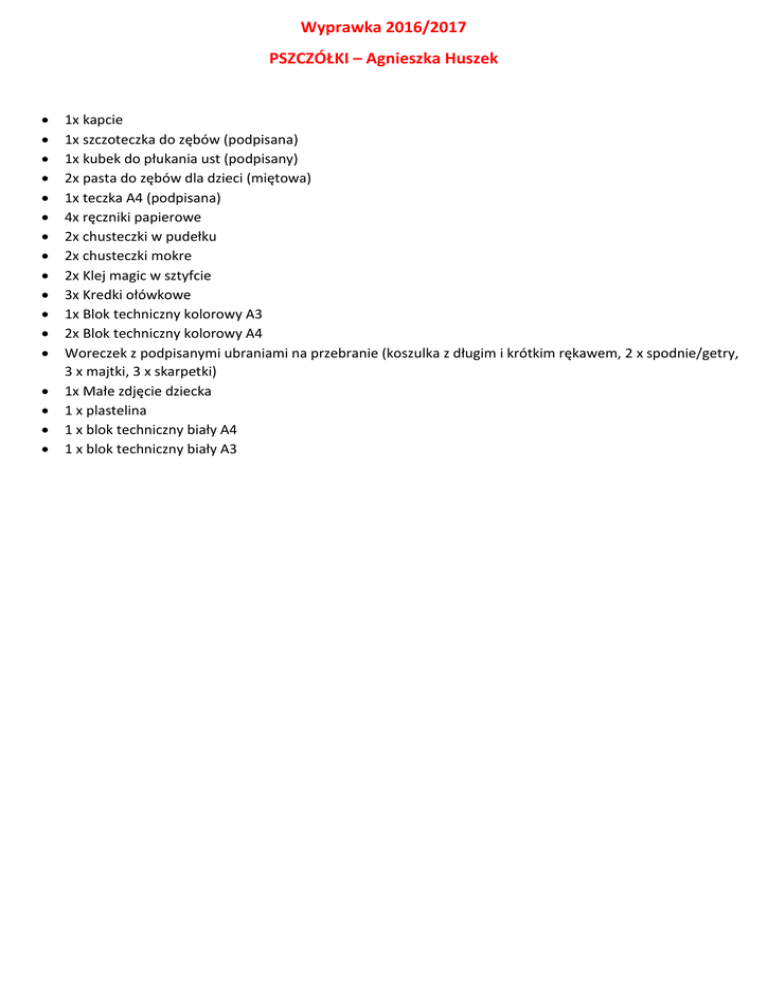 Wyprawka 2016/2017 PSZCZÓŁKI – Agnieszka Huszek 1x kapcie 1x szczoteczka do zębów (podpisana) 1x kubek do płukania ust (podpisany) 2x pasta do zębów dla dzieci (miętowa) 1x teczka A4 (podpisana) 4x ręczniki papierowe 2x chusteczki w pudełku 2x chusteczki mokre 2x Klej magic w sztyfcie 3x Kredki ołówkowe 1x Blok techniczny kolorowy A3 2x Blok techniczny kolorowy A4 Woreczek z podpisanymi ubraniami na przebranie (koszulka z długim i krótkim rękawem, 2 x spodnie/getry, 3 x majtki, 3 x skarpetki) 1x Małe zdjęcie dziecka 1 x plastelina 1 x blok techniczny biały A4 1 x blok techniczny biały A3