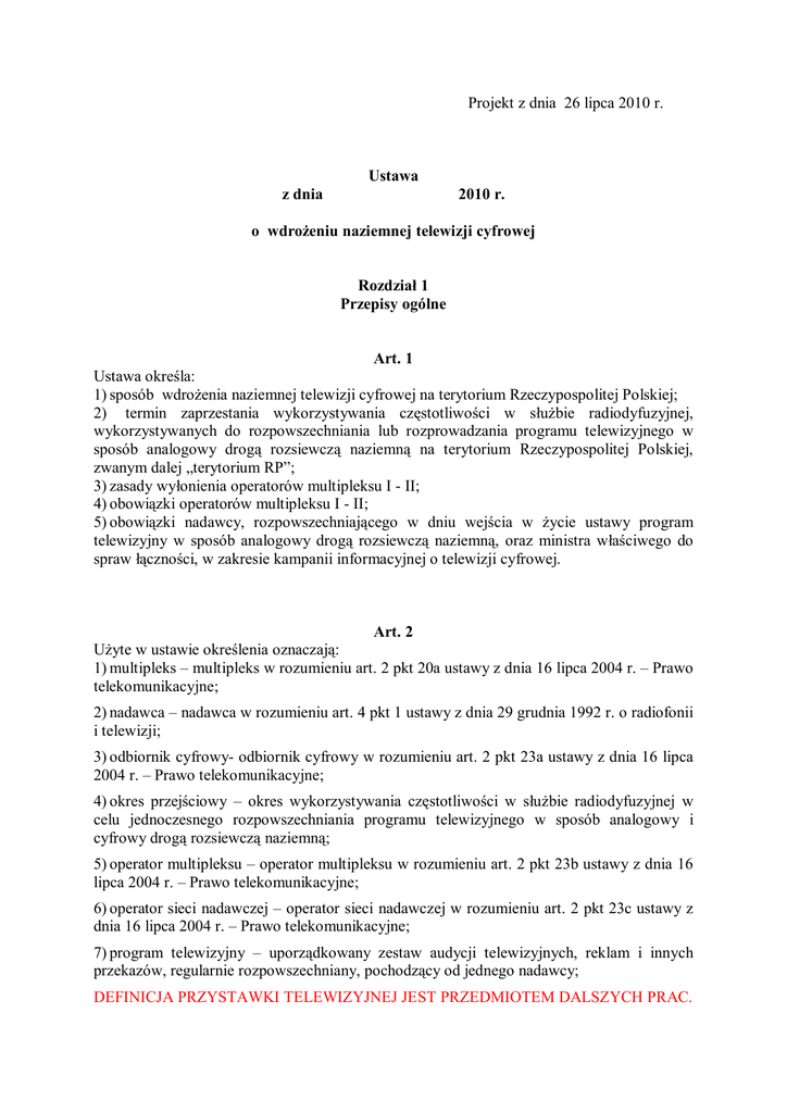 Projekt z dnia 26 lipca 2010 r. Ustawa z dnia 2010 r. o wdrożeniu naziemnej telewizji cyfrowej Rozdział 1 Przepisy ogólne Art. 1 Ustawa określa: 1) sposób wdrożenia naziemnej telewizji cyfrowej na terytorium Rzeczypospolitej Polskiej; 2) termin zaprzestania wykorzystywania częstotliwości w służbie radiodyfuzyjnej, wykorzystywanych do rozpowszechniania lub rozprowadzania programu telewizyjnego w sposób analogowy drogą rozsiewczą naziemną na terytorium Rzeczypospolitej Polskiej, zwanym dalej „terytorium RP”; 3) zasady wyłonienia operatorów multipleksu I - II; 4) obowiązki operatorów multipleksu I - II; 5) obowiązki nadawcy, rozpowszechniającego w dniu wejścia w życie ustawy program telewizyjny w sposób analogowy drogą rozsiewczą naziemną, oraz ministra właściwego do spraw łączności, w zakresie kampanii informacyjnej o telewizji cyfrowej. Art. 2 Użyte w ustawie określenia oznaczają: 1) multipleks – multipleks w rozumieniu art. 2 pkt 20a ustawy z dnia 16 lipca 2004 r. – Prawo telekomunikacyjne; 2) nadawca – nadawca w rozumieniu art. 4 pkt 1 ustawy z dnia 29 grudnia 1992 r. o radiofonii i telewizji; 3) odbiornik cyfrowy- odbiornik cyfrowy w rozumieniu art. 2 pkt 23a ustawy z dnia 16 lipca 2004 r. – Prawo telekomunikacyjne; 4) okres przejściowy – okres wykorzystywania częstotliwości w służbie radiodyfuzyjnej w celu jednoczesnego rozpowszechniania programu telewizyjnego w sposób analogowy i cyfrowy drogą rozsiewczą naziemną; 5) operator multipleksu – operator multipleksu w rozumieniu art. 2 pkt 23b ustawy z dnia 16 lipca 2004 r. – Prawo telekomunikacyjne; 6) operator sieci nadawczej – operator sieci nadawczej w rozumieniu art. 2 pkt 23c ustawy z dnia 16 lipca 2004 r. – Prawo telekomunikacyjne; 7) program telewizyjny – uporządkowany zestaw audycji telewizyjnych, reklam i innych przekazów, regularnie rozpowszechniany, pochodzący od jednego nadawcy; DEFINICJA PRZYSTAWKI TELEWIZYJNEJ JEST PRZEDMIOTEM DALSZYCH PRAC. 8) przystawka telewizyjna – urządzenie konsumenckie służące do odbioru cyfrowych naziemnych transmisji telewizyjnych, zawierające co najmniej tuner (obejmujący głowicę wysokiej częstotliwości i demodulator), demultiplekser i dekodery odbieranych usług, niezawierające wyświetlacza obrazu; 9) sygnał multipleksu – sygnał multipleksu w rozumieniu art. 2 pkt 38a ustawy z dnia 16 lipca 2004 r. – Prawo telekomunikacyjne; 10) użytkownik - osoba, która posiada odbiornik cyfrowy w stanie umożliwiającym natychmiastowy odbiór programu telewizyjnego. Art. 3 Nadawanie lub reemitowanie programu telewizyjnego w sposób cyfrowy drogą rozsiewczą naziemną, który uprzednio był nadawany w sposób analogowy drogą rozsiewczą naziemną, nie stanowi odrębnego pola eksploatacji w rozumieniu art. 50 ustawy z dnia 4 lutego 1994 r. o prawie autorskim i prawach pokrewnych (Dz. U. z 2006 r. Nr 90, poz. 631 z późn. zm.1). Art. 4 1.Telewizja Polska S.A, rozpowszechniająca w dniu wejścia w życie ustawy program telewizyjny TVP1, TVP2 oraz regionalne programy telewizyjne w sposób analogowy drogą rozsiewczą naziemną, a także nadawca rozpowszechniający w dniu wejścia w życie ustawy program Polsat, TVN, TV4, TV Puls w sposób analogowy drogą rozsiewczą naziemną, obowiązany jest zaprzestać wykorzystywania częstotliwości w służbie radiodyfuzyjnej do tego wykorzystywanych w terminie nie później niż 31 lipca 2013 r., z zastrzeżeniem ust. 2. 2. Nadawca, rozpowszechniający w dniu wejścia w życie ustawy program, o którym mowa w ust. 1, obowiązany jest zaprzestać wykorzystywania częstotliwości w służbie radiodyfuzyjnej do tego wykorzystywanych w terminie zakończenia okresu przejściowego, jeżeli termin ten został określony w decyzji Prezesa Urzędu Komunikacji Elektronicznej, zwanego dalej „Prezesem UKE”, o której mowa w art. 10. 3. Termin zakończenia okresu przejściowego nie może być późniejszy niż 31 lipca 2013 r. 4. Minister właściwy do spraw łączności oraz Prezes UKE ogłaszają informacje o terminach , o których mowa w ust. 1 i 2, na stronie podmiotowej Biuletynu Informacji Publicznej odpowiednio Ministerstwa Infrastruktury oraz Urzędu Komunikacji Elektronicznej. PRZEPISY ART. 5 I 6 W ZAKRESIE PRZYSTAWEK TELEWIZYJNYCH SĄ PRZEDMIOTEM DALSZYCH PRAC. Art. 5 1. Operator multipleksu II , na własny koszt przekazuje osobie: 1) odbierającej, w dniu wejścia w życie ustawy, wyłącznie program telewizyjny rozpowszechniany w sygnale niekodowanym w sposób analogowy drogą rozsiewczą naziemną oraz 2) zwolnionej od opłat abonamentowych na podstawie art. 4 ust. 1 pkt 1, 3 – 6, 7 lit. a i b ustawy z dnia 21 kwietnia 2005 r. o opłatach abonamentowych (Dz. U. Nr 85, poz. 728 z późn. zm.), 1 Zmiany tekstu jednolitego wymienionej ustawy zostały ogłoszone w Dz. U. z 2006 r. Nr 94, poz. 658 i Nr 121, poz. 843, z 2007 r. Nr 99, poz. 662 i Nr 181, poz. 1293 oraz z 2009 r. Nr 157, poz. 1241. 2 2) spełniającej kryteria dochodowe do korzystania ze świadczeń pieniężnych z tytułu ustawy z dnia 12 marca 2004 r. o pomocy społecznej (Dz. U. z 2009 r. Nr , 175, poz. 1362, z późn. zm.), przystawkę telewizyjną umożliwiającą dalszy bezpłatny odbiór programów Polsat, TVN, TV4, TV Puls w sposób cyfrowy drogą rozsiewczą naziemną. 2. Przystawka telewizyjna powinna mieć techniczną możliwość odbioru wszystkich programów nadawanych w sposób cyfrowy drogą rozsiewczą naziemną na terytorium RP. 3. Obowiązek, o którym mowa w ust. 1, wygasa z dniem 31 lipca 2013 roku. 1. 2. 3. 4. Art. 6 Osoba, o której mowa w art. 4 ust. 1, w celu realizacji uprawnienia do bezpłatnego otrzymania przystawki telewizyjnej występuje z wnioskiem do operatora multipleksu, o którym mowa w art. 4 ust. 1. Do wniosku, o którym mowa w ust. 1 dołącza się oświadczenie o spełnianiu warunków do korzystania ze zwolnienia, o którym mowa w art. 4 ust. 1 pkt 2 i przedstawia dokumenty potwie