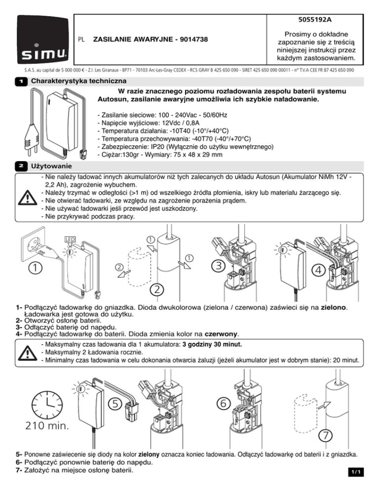5055192A PL Prosimy o dok"adne zapoznanie si! z treÊcià niniejszej instrukcji przez ka×dym zastosowaniem. ZASILANIE AWARYJNE - 9014738 S.A.S. au capital de 5 000 000 € - Z.I. Les Giranaux - BP71 - 70103 Arc-Les-Gray CEDEX - RCS GRAY B 425 650 090 - SIRET 425 650 090 00011 - n° T.V.A CEE FR 87 425 650 090 1 Charakterystyka techniczna W razie znacznego poziomu roz!adowania zespo!u baterii systemu Autosun, zasilanie awaryjne umo×liwia ich szybkie na!adowanie. - Zasilanie sieciowe: 100 - 240Vac - 50/60Hz - Napi!cie wyjÊciowe: 12Vdc / 0,8A - Temperatura dzia"ania: -10T40 (-10°/+40°C) - Temperatura przechowywania: -40T70 (-40°/+70°C) - Zabezpieczenie: IP20 (Wy"àcznie do u×ytku wewn!trznego) - Ci!×ar:130gr - Wymiary: 75 x 48 x 29 mm 2 U×ytowanie - Nie nale×y "adowa# innych akumulatorów ni× tych zalecanych do uk"adu Autosun (Akumulator NiMh 12V 2,2 Ah), zagro×enie wybuchem. - Nale×y trzyma# w odleg"oÊci (>1 m) od wszelkiego êród"a p"omienia, iskry lub materia"u ×arzàcego si!. - Nie otwiera# "adowarki, ze wzgl!du na zagro×enie pora×enia pràdem. - Nie u×ywa# "adowarki jeÊli przewód jest uszkodzony. - Nie przykrywa# podczas pracy. 1 LED 1 1 2 3 4 2 1- Pod"àczy# "adowark! do gniazdka. Dioda dwukolorowa (zielona / czerwona) zaÊwieci si! na zielono. $adowarka jest gotowa do u×ytku. 2- Otworzy# os"on! baterii. 3- Od"àczy# bateri! od nap!du. 4- Pod"àczy# "adowark! do baterii. Dioda zmienia kolor na czerwony. - Maksymalny czas "adowania dla 1 akumulatora: 3 godziny 30 minut. - Maksymalny 2 $adowania rocznie. - Minimalny czas "adowania w celu dokonania otwarcia ×aluzji (je×eli akumulator jest w dobrym stanie): 20 minut. 5 210 min. 6 7 5- Ponowne zaÊwiecenie si! diody na kolor zielony oznacza koniec "adowania. Od"àczy# "adowark! od baterii i z gniazdka. 6- Pod"àczy# ponownie bateri! do nap!du. 7- Za"o×y# na miejsce os"on! baterii. 1/1