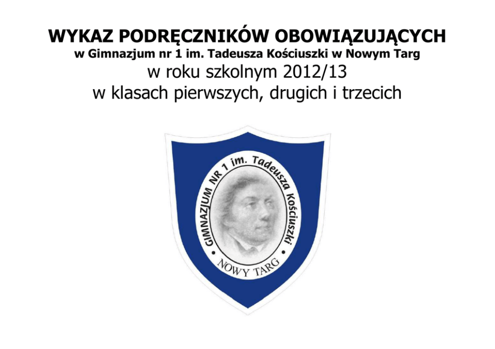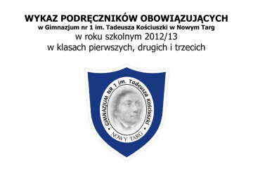 WYKAZ PODRĘCZNIKÓW OBOWIĄZUJĄCYCH w Gimnazjum nr 1 im. Tadeusza Kościuszki w Nowym Targ w roku szkolnym 2012/13 w klasach pierwszych, drugich i trzecich ZAJĘCIA EDUKACYJNE Język polski TYTUŁ I AUTOR A. Łuczak, E. Prylińska, R. Maszka, "Między nami"- podręcznik do gimnazjum – do klas: I, II, III, WYDAWNICTWO GWO oraz zeszyt ćwiczeń 1 i 2 Matematyka Historia WOS Geografia Biologia Chemia Fizyka "Matematyka z plusem", M. Jucewicz, M. Karpińskipodręcznik do gimnazjum – do klas: I, II, III "Śladami przeszłości" , S. Roszak, Anna Łaszkiewicz -podręcznik do historii dla klas: I, II, III gimnazjum, w klasie II dodatkowo ćwiczenia Klasa I – nie ma takich zajęć Klasa II - KOSS Podstawowy” A. Pacewicz i T. Merta podręcznik + ćwiczenia Klas III- „KOSS Podstawowy” A. Pacewicz cz.2 podręcznik + ćwiczenia "Świat bez tajemnic, J. Kop, M. Kucharska, A. WitekNowakowska ", podręcznik dla klas: I, II, III „Puls życia 1” M. Jefimow - klasa I „Puls życia 2” M Jafimow - klasa II „Puls życia 3” , Beata Sagin, Marian Sęktas -klasa III "Chemia Nowej Ery", J. Kulawiak, T. Kulawiak, M. Litwin – podręcznik dla klas: I, II, III "Świat fizyki" część 1, Barbara Sagnowska – klasa I, "Świat fizyki" część 2, Barbara Sagnowska – klasa II "Świat fizyki" część 3 i 4 Barbara Sagnowska- klasa III Religia „Jezus drogą, prawdą i życiem”, P.de la Herman, J.Próchniewicz, część 1 -klasa I, część 2- klasa II, część 3- klasa III Edukacja dla W klasie III-„Żyję i działam bezpiecznie”, Jarosław Słoma, GWO Nowa Era CEO CIVITAS Wydawnictwo Szkolne PWN Nowa Era Nowa Era Zam Kor Apostolicum i Wydawnictwo Piotra i Pawła Nowa Era NUMER DOPUSZCZENIA Klasa I 63/1/2009 Klasa II 63/2/2010 Klasa III 63/3/2011 Klasa I 168/1/2009 Klasa II 168/2/2010 Klasa III 168/3/2011 Klasa I 60/1/2009 klasa II 60/2/2010 Klasa III 60/1/2011 Klasa II 277/1/2010 Klasa III 277/2/2011 Klasa II 144/1/2009 Klasa II 144/2/2009 Klasa III 144/3/2010 Klasa I 58/1/2009 Klasa II 58/1/2009 Klasa III 58/3/2010 Klasa I 49/1/2009 Klasa II 49/2/2010 Klasa III 49/3/2010 Klasa I 11/3/2010 klasa II 11/2/2010 klasa III 11/3/2010 Klasa I Az-31-02/10/0 klasa II Az 32-02/10/0 klasa III Az-33-02/10/0 17/2009 bezpieczeństwa Muzyka Plastyka Język angielski Język niemiecki Grzegorz Zając W klasie I – „Muzyczny świat”, T. Wójcik W klasie I -"Bliżej Sztuki", Stanisław K.Stopczyk Podręcznik i zeszyt ćwiczeń „New Exam Conections 2”, Diana Pye, Joanna SpencerKępczyńska, Tony Garside – klasa I, „New Exam Conections 3” – klsa II, „New Exam Conections 4” – klsa III, „Das ist Deutsch KOMPACT“ cz. 1, Jolanta Kamińska (podręcznik z ćwiczeniami w jednym wydaniu)- klasa I, „Das ist Deutsch KOMPACT“ cz. 2 – klasa II, „Das ist Deutsch Repetytorium“ cz. 3- klasa III 138/2009 MAC Edukacja Wydawnictwa Szkolne i 68/2009 Pedagogiczne Klasa I - 259/2/2011/z1 Oxford Uniwersity Press Klasa II -259/3/2011/z1 Polska sp.z o.o. Klasa III – 259/4/2011 Klasa I – 341/1/2011 Nowa Era Klasa II – 341/2/2012 Klasa III – 22/4/2011