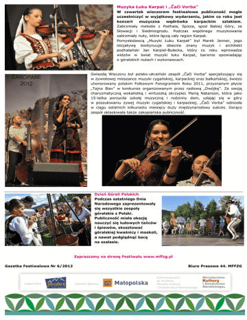 Muzyka Łuku Karpat i „Čači Vorba” W czwartek wieczorem festiwalowa publiczność mogła uczestniczyć w wyjątkowy wydarzeniu, jakim co roku jest koncert muzyczna wędrówka karpackim szlakiem. Zabrzmiały melodie z Podhala, Spisza, spod Babiej Góry, ze Słowacji i Siedmiogrodu. Podczas wspólnego muzykowania zabrzmiały nuty, które łączą cały region Karpat. Pomysłodawcą „Muzyki Łuku Karpat” był Marek Jenner, jego inicjatywę kontynuuje obecnie znany muzyk i architekt podhalański Jan Karpiel-Bułecka, który co roku wprowadza widzów w świat muzyki łuku Karpat, barwnie opowiadając o góralskich nutach i wykonawcach. Gwiazdą Wieczoru był polsko-ukraiński zespół „Čači Vorba” specjalizujący się w żywiołowej mieszance muzyki cygańskiej, karpackiej oraz bałkańskiej, świeżo uhonorowany polskim Folkowym Fonogramem Roku 2011, przyznanym płycie „Tajno Biav” w konkursie organizowanym przez radiową „Dwójkę”. Ze swoją charyzmatyczną wokalistką i wirtuozką skrzypiec Marią Natanson, która jako 15-latka porzuciła szkołę muzyczną i rodzinny dom, udając się w góry w poszukiwaniu żywej muzyki cygańskiej i karpackiej, „Čači Vorba” odniosła w ciągu ostatnich kilkunastu miesięcy duży międzynarodowy sukces. Gorąco zespół oklaskiwała także zakopiańska publiczność. Dzień Górali Polskich Podczas ostatniego Dnia Narodowego zaprezentowały się wszystkie zespoły góralskie z Polski. Publiczność miała okazję nauczyć się ludowych tańców i śpiewów, skosztować góralskiej kwaśnicy i moskoli, a nawet podglądnąć bacę na szałasie. Zapraszamy na stronę Festiwalu www.mffzg.pl Gazetka Festiwalowa Nr 6/2012 Biuro Prasowe 44. MFFZG
