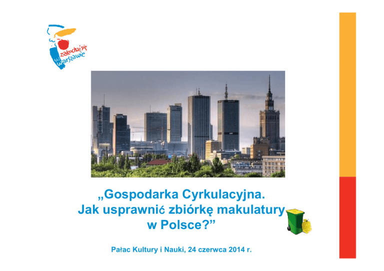 „Gospodarka Cyrkulacyjna. Jak usprawnić ć zbiórkę makulatury w Polsce?” Pał łac Kultury i Nauki, 24 czerwca 2014 r. Warszawa, 6.04.2010 r. Nowy system gospodarowania odpadami komunalnymi Od 1 lipca 2013 r. podmiotem odpowiedzialnym za odbiór odpadów komunalnych od mieszkańców i przedsiębiorców jest miasto stołeczne Warszawa. Dotychczas funkcjonujący system wymagał modyfikacji, gdyż nie w pełni realizował cele, jakie Polska chciała osiągnąć w związku z akcesją do Unii Europejskiej. Do tej pory ponad 80% odpadów komunalnych po rozdrobnieniu trafiało na wysypiska. Działania warszawskiego samorządu są nastawione nie tylko na ograniczenie ilości odpadów trafiających na składowiska, ale również na wyeliminowanie tak zwanego dekodowania, czyli zmieniania kodów odpadów przez firmy je odbierające w taki sposób, aby możliwe było ich tanie składowanie, często w miejscach do tego nie przeznaczonych. Warszawa, 6.04.2010 r. Cel funkcjonowania nowego systemu • Uszczelnienie systemu - koszty zapłaci 100% wytwórców, • Spełnienie celów ekologicznych, • Rynek regulowany, oferty przetargowe, warunki określone przez miasto, • Oferowane ceny pokrywają realne koszty odbioru i zagospodarowywania odpadów, • Kontrolowane przez miasto sposoby zagospodarowywania odpadów, • Odpady w sortowniach, kompostowniach, instalacjach termicznego przekształcania odpadów, • Kierowanie środków inwestycyjnych na nowe instalacje, • Ustabilizowane odpady komunalne, po procesach technologicznych kierowane na składowiska. Warszawa, 6.04.2010 r. Odbiór odpadów komunalnych Firmy z którymi m.st. Warszawa podpisało umowy na odbiór odpadów to: • Miejskie Przedsiębiorstwo Oczyszczania Sp. z o.o.; • PPHU LEKARO; • SITA Polska Sp. z o.o.; Umowy obowiązują przez trzy lata (do 2017 r.) Warszawa, 6.04.2010 r. Etapy wdrażania nowego systemu Od 1 lutego 2014 r. nowy system gospodarowania odpadami komunalnymi został wprowadzony w 8 dzielnicach m.st. Warszawy. Warszawa, 6.04.2010 r. System zbierania odpadów komunalnych po 1 sierpnia 2014 r. Od 1 sierpnia br. nowy system gospodarowania odpadami komunalnymi wejdzie w pozostałych 10 dzielnicach m.st. Warszawy (Białołęka, Bemowo, Bielany, Mokotów, Ochota, Targówek, Ursus, Włochy, Wola oraz Żoliborz). Swoim zasięgiem będzie obejmowałł teren całego m.st. Warszawy. Warszawa, 6.04.2010 r. Selektywna zbiórka odpadów komunalnych w Warszawie Nowy system zakłada zbiórkę: • • • łącznie: papieru i tektury, tworzyw sztucznych, metali oraz opakowań wielomateriałowych, oznaczonych jako odpady „segregowane suche”; selektywnie zebranych odpadów opakowaniowych ze szkła, oznaczonych jako „szkłło opakowaniowe”; niesegregowanych zmieszanych odpadów komunalnych, oznaczonych jako „odpady zmieszane”. Warszawa, 6.04.2010 r. Minimalne częstotliwości odbioru Zasady odbierania odpadów komunalnych: a) zabudowa jednorodzinna: • odpady zmieszane (odpadki kuchenne etc.): co najmniej raz na dwa tygodnie, • odpady segregowane – suche (papier, karton, plastik, kartony po sokach i mleku etc.): co najmniej raz na cztery tygodnie, • szkło: co najmniej raz na cztery tygodnie; b) zabudowa wielorodzinna: • odpady zmieszane: co najmniej dwa razy w tygodniu; • odpady segregowane – suche: co najmniej raz na tydzień; • szkło: co najmniej raz na cztery tygodnie. Odpady zielone (m.in. liście) odbierane są, od maja do listopada, w każdym tygodniu danego miesiąca od soboty do poniedziałku. Kampania informacyjna Z początkiem maja br. rozpoczęła się kampania informująca o podstawowych zasadach nowego systemu. Obejmuje ona m.in.: - ogłoszenia w prasie; - spoty radiowe; - ekrany w środkach komunikacji miejskiej. Od czerwca br. m.in. we współpracy z Urzędami Dzielnic dystrybuowany jest plakat odnośnie do ogólnych zasad systemu. W sierpniu br. zostanie wydana broszura o nowym systemie gospodarowania odpadami komunalnymi informująca wszystkich mieszkańców o zasadach systemu Warszawa, 6.04.2010 r. Wewnę ętrzna kampania promują ąca segregację ę odpadów Zaangażżowanie pracowników Urzę ędu m.st. Warszawy Specjalne pojemniki do selektywnej zbiórki odpadów. Z dużym zainteresowaniem pracowników stołecznego ratusza, spotkała się inicjatywa segregowania odpadów na terenie Urzędu. W połowie grudnia 2013 r. pojawiło się 57 dodatkowych pojemników (w podziale na frakcje suchą (pojemnik czerwony) oraz szkło (pojemnik zielony). Warszawa, 6.04.2010 r. W 27 lokalizacjach znajduje się 163 takich dwukomorowych pojemników na segregowanie odpadów komunalnych. Kampania edukacyjna Warszawskie Dni Recyklingu Dni Recyklingu to cykliczna impreza organizowana we współpracy z firmami odbierającymi odpady. Jej celem jest szerzenie zachowań przyjaznych środowisku oraz promowanie wśród warszawiaków recyklingu jako szansy na rozsądne gospodarowanie ograniczonymi zasobami naturalnymi Ziemi. W tym roku impreza odbędzie się w dniach 6-7 września br. Najpierw odbędzie się zbiórka odpadów segregowanych w dzielnicach. Następnego dnia w parku Agrykola przy ul. Myśliwieckiej będzie zorganizowany piknik rodzinny. Warszawa, 6.04.2010 r. Platforma 19 115 – bieżąca obsłługa zgłoszeń i reklamacji oraz podjętych interwencji „Warszawa 19115” to nowoczesny system komunikacji z mieszkańcami i pierwszy na taką skalę projekt w Polsce. Usprawnia on i upraszcza komunikację pomiędzy administracją i mieszkańcami. Usługi są dostępne 24 godziny na dobę przez 7 dni w tygodniu. Do dyspozycji mieszkańców czeka zespół 75 konsultantów Od uruchomienia systemu w listopadzie ub. r., do centrum wpłynęło ponad 180 tys. zgłoszeń. Dziennie konsultanci przyjmują ok. 850 próśb o informację lub interwencję. W ramach systemu przyjmowanie są zgłoszenia dotyczące odbioru odpadów komunalnych. Następnie są one przekazywane do firm odbierających odpady w celu 