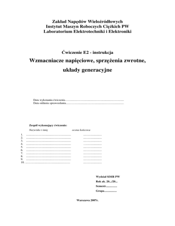 Zakład Napędów Wieloźródłowych Instytut Maszyn Roboczych CięŜkich PW Laboratorium Elektrotechniki i Elektroniki Ćwiczenie E2 - instrukcja Wzmacniacze napięciowe, sprzęŜenia zwrotne, układy generacyjne Data wykonania ćwiczenia................................................................................ Data oddania sprawozdania............................................................................... Zespół wykonujący ćwiczenie: Nazwisko i imię 1. ............................................................. 2. ............................................................. 3. ............................................................. 4. ............................................................. 5. ............................................................. 6. ............................................................. 7. ............................................................. 8. ............................................................. 9. ............................................................. 10. ............................................................. ocena końcowa ......................... ......................... ......................... …..................... ......................... ......................... ......................... ......................... ......................... ......................... Wydział SiMR PW Rok ak. 20.../20... Semestr............... Grupa................. Warszawa 2007r. Spis treści 1. CEL I ZAKRES ĆWICZENIA. .......................................................................................................................3 2. WIADOMOŚCI TEORETYCZNE: WZMACNIACZE, SPRZĘśENIE ZWROTNE ...................................3 2.1 WZMACNIACZE. ...........................................................................................................................3 2.2 SPRZĘśENIE ZWROTNE............................................................................................................... 7 3.WIADOMOŚCI TEORETYCZNE: UKŁADY GENERACYJNE Z DODATNIM SPRZĘśENIEM ZWROTNYM ......................................................................................................................................... 7 3.1 Warunek generacji drgań. .......................................................................................................................7 3.2. Interpretacja geometryczna amplitudowego warunku generacji. ...........................................................8 3.3. Bilans energetyczny w układzie generacyjnym. ....................................................................................9 3.4. Podstawowe rodzaje generatorów. .........................................................................................................9 3.5. Drgania w układach mechanicznych....................................................................................................10 3.6. Zasady odwzorowania elektromechanicznego. ....................................................................................11 4. LITERATURA POMOCNICZA....................................................................................................................13 1. Cel i zakres ćwiczenia. Ćwiczenie ma na celu poznanie podstawowych układów wzmacniających prądu przemiennego, charakterystyk tych układów oraz ich zastosowania. PrzybliŜy ono równieŜ podstawową analizę ujemnego sprzęŜenia zwrotnego i jego wpływu na pracę wzmacniacza oraz umoŜliwi: - poznanie zasad generacji drgań w układzie z zewnętrzną pętlą sprzęŜenia zwrotnego, - stwierdzenie roli zespolonego warunku generacji w procesie wzbudzania się układów spręŜysto – bezwładnościowych niedotłumionych. 2. Wiadomości teoretyczne - wzmacniacze, sprzęŜenie zwrotne. 2.1 Wzmacniacze elektryczne. Wzmacniaczem elektrycznym nazywa się układ, w którym sygnał wejściowy w postaci napięcia u1 lub prądu i1 o małej mocy p1 powoduje powstanie na jego wyjściu sygnału u 2 = k u u1 ; i2 = k1i1 o znacznie większej mocy p 2 = k p p1 . Wzmocnienie to uzyskuje się kosztem mocy doprowadzonej z zewnętrznego źródła zasilającego wzmacniacz. Współczynniki ku, ki, kp nazywają się współczynnikami wzmocnienia. Wzmacniacze dzielą się na: napięciowe, prądowe i mocy (zarówno prądu stałego jak i przemiennego). Te ostatnie, w zaleŜności od zakresu wzmacnianych częstotliwości, dzielą się na: akustyczne, szerokopasmowe i selektywne. Podstawowe charakterystyki wzmacniacza prądu przemiennego zdefiniowane są przy załoŜeniu, Ŝe sygnał wejściowy ma charakter sinusoidalny. Rys. 1. Podstawowy schemat wzmacniacza sterowanego napięciem sinusoidalnym Charakterystyką dynamiczną wzmacniacza napięciowego nazywa się zaleŜność wartości napięcia wyjściowego u2 do napięcia wejściowego u1. Charakterystyka ta powinna być liniowa, lub wykorzystywana w zakresie liniowym, to jest gdy wartość współczynnika wzmocnienia ku pozostaje stała. ZaleŜność współczynnika wzmocnienia od częstotliwości sygnału wejściowego ku = f(f) nazywa się charakterystyką częstotliwościową wzmacniacza. ku U1 0 0 f U2 Rys. 2. Ch-ka dynamiczna Ch-ki częstotliwościowe pasmowa, selektywnarezonansowa 4 We wszystkich rodzajach wzmacniaczy wykorzystuje się zdolność złącz p-n-p lub n-p-n, o odpowiednio spolaryzowanych elektrodach, do wzmacniania prądu lub napięcia. Jako element trójelektrodowy tranzystor moŜe pracować wykorzystując jedną z nich jako wspólną w układzie czwórnika. Istnieją trzy konfiguracje pracy tranzystora, noszące nazwy: wspólna baza –OB., wspólny emiter -OE, wspólny kolektor -OC. W kaŜdej z tych konfiguracji tranzystor wykazuje odmienne właściwości i parametry. Ze względu na moŜliwości wzmocnienia projektuje się wzmacniacze jedno i wielostopniowe o charakterze sprzęŜenia poszczególnych stopni: rezystancyjno pojemnościowym, transformatorowym, d