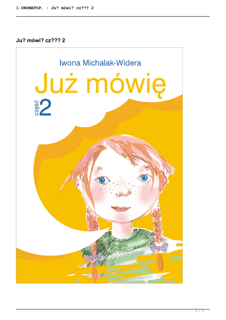 1.ONOMATOP. : Ju? mówi? cz??? 2 Ju? mówi? cz??? 2 1 / 2 1.ONOMATOP. : Ju? mówi? cz??? 2 Ksi??eczka „Ju? mówi?” stanowi cz??? drug? pozycji „Zaczynam mówi?”. Przeznaczona jest dla terapeutów mowy prowadz?cych prac? z dzie?mi, które z ró?nych powodów mówi? pó?niej ni? ich rówie?nicy. Ocena: Nie ma jeszcze oceny Cena 34,00 z? Zadaj pytanie o produkt Szczegó?y produktu Zaproponowane ?wiczenia powinni powtarza? z maluchem w domu równie? jego rodzice b?d? opiekunowie. Zawiera ona propozycje kolejnych g?osek pojawiaj?cych si? w mowie dzieci ma?ych. Stanowi? j? spó?g?oski: „b”, „d”, „w”, „f”, „g”, „k”, „h/ch”, „?”, „l”. ?wiczone g?oski, podobnie jak w cz??ci I, wyst?puj? w logotomach, czyli sylabach oraz tzw. podwójnych logotomach, nast?pnie onomatopejach i w wyrazach dwusylabowych zawieraj?cych przede wszystkim sylaby otwarte, a tak?e ?atwych do wymówienia wyrazach jednosylabowych. Format A5 Obj?to?? 100 stron Autor: Iwona Michalak-Widera Cena przesy?ki ustalana indywidualnie. Przed zamówieniem Ten adres pocztowy jest chroniony przed spamowaniem. Aby go zobaczy?, konieczne jest w??czenie w przegl?darce obs?ugi JavaScript. // Termin realizacji zamówienia od 24 h do 14 dni roboczych. Opinie Nikt jeszcze nie ocenia? tego produktu. 2 / 2 Powered by TCPDF (www.tcpdf.org)