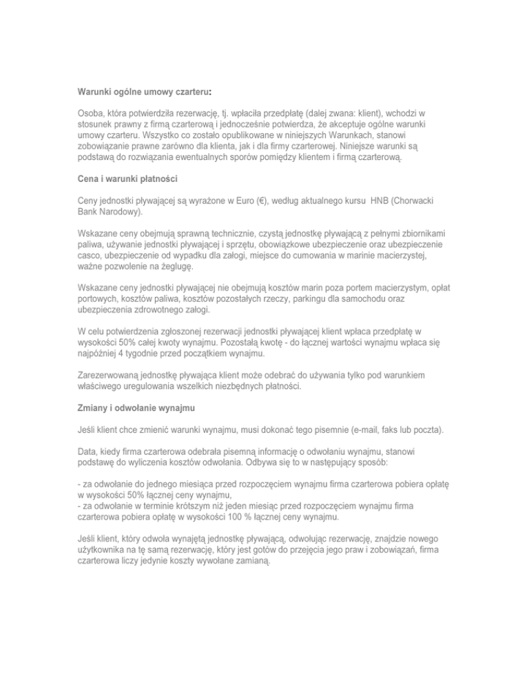 Warunki ogólne umowy czarteru: Osoba, która potwierdziła rezerwację, tj. wpłaciła przedpłatę (dalej zwana: klient), wchodzi w stosunek prawny z firmą czarterową i jednocześnie potwierdza, że akceptuje ogólne warunki umowy czarteru. Wszystko co zostało opublikowane w niniejszych Warunkach, stanowi zobowiązanie prawne zarówno dla klienta, jak i dla firmy czarterowej. Niniejsze warunki są podstawą do rozwiązania ewentualnych sporów pomiędzy klientem i firmą czarterową. Cena i warunki płatności Ceny jednostki pływającej są wyrażone w Euro (€), według aktualnego kursu HNB (Chorwacki Bank Narodowy). Wskazane ceny obejmują sprawną technicznie, czystą jednostkę pływającą z pełnymi zbiornikami paliwa, używanie jednostki pływającej i sprzętu, obowiązkowe ubezpieczenie oraz ubezpieczenie casco, ubezpieczenie od wypadku dla załogi, miejsce do cumowania w marinie macierzystej, ważne pozwolenie na żeglugę. Wskazane ceny jednostki pływającej nie obejmują kosztów marin poza portem macierzystym, opłat portowych, kosztów paliwa, kosztów pozostałych rzeczy, parkingu dla samochodu oraz ubezpieczenia zdrowotnego załogi. W celu potwierdzenia zgłoszonej rezerwacji jednostki pływającej klient wpłaca przedpłatę w wysokości 50% całej kwoty wynajmu. Pozostałą kwotę - do łącznej wartości wynajmu wpłaca się najpóźniej 4 tygodnie przed początkiem wynajmu. Zarezerwowaną jednostkę pływająca klient może odebrać do używania tylko pod warunkiem właściwego uregulowania wszelkich niezbędnych płatności. Zmiany i odwołanie wynajmu Jeśli klient chce zmienić warunki wynajmu, musi dokonać tego pisemnie (e-mail, faks lub poczta). Data, kiedy firma czarterowa odebrała pisemną informację o odwołaniu wynajmu, stanowi podstawę do wyliczenia kosztów odwołania. Odbywa się to w następujący sposób: - za odwołanie do jednego miesiąca przed rozpoczęciem wynajmu firma czarterowa pobiera opłatę w wysokości 50% łącznej ceny wynajmu, - za odwołanie w terminie krótszym niż jeden miesiąc przed rozpoczęciem wynajmu firma czarterowa pobiera opłatę w wysokości 100 % łącznej ceny wynajmu. Jeśli klient, który odwoła wynajętą jednostkę pływającą, odwołując rezerwację, znajdzie nowego użytkownika na tę samą rezerwację, który jest gotów do przejęcia jego praw i zobowiązań, firma czarterowa liczy jedynie koszty wywołane zamianą. Firma czarterowa wyklucza jakąkolwiek odpowiedzialność w przypadku zmian i niewykonania wynajętych usług lub części usług wywołanych siłą wyższą (wojna, zamieszki, strajki, akcje terrorystyczne, problemy sanitarne, klęski żywiołowe, interwencje władz itp.) Odbiór jednostki pływającej (CHECK-IN) Firma czarterowa zobowiązuje się wydać klientowi sprawną technicznie i kompletnie wyposażoną jednostkę pływającą z pełnym zbiornikiem paliwa, czystą i posprzątaną, gotową do rejsu, po godz.16.00 po południu pierwszego dnia wynajmu . Przy odbiorze jednostki pływającej klient zobowiązuje się oddać przedstawicielowi firmy czarterowej poświadczony voucher lub umowę, na której powinno być zaznaczone, że cała kwota wynajmu została we właściwy sposób opłacona. Klient zostawia firmie czarterowej obowiązkową kaucję jako gwarancję, że pokryte zostaną wszelkie możliwe straty lub szkody powstałe w trakcie wynajmu, nawet jeśli nie są objęte polisą ubezpieczeniową. Kaucję zostawia się w gotówce lub poprzez rezerwację środków. Kaucję zwraca się klientowi w całości wtedy, gdy przedstawiciel firmy czarterowej stwierdzi, że jednostka pływająca została zwrócona w umówionym czasie na umówione miejsce, w porządku i nieuszkodzona, z pełnymi zbiornikami paliwa oraz pod warunkiem, że nie istnieją lub nie zostały zapowiedziane roszczenia osób trzecich w stosunku do klienta, które są związane z użytkowaniem wynajętej jednostki pływającej przez klienta. W przypadku poważnego zaniedbania czy też uszkodzenia jednostki pływającej i/lub wyposażenia oraz w przypadku utraty jednej lub więcej części, wszelkie koszty pokrywa klient. Firma czarterowa zachowa kwotę kaucji, która odpowiada wartości naprawy, zamówienia i/lub zakupu wyposażenia lub danej części jednostki pływającej. Jeśli z powodu uszkodzenia/utraty jednostki pływającej/wyposażenia nie jest możliwe dalsze wynajmowanie jednostki pływającej, firma czarterowa zatrzyma kwotę kaucji, która odpowiada wysokości utraconego zysku. Zostawienie kaucji jest obowiązkowe także w przypadkach, gdy jednostka pływająca jest wynajmowana wraz ze sternikiem zaangażowanym przez firmę czarterową. Jeśli klient bez uprzedniej zapowiedzi nie odbierze jednostki pływającej nawet po upływie 48 godzin od umówionej godziny odbioru, firma czarterowa ma prawo do jednostronnego rozwiązania umowy najmu jednostki pływającej, a klient nie ma prawa do późniejszego żądania odszkodowania. Jeśli z jakichkolwiek powodów firma czarterowa nie jest w stanie w umówionym czasie, w umówionym miejscu wydać klientowi zarezerwowanej jednostki pływającej, firma czarterowa dostaje termin do godziny 24.00 na wydanie do dyspozycji klienta innej jednostki pływającej o podobnych charakterystykach. Jeśli firma czarterowa nie zdołałaby tego zrobić, klient może rozwiązać umowę oraz ma prawo do zwrotu wszelkich dokonanych płatności. Jeśli klient zdecyduje się czekać na zastępczą jednostkę pływającą także po umówionym terminie odbioru jednostki pływającej (24.00), wówczas może domagać się kwoty stanowiącej ekwiwalent wartości wynajmu za liczbę dni, podczas których nie miał do dyspozycji jednostki pływającej. Wykluczone są odpowiedzialność firmy czarterowej w kwocie wyższej od ceny najmu, jak i jakiekolwiek inne prawo klienta do odszkodowania. Przy odbiorze jednostki pływającej (check-in) klient zobowiązuje się zbadać i uważnie sprawdzić og