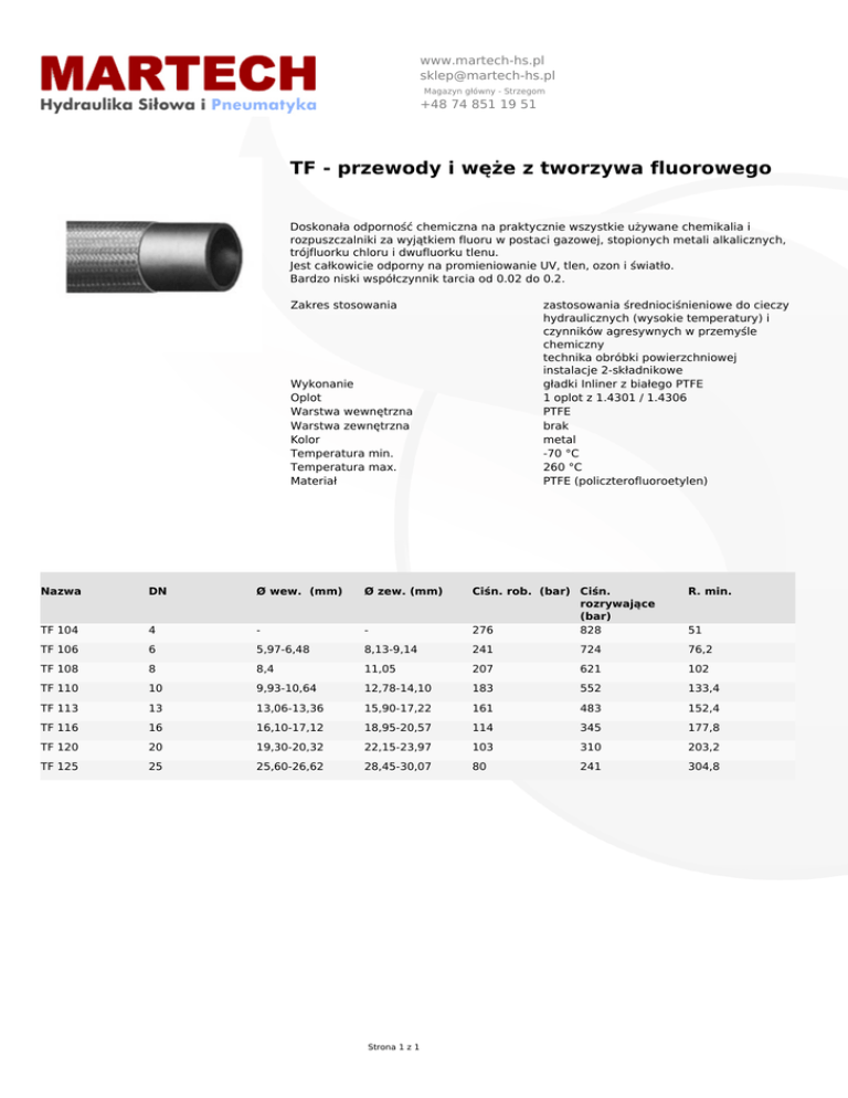 www.martech-hs.pl [email protected] Magazyn główny - Strzegom +48 74 851 19 51 TF - przewody i węże z tworzywa fluorowego Doskonała odporność chemiczna na praktycznie wszystkie używane chemikalia i rozpuszczalniki za wyjątkiem fluoru w postaci gazowej, stopionych metali alkalicznych, trójfluorku chloru i dwufluorku tlenu. Jest całkowicie odporny na promieniowanie UV, tlen, ozon i światło. Bardzo niski współczynnik tarcia od 0.02 do 0.2. Zakres stosowania zastosowania średniociśnieniowe do cieczy hydraulicznych (wysokie temperatury) i czynników agresywnych w przemyśle chemiczny technika obróbki powierzchniowej instalacje 2-składnikowe gładki Inliner z białego PTFE 1 oplot z 1.4301 / 1.4306 PTFE brak metal -70 °C 260 °C PTFE (policzterofluoroetylen) Wykonanie Oplot Warstwa wewnętrzna Warstwa zewnętrzna Kolor Temperatura min. Temperatura max. Materiał Nazwa DN Ø wew. (mm) Ø zew. (mm) R. min. - Ciśn. rob. (bar) Ciśn. rozrywające (bar) 276 828 TF 104 4 - TF 106 6 TF 108 8 5,97-6,48 8,13-9,14 241 724 76,2 8,4 11,05 207 621 102 TF 110 10 9,93-10,64 12,78-14,10 183 552 133,4 TF 113 13 13,06-13,36 15,90-17,22 161 483 152,4 TF 116 16 16,10-17,12 18,95-20,57 114 345 177,8 TF 120 20 19,30-20,32 22,15-23,97 103 310 203,2 TF 125 25 25,60-26,62 28,45-30,07 80 241 304,8 Strona 1 z 1 51