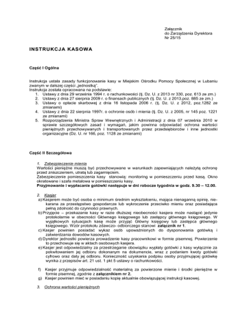 Załącznik do Zarządzenia Dyrektora Nr 25/15 I NS T RU KCJ A K AS O W A Część I Ogólna Instrukcja ustala zasady funkcjonowanie kasy w Miejskim Ośrodku Pomocy Społecznej w Lubaniu zwanym w dalszej części „jednostką”. Instrukcja została opracowana na podstawie: 1. Ustawy z dnia 29 września 1994 r. o rachunkowości (tj. Dz. U. z 2013 nr 330, poz. 613 ze zm.) 2. Ustawy z dnia 27 sierpnia 2009 r. o finansach publicznych (tj. Dz. U. z 2013,poz. 885 ze zm.) 3. Ustawy o opłacie skarbowej z dnia 16 listopada 2006 r. (tj. Dz. U. z 2012, poz.1282 ze zmianami) 4. Ustawy z dnia 22 sierpnia 1997r. o ochronie osób i mienia (tj. Dz. U. z 2005, nr 145 poz. 1221 ze zmianami) 5. Rozporządzenia Ministra Spraw Wewnętrznych i Administracji z dnia 07 września 2010 w sprawie szczegółowych zasad i wymagań, jakim powinna odpowiadać ochrona wartości pieniężnych przechowywanych i transportowanych przez przedsiębiorców i inne jednostki organizacyjne (Dz. U. nr 166, poz. 1128 ze zmianami) Część II Szczegółowa 1. Zabezpieczenie mienia Wartości pieniężne muszą być przechowywane w warunkach zapewniających należytą ochronę przed zniszczeniem, utratą lub zagarnięciem. Zabezpieczenie pomieszczenia kasy stanowią: monitoring w pomieszczeniu przed kasą. Okno okratowane i szafa metalowa w pomieszczeniu kasy. Przyjmowanie i wypłacanie gotówki następuje w dni robocze tygodnia w godz. 9.30 – 12.00. 2. Kasjer a) Kasjerem może być osoba o minimum średnim wykształceniu, mająca nienaganną opinię, niekarana za przestępstwo gospodarcze lub wykroczenie przeciwko mieniu oraz posiadająca pełną zdolność do czynności prawnych. b) Przyjęcie – przekazanie kasy w razie dłuższej nieobecności kasjera może nastąpić jedynie protokolarnie w obecności Głównego księgowego lub zastępcy głównego księgowego. W wyjątkowych sytuacjach kasę może przyjąć Główny księgowy lub zastępca głównego księgowego. Wzór protokołu zdawczo- odbiorczego stanowi załącznik nr 1. c) Kasjer powinien posiadać wykaz osób upoważnionych do dysponowania gotówką i zatwierdzania dowodów kasowych. d) Dyrektor jednostki powierza prowadzenie kasy pracownikowi w formie pisemnej. Powierzenie to przechowuje się w aktach osobowych kasjera. e) Kasjer jest odpowiedzialny za przestrzeganie obowiązku wypłaty gotówki z kasy wyłącznie za pokwitowaniem jej odbioru dokonanym na dokumencie, wraz z podaniem kwoty gotówki cyfrowo oraz daty jej odbioru. Konieczność uzyskania podpisu osoby przyjmującej gotówkę wynika z przepisów art. 21 ust. 1 pkt 5 ustawy o rachunkowości. Kasjer przyjmuje odpowiedzialność materialną za powierzone mienie i środki pieniężne w formie pisemnej, zgodnie z załącznikiem nr 2. g) Kasjer powinien mieć w posiadaniu kopię aktualnie obowiązującej instrukcji kasowej. f) 3. Ochrona wartości pieniężnych a) Wartości pieniężne powinny być przechowywane w warunkach zapewniających należytą ochronę. b) Kasjer jest obowiązany przechowywać wartości pieniężne: w szafie metalowej, do której chowa się wartości pieniężne po zamknięciu kasy. c) Do szafy metalowej jest 1 komplet kluczy, który jest w posiadaniu kasjera. 4. Zatrzymywanie fałszywych znaków pieniężnych. 1) W razie przedstawienia w kasie sfałszowanego lub budzącego wątpliwości co do autentyczności znaku pieniężnego kasjer obowiązany jest zatrzymać i sporządzić protokół o zatrzymaniu w trzech egzemplarzach. 2) Protokół powinien zawierać: - znak pieniężny z zaznaczeniem nazwiska imienia i adresu, - wartość nominalną i datę emisji zatrzymanego znaku pieniężnego, a ponadto serię i numer jeżeli jest to banknot - podpis osoby, która znak przedstawiła i osoby zatrzymującej znak pieniężny. 3) W razie nie możności ustalenia, przez kogo znak został wpłacony, kasjer obowiązany jest zatrzymać znak i sporządzić protokół w dwóch egzemplarzach. Zatrzymany znak pieniężny jednostka przesyła niezwłocznie wraz z oryginałem protokółu właściwie terytorialnie jednostce policji jeżeli zachodzi podejrzenie, że zatrzymany znak pieniężny został sfałszowany przez osobę przedstawiająca znak lub jeżeli nasuwa się przypuszczenie, że osoba ta rozmyślnie puszcza w obieg sfałszowane znaki pieniężne, jednostka obowiązana jest zatrzymać znak pieniężny i niezwłocznie wezwać organy policji. 5. Transport wartości pieniężnych a) Transport wartości pieniężnych nie przekraczających 10.000 zł może być wykonywany pieszo, a do przenoszenia wartości pieniężnych używa się odpowiedniego zabezpieczenia technicznego. b) Transport gotówki przekraczający 10.000 zł z banku do jednostki i odwrotnie powinien odbywać się samochodem przy współudziale konwojenta Zakładu Ochrony Mienia w Lubaniu lub innego podmiotu, z którym Dyrektor jednostki zawrze umowę na konwojowanie wartości pieniężnych. 6. Gospodarka kasowa. a) Jednostka może mieć w kasie: - gotówkę podjętą z rachunku bankowego na pokrycie określonych rodzajowo wydatków, - gotówkę pochodzącą z bieżących wpływów do kasy jednostki, b) Gotówkę podjętą z rachunku bankowego na pokrycie określonych rodzajowo wydatków jednostka powinna przeznaczyć na cel określony przy jej podjęciu, c) Gotówka podjęta z rachunku bankowego jednostki na pokrycie określonych rodzajowo wydatków może być przechowywana w kasie jednostki pod warunkiem należytego zabezpieczenia. d) Saldo gotówki w kasie stanowi gotówka z niepodjętych w terminie świadczeń oraz wpływów bieżących jeszcze nie odprowadzonych na rachunek jednostki. e) Nie wolno dokonywać wydatków z wpływów pobranych do kasy z tytułu dochodów budżetowych. 7. Dowody kasowe a) Wszelkie obroty gotówkowe powinny być udokumentowane dokumentami operacyjnymi kasy: wypłaty gotówkowe (KW) – rozchodowymi dowodami kasowymi, wpłaty gotówkowe (KP) przychodowymi dowodami kasowymi. rejestr operacji kasowych (R