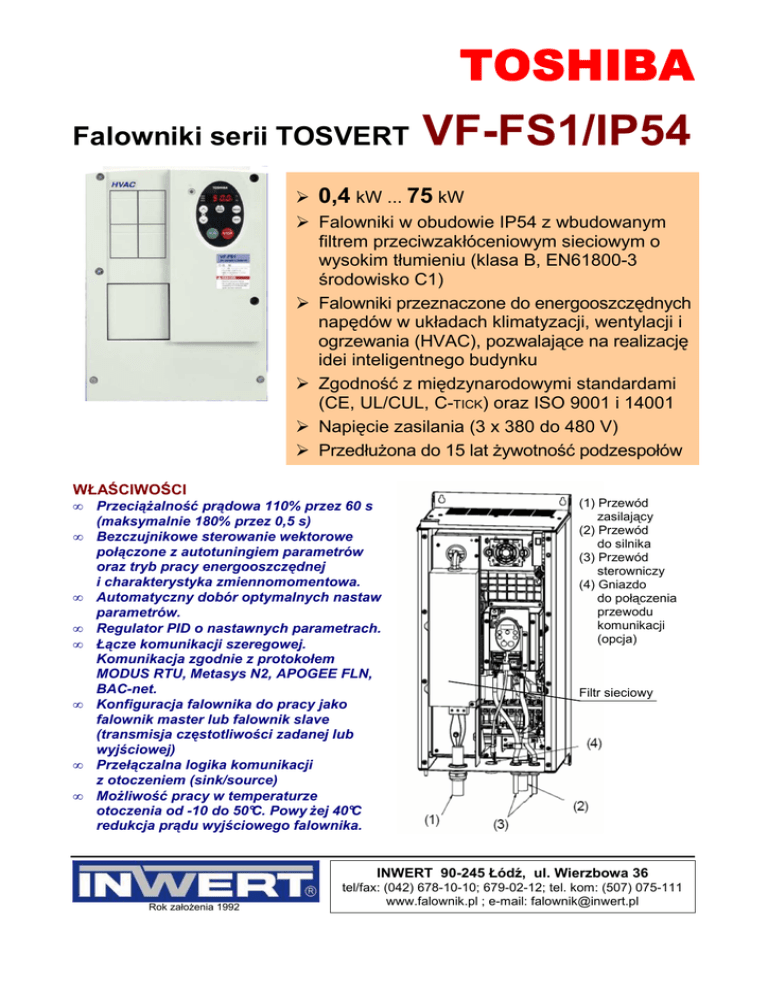 TOSHIBA Falowniki serii TOSVERT VF-FS1/IP54 0,4 kW ... 75 kW Falowniki w obudowie IP54 z wbudowanym filtrem przeciwzakłóceniowym sieciowym o wysokim tłumieniu (klasa B, EN61800-3 środowisko C1) Falowniki przeznaczone do energooszczędnych napędów w układach klimatyzacji, wentylacji i ogrzewania (HVAC), pozwalające na realizację idei inteligentnego budynku Zgodność z międzynarodowymi standardami (CE, UL/CUL, C-TICK) oraz ISO 9001 i 14001 Napięcie zasilania (3 x 380 do 480 V) PrzedłuŜona do 15 lat Ŝywotność podzespołów WŁAŚCIWOŚCI • • • • • • • • PrzeciąŜalność prądowa 110% przez 60 s (maksymalnie 180% przez 0,5 s) Bezczujnikowe sterowanie wektorowe połączone z autotuningiem parametrów oraz tryb pracy energooszczędnej i charakterystyka zmiennomomentowa. Automatyczny dobór optymalnych nastaw parametrów. Regulator PID o nastawnych parametrach. Łącze komunikacji szeregowej. Komunikacja zgodnie z protokołem MODUS RTU, Metasys N2, APOGEE FLN, BAC-net. Konfiguracja falownika do pracy jako falownik master lub falownik slave (transmisja częstotliwości zadanej lub wyjściowej) Przełączalna logika komunikacji z otoczeniem (sink/source) MoŜliwość pracy w temperaturze otoczenia od -10 do 50°C. Powy Ŝej 40°C redukcja prądu wyjściowego falownika. (1) Przewód zasilający (2) Przewód do silnika (3) Przewód sterowniczy (4) Gniazdo do połączenia przewodu komunikacji (opcja) Filtr sieciowy INWERT 90-245 Łódź, ul. Wierzbowa 36 Rok załoŜenia 1992 tel/fax: (042) 678-10-10; 679-02-12; tel. kom: (507) 075-111 www.falownik.pl ; e-mail: [email protected] DANE TECHNICZNE VF-FS1 ..... TOSVERT 4007 4015 4022 4037 4055 4075 4110 4150 4185 4220 4300 4370 4450 4550 4750 PDE PDE PDE PDE PDE PDE PDE PDE PDE PDE PDE PDE PDE PDE PDE Napięcie zasilania Trójfazowe 380 - 480 V Moc znamionowa 0,75 1,5 2,2 4 5,5 7,5 11 15 18,5 22 30 37 45 55 75 silnika (kW) Moc wyjściowa 1,6 2,8 3,9 6,9 9,1 12,2 17,1 23,2 28,2 33,2 44,6 52,0 61,9 76,3 105,3 falownika (kVA) Prąd wyjściowy (A) 37,0 43,5 58,5 79,0 94,0 116,0 160,0 2,2 3,7 5,1 9,1 12,0 16,0 22,5 30,5 (uwaga) (33,3) (39,2) (52,7) (71,1) (75,2) (104,4)(128,0) PrzeciąŜalność 110% przez 60 s, 180% przez 0,5 s prądowa Napięcie Napięcie 3 x 380 ... 500 V, 50/60 Hz zasilania Wahania Napięcie: +10%, -15% (±10%, przy pełnym obciąŜeniu); częstotliwość: ±5% Napięcie wyjściowe 3-fazowe 380-480 V, wartość maksymalna napięcia wyjściowego jest równa napięciu zasilania Częstotliwość PWM Nastawna 2,2 ... 16,0 kHz (nastawa fabryczna 12 kHz) Częstotliwość 0,5 ... 200 Hz (nastawa fabryczna 0,5 … 80 Hz), częstotliwość maksymalna: 30 do 200 Hz wyjściowa Obudowa Obudowa całkowicie zamknięta IP54 (JEM1030) Chłodzenie Własne Filtr sieciowy Wbudowany Uwaga: Znamionowy prąd wyjściowy jest określony dla częstotliwości PWM do 4 kHz. JeŜeli częstotliwość PWM przekracza 4 kHz obowiązują wartości prądu wyjściowego podane w nawiasach Warunki środowiskowe Miejsce Zainstalowanie w pomieszczeniu wewnątrz budynku na wysokości do 1000 m n.p.m. bez naraŜenia zainstalowania na bezpośrednie działanie światła słonecznego oraz Ŝrących lub łatwopalnych par. o o Temperatura pracy -10 ... +50 C, powyŜej 40 C wymagana redukcja prądu wyjściowego falownika Temperatura o -25 ... +70 C składowania Wilgotność 20 do 93% bez kondensacji pary wodnej względna 2 Wibracje Do 5,9 m/s (10 do 55 Hz). WYMIARY ZEWNĘTRZNE Falownik FFS1 4007PDE VFFS1 4015PDE VFFS1 4022PDE VFFS1 4037PDE VFFS1 4055PDE VFFS1 4075PDE VFFS1 4110PDE VFFS1 4150PDE VFFS1 4185PDE VFFS1 4220PDE VFFS1 4300PDE VFFS1 4370PDE VFFS1 4450PDE VFFS1 4550PDE VFFS1 4750PDE Wymiary zewnętrzne Moc (mm) silnika Szero- Wyso- Głębo (kW) kość Kość kość W H D 0,75 215 297 192,3 1,5 2,2 4 230 340 208,3 5,5 7,5 11 295,3 560 292,9 15 18,5 315 665 293,4 22 285 720 289,4 30 37 285 880 334 45 55 362 1000 354 75 CięŜar (kg) 5,6 5,6 5,6 8,1 8,1 9,4 25,5 25,5 33,5 33,5 33,5 43,5 43,5 69,1 69,1 PA/+ PC/L1 L2 L3 Obwód główny U V W Sterowanie PE Zintegrowany filtr sieciowy klasy B PE FLC F VF-FS1 PDE FLB FLA RES RY RS485 VIA (bin) RC P24 CC FM VIA VIA (analog) VIB Source V V PLC PP Sink FM Sygnał napięciowy 0 - 10 V Sygnał prądowy 0(4) – 20 mA R I I CC FM PLC M