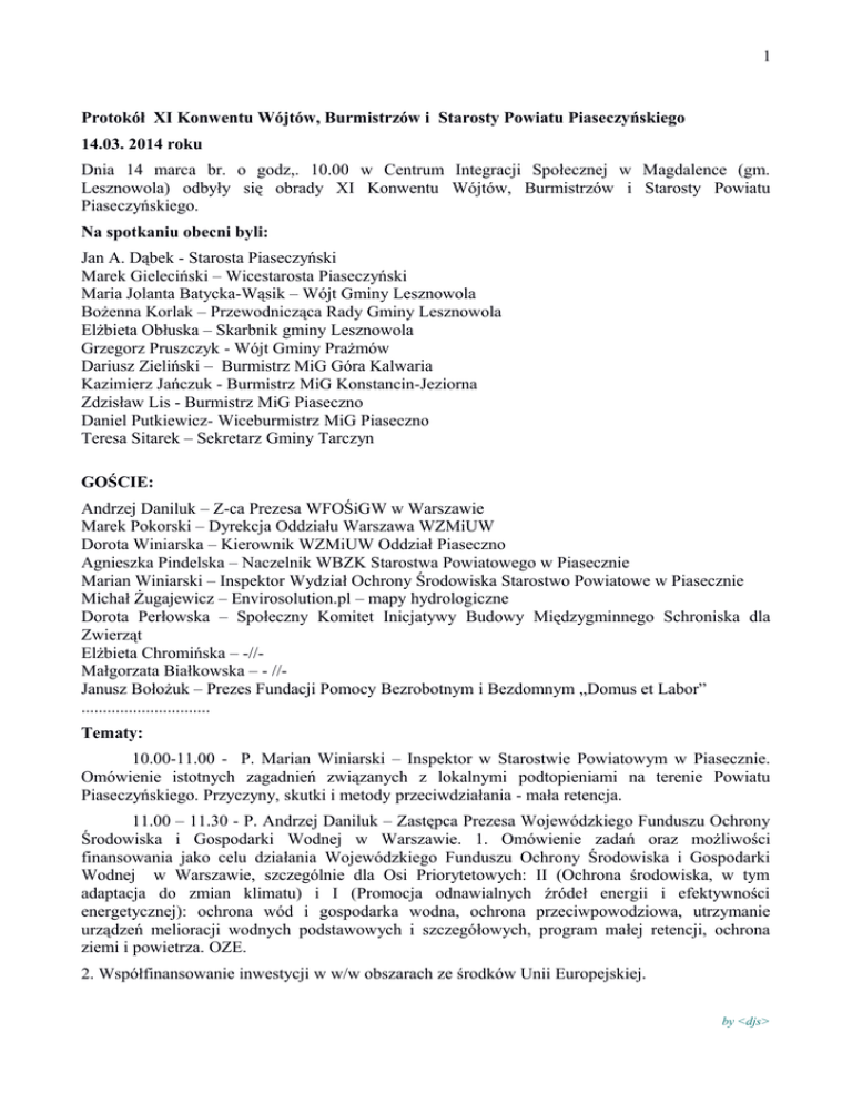 1 Protokół XI Konwentu Wójtów, Burmistrzów i Starosty Powiatu Piaseczyńskiego 14.03. 2014 roku Dnia 14 marca br. o godz,. 10.00 w Centrum Integracji Społecznej w Magdalence (gm. Lesznowola) odbyły się obrady XI Konwentu Wójtów, Burmistrzów i Starosty Powiatu Piaseczyńskiego. Na spotkaniu obecni byli: Jan A. Dąbek - Starosta Piaseczyński Marek Gieleciński – Wicestarosta Piaseczyński Maria Jolanta Batycka-Wąsik – Wójt Gminy Lesznowola Bożenna Korlak – Przewodnicząca Rady Gminy Lesznowola Elżbieta Obłuska – Skarbnik gminy Lesznowola Grzegorz Pruszczyk - Wójt Gminy Prażmów Dariusz Zieliński – Burmistrz MiG Góra Kalwaria Kazimierz Jańczuk - Burmistrz MiG Konstancin-Jeziorna Zdzisław Lis - Burmistrz MiG Piaseczno Daniel Putkiewicz- Wiceburmistrz MiG Piaseczno Teresa Sitarek – Sekretarz Gminy Tarczyn GOŚCIE: Andrzej Daniluk – Z-ca Prezesa WFOŚiGW w Warszawie Marek Pokorski – Dyrekcja Oddziału Warszawa WZMiUW Dorota Winiarska – Kierownik WZMiUW Oddział Piaseczno Agnieszka Pindelska – Naczelnik WBZK Starostwa Powiatowego w Piasecznie Marian Winiarski – Inspektor Wydział Ochrony Środowiska Starostwo Powiatowe w Piasecznie Michał Żugajewicz – Envirosolution.pl – mapy hydrologiczne Dorota Perłowska – Społeczny Komitet Inicjatywy Budowy Międzygminnego Schroniska dla Zwierząt Elżbieta Chromińska – -//Małgorzata Białkowska – - //Janusz Bołożuk – Prezes Fundacji Pomocy Bezrobotnym i Bezdomnym „Domus et Labor” .............................. Tematy: 10.00-11.00 - P. Marian Winiarski – Inspektor w Starostwie Powiatowym w Piasecznie. Omówienie istotnych zagadnień związanych z lokalnymi podtopieniami na terenie Powiatu Piaseczyńskiego. Przyczyny, skutki i metody przeciwdziałania - mała retencja. 11.00 – 11.30 - P. Andrzej Daniluk – Zastępca Prezesa Wojewódzkiego Funduszu Ochrony Środowiska i Gospodarki Wodnej w Warszawie. 1. Omówienie zadań oraz możliwości finansowania jako celu działania Wojewódzkiego Funduszu Ochrony Środowiska i Gospodarki Wodnej w Warszawie, szczególnie dla Osi Priorytetowych: II (Ochrona środowiska, w tym adaptacja do zmian klimatu) i I (Promocja odnawialnych źródeł energii i efektywności energetycznej): ochrona wód i gospodarka wodna, ochrona przeciwpowodziowa, utrzymanie urządzeń melioracji wodnych podstawowych i szczegółowych, program małej retencji, ochrona ziemi i powietrza. OZE. 2. Współfinansowanie inwestycji w w/w obszarach ze środków Unii Europejskiej. by <djs> 2 11.30- 12.00 - P. Marek Pokorski - Dyrektor Wojewódzkiego Zarządu Melioracji i Urządzeń Wodnych – Oddziału w Warszawie; P. Dorota Winiarska - Kierownik Inspektoratu w Piasecznie Wojewódzkiego Zarządu Melioracji i Urządzeń Wodnych – Oddziału w Warszawie. Gospodarka Wodna i zabezpieczenia przeciwpowodziowe z punktu widzenia Wojewódzkiego Zarządu Melioracji i Urządzeń Wodnych. PRZERWA 12.30-13.00 - P. Michał Żugajewicz – Envirosolution.pl; geoinformatyka; 501.540.755. Omówienie zagadnień związanych z opracowywaniem map hydrologicznych z wykorzystaniem Systemu Informacji Przestrzennej (GIS). 13.00-13.30 P. Dorota Perłowska – Fundacja MIKROPSY; (tel. 502.507.466) Inicjatywa zbudowania schroniska dla zwierząt bezdomnych z terenu gmin Powiatu Piaseczyńskiego. 13.30- 14.00 Organizacja pozarządowa „Domus et Labor” - wsparcie finansowe działalności przez samorządy gmin i powiatu. Wystąpienie Prezesa Fundacji – Janusza Bołożuka (tel. 603.373.794) …............................... Obrady otworzyła i gości przywitała pan Wójt M.J. Batycka-Wójcik. Pani Wójt przedstawiła pokrótce działalność p. prezesa Andrzeja Daniluka i jego aktywną współpracę ze środowiskiem samorządów lokalnych m.in. w kwestii pozyskiwania funduszy. Pani Wójt przedstawiła także obecnych decydentów gmin, pozostałych prelegentów Konwentu. W ramach wstępu p. Wójt poinformowała zebranych o historii nabycia przez gminę Lesznowola budynku, w którym obecnie mieści się Centrum Integracji Społecznej oraz Gminna Biblioteka, i w którym mają miejsce obrady Konwentu. Głos zabrał p. Starosta J.A.Dąbek. Przedstawił kolejność prelegentów i przekazał głos panu inspektorowi Marianowi Winiarskiemu. I. Insp. Marian Winiarski - prezentacja Prezentacja dotyczyła najbardziej istotnych tematów związanych z gospodarką wodną na terenie Powiatu Piaseczyńskiego i obejmowała dwa bloki tematyczne: 1. Lokalne podtopienia na terenie Powiatu Piaseczyńskiego – przyczyny, skutki i metody przeciwdziałania. Mała retencja. 2. Adaptacja ustawy Prawo wodne do założeń Ramowej Dyrektywy Wodnej. Ad.1. - Cztery podstawowe czynniki, które wpłynęły na występowanie lokalnych podtopień: A. zmieniający się klimat (zwiększająca się intensywność, ciągłość i gwałtowność opadów atmosferycznych). Opady atmosferyczne w latach 2009 do 2011 ilość opadów przekroczyła 2, a nawet 3-krotnie wielkość średnich opadów miesięcznych w miesiącach maj-sierpień. B. układ geomorfologiczny i hydrogeologiczny terenu powiatu (ukształtowanie terenu oraz struktura geologiczna). Struktura geologiczna gruntu jest wyjątkowo niekorzystna, gdyż mamy tu do czynienia ze strukturami gliniastymi i gliniasto-piaszczystymi, słabo przepuszczającymi wodę w głąb gruntu. Ponadto nasz podstawowy odbiornik wód gruntowych i powierzchniowych (opadowych) – rzeka Jeziorka, prowadzi swoje wody ze zlewni naszego Powiatu jak i z ok. 50% powierzchni zlewni Powiatu Grójeckiego. C. Stan techniczny urządzeń melioracji wodnych szczegółowych (sieci drenarskiej tzn. rowów by <djs> 3 melioracyjnych, sączków i zbieraczy). Utrzymanie (konserwacja) tych urządzeń była zaniedbywana od dziesięcioleci. Środki finansowe na realizacje tych zadań nie przekraczały rocznie 7-9% wartość realnego zapotrzebowania. D. Czynniki antropogeniczne (ingerencja człowieka w naturę). Intensywna urbanizacja i 
