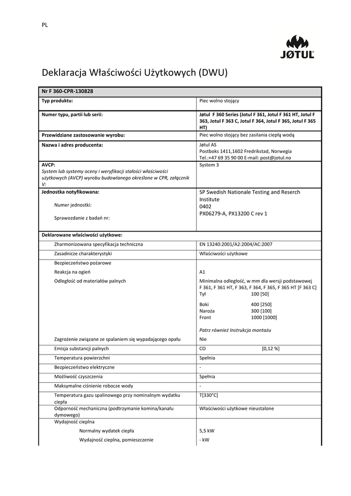 PL Deklaracja Właściwości Użytkowych (DWU) Nr F 360‐CPR‐130828 Typ produktu: Piec wolno stojący Numer typu, partii lub serii: Jøtul F 360 Series (Jotul F 361, Jotul F 361 HT, Jotul F 363, Jotul F 363 C, Jotul F 364, Jotul F 365, Jotul F 365 HT) Piec wolno stojący bez zasilania ciepłą wodą Przewidziane zastosowanie wyrobu: Nazwa i adres producenta: AVCP: System lub systemy oceny i weryfikacji stałości właściwości użytkowych (AVCP) wyrobu budowlanego określone w CPR, załącznik V: Jednostka notyfikowana: Numer jednostki: Sprawozdanie z badań nr: Jøtul AS Postboks 1411,1602 Fredrikstad, Norwegia Tel.:+47 69 35 90 00 E-mail: [email protected] System 3 SP Swedish Nationale Testing and Reserch Institute 0402 PX06279-A, PX13200 C rev 1 Deklarowane właściwości użytkowe: Zharmonizowana specyfikacja techniczna EN 13240:2001/A2:2004/AC:2007 Zasadnicze charakterystyki Właściwości użytkowe Bezpieczeństwo pożarowe Reakcja na ogień A1 Odległość od materiałów palnych Minimalna odległość, w mm dla wersji podstawowej F 361, F 361 HT, F 363, F 364, F 365, F 365 HT [F 363 C] Tył 100 [50] Boki Naroża Front 400 [250] 300 [100] 1000 [1000] Patrz również Instrukcja montażu Zagrożenie związane ze spalaniem się wypadającego opału Nie Emisja substancji palnych CO Temperatura powierzchni Spełnia Bezpieczeństwo elektryczne - Możliwość czyszczenia Spełnia Maksymalne ciśnienie robocze wody - Temperatura gazu spalinowego przy nominalnym wydatku ciepła Odporność mechaniczna (podtrzymanie komina/kanału dymowego) Wydajność cieplna T[330°C] [0,12 %] Właściwości użytkowe nieustalone Normalny wydatek ciepła 5,5 kW Wydajność cieplna, pomieszczenie - kW Wydajność cieplna, woda Wydajność energetyczna - *kW [73%] DEKLARACJA: Właściwości produktu określonego w pkt. 1 i 2 są zgodne z deklarowanymi właściwościami użytkowymi określonymi w pkt. 8. Niniejsza deklaracja właściwości użytkowych wydawana jest na wyłączną odpowiedzialność producenta określonego w pkt. 4. Podpisano w imieniu producenta: Tom J. Berglind Kierownik ds. badań i rozwoju (Imię i nazwisko, funkcja) Fredrikstad, 28 sierpień, 2013 (Miejscowość i data wydania) (Podpis nieczytelny) (Podpis)