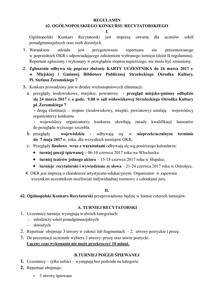 REGULAMIN 62. OGÓLNOPOLSKIEGO KONKURSU RECYTATORSKIEGO I. Ogólnopolski Konkurs Recytatorski jest imprezą otwartą dla uczniów ponadgimnazjalnych oraz osób dorosłych. szkół 1. Warunkiem udziału jest przygotowanie repertuaru nie prezentowanego w poprzednich OKR i odpowiadającego założeniom wybranego turnieju (dział II regulaminu). Repertuar zgłoszony i wykonany w przeglądzie stopnia najniższego, nie może być zmieniony. 2. Zgłoszenie odbywa się poprzez złożenie KARTY UCZESTNIKA do 16 marca 2017 r. w Miejskiej i Gminnej Bibliotece Publicznej Strzeleckiego Ośrodka Kultury, Pl. Stefana Żeromskiego 7 3. Konkurs prowadzony jest w drodze wielostopniowych eliminacji: a. przeglądy środowiskowe, miejskie, powiatowe - przegląd miejsko-gminny odbędzie się 24 marca 2017 r. o godz. 9.00 w sali widowiskowej Strzeleckiego Ośrodka Kultury pl. Żeromskiego 7 - drogą eliminacji – stopnie (środowiskowy, miejski, powiatowy) ustalają wojewódzcy organizatorzy konkursu. - wojewódzcy organizatorzy konkursu określają zasady kwalifikacji laureatów do przeglądu wyższego szczebla. b. przeglądy wojewódzkie - odbywają się w nieprzekraczalnym terminie do 7 maja 2017 r. roku, dla wszystkich turniejów OKR; c. Przeglądy finałowe wraz z warsztatami odbywają się wg poniższego kalendarza: turniej poezji śpiewanej – 06-10 czerwca 2017 roku we Włocławku turniej teatrów jednego aktora – 15-18 czerwca 2017 roku w Słupsku; turnieje recytatorski i wywiedzione ze słowa – 21-24 czerwca 2017 roku w Ostrołęce. 4. OKR jest imprezą o charakterze artystyczno-edukacyjnym: Organizator w zapewnia wszystkim uczestnikom możliwość indywidualnej rozmowy z członkami jury. II. 62. Ogólnopolski Konkurs Recytatorski przeprowadzony będzie w formie czterech turniejów. A. TURNIEJ RECYTATORSKI 1. Uczestnicy turnieju występują w dwóch kategoriach: - młodzieży szkół ponadgimnazjalnych - dorosłych 2. Repertuar obejmuje 3 utwory w całości lub fragmentach – 2 utwory poetyckie i prozę. 3. Do prezentacji uczestnik wybiera 2 utwory: prozę oraz utwór poetycki. Łączny czas wykonania nie może przekroczyć 10 minut. B.TURNIEJ POEZJI ŚPIEWANEJ 1. Uczestnicy – tylko soliści – występują bez podziału na kategorie. 2. Repertuar obejmuje: - 3 utwory śpiewane - 1 utwór recytowany. 3. W odniesieniu do repertuaru śpiewanego obowiązują następujące zasady: - wykonywane mogą być wiersze, które zostały opublikowane w książkach lub prasie literackiej; - przynajmniej jeden utwór musi być oryginalny, tzn. mieć nowo skomponowaną muzykę; - uczestnicy mogą wykonać trzeci utwór z tekstem własnym. 4. Do prezentacji uczestnik zgłasza 2 utwory śpiewane, 1 recytowany i ewentualnie jako trzeci – śpiewany utwór z tekstem własnym. (Do przeglądów wojewódzkich włącznie prezentacja utworu recytowanego jest obowiązkowa). Łączny czas ich wykonania nie może przekroczyć 10 minut. 5. Do akompaniamentu może być stosowany 1 instrument lub mały zespół muzyczny (do 3 osób) bądź wcześniej dokonane nagranie (półplayback). 6. Utwór znany i posiadający określony kształt wykonawczy podlega ocenie tylko wówczas, gdy uczestnik przedstawił nową, własną interpretację. C. TURNIEJ TEATRÓW JEDNEGO AKTORA 1. Uczestnicy występują bez podziału na kategorie. 2. Pierwszy stopień eliminacyjny ustala wojewódzki organizator Konkursu. 3. Uczestnicy przygotowują spektakl w oparciu o dowolny materiał literacki. Czas trwania nie może przekroczyć 30 minut. D. WYWIEDZIONE ZE SŁOWA Jest to turniej dla poszukujących nowych form wypowiedzi. Dla przykładu - występ, który nie jest recytacją, a nie stał się jeszcze teatrem; łączenie – w obrębie jednego utworu – mówienia ze śpiewem, śpiewu z ruchem. Takie propozycje muszą jednak wychodzić od słowa, być próbą jego interpretacji, sprawdzenia jego związków z innymi językami sztuki. Obowiązują następujące z a s a d y: 1. Uczestnicy występują bez podziału na kategorie. 2. Repertuar jest dowolny (np. wiersz lub jego fragment, monolog literacki, collage tekstów) 3. Dowolna forma prezentacji (np. teatr jednego wiersza, łączenie słowa mówionego ze śpiewem, z dźwiękiem, ruchem, rekwizytem). Czas występu nie może przekroczyć 7 minut. III. 1. Do oceny wykonawców powołane zostanie przez Organizatora przeglądów Jury właściwe dla stopnia przeglądu. 2. Jury dokona oceny wg następujących kryteriów: - dobór repertuaru (wartości artystyczne utworów oraz ich dobór do możliwości wykonawczych uczestnika); - interpretacja utworów; - kultura słowa; - ogólny wyraz artystyczny. W turnieju wywiedzione ze słowa jury uwzględni ponadto: - celowość użycia środków pozasłownych (np. kostiumu, dźwięku, elementów scenografii i innych) wspomagających interpretację; - kompozycję sceniczną występu. W turnieju teatrów jednego aktora jury uwzględni również: - opracowanie dramaturgiczne; - opracowanie reżyserskie; - wykonanie zadań aktorskich; - pozasłowne elementy spektaklu – scenografia, muzyka. W turnieju poezji śpiewanej jury uwzględni także: - zgodność muzyki z charakterem wiersza; - muzykalność i warunki głosowe wykonawcy; - wartości artystyczne muzyki. 3. Podstawą do sformułowania werdyktu jest wysłuchanie przez każdego członka jury – wszystkich uczestników przeglądu. 4. Ostateczny werdykt jest ustalany w drodze wspólnej dyskusji członków jury. W przypadku równego podziału głosów, rozstrzyga głos przewodniczącego. 5. Decyzja jury jest ostateczna. 6. Uczestnicy mają prawo zwracania się jury o uzasadnienie oceny swojej prezentacji. Informacje, pliki do ściągnięcia www.sok.strzelceopolskie.pl i https://www.facebook.com/MiGBP nr tel. 77 424 05 19 lub 77 424 05 16