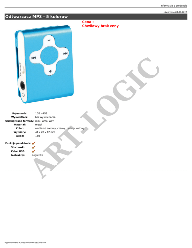 Informacje o produkcie Utworzono 04-03-2017 Odtwarzacz MP3 - 5 kolorów AR TLO G IC Cena : Chwilowy brak ceny Pojemność: Wyświetlacz: 1GB - 4GB bez wyswietlacza Obsługiwane formaty: mp3, wma, wav Material: Kolor: Wymiary: Waga: metal niebieski, srebrny, czarny, zielony, różowy 41 x 28 x 12 mm 15g Funkcja pendrive'a: Słuchawki: Kabel USB: Instrukcja: angielska Wygenerowano w programie www.oscGold.com
