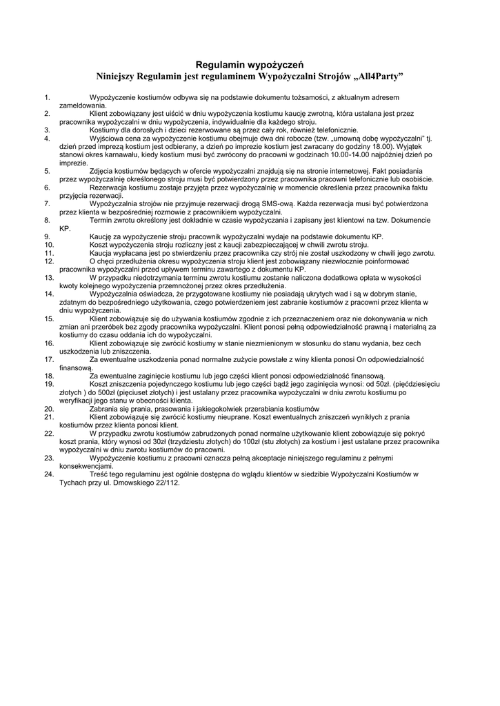 Regulamin wypożyczeń Niniejszy Regulamin jest regulaminem Wypożyczalni Strojów „All4Party” 1. 2. 3. 4. 5. 6. 7. 8. 9. 10. 11. 12. 13. 14. 15. 16. 17. 18. 19. 20. 21. 22. 23. 24. Wypożyczenie kostiumów odbywa się na podstawie dokumentu tożsamości, z aktualnym adresem zameldowania. Klient zobowiązany jest uiścić w dniu wypożyczenia kostiumu kaucję zwrotną, która ustalana jest przez pracownika wypożyczalni w dniu wypożyczenia, indywidualnie dla każdego stroju. Kostiumy dla dorosłych i dzieci rezerwowane są przez cały rok, również telefonicznie. Wyjściowa cena za wypożyczenie kostiumu obejmuje dwa dni robocze (tzw. „umowną dobę wypożyczalni” tj. dzień przed imprezą kostium jest odbierany, a dzień po imprezie kostium jest zwracany do godziny 18.00). Wyjątek stanowi okres karnawału, kiedy kostium musi być zwrócony do pracowni w godzinach 10.00-14.00 najpóźniej dzień po imprezie. Zdjęcia kostiumów będących w ofercie wypożyczalni znajdują się na stronie internetowej. Fakt posiadania przez wypożyczalnię określonego stroju musi być potwierdzony przez pracownika pracowni telefonicznie lub osobiście. Rezerwacja kostiumu zostaje przyjęta przez wypożyczalnię w momencie określenia przez pracownika faktu przyjęcia rezerwacji. Wypożyczalnia strojów nie przyjmuje rezerwacji drogą SMS-ową. Każda rezerwacja musi być potwierdzona przez klienta w bezpośredniej rozmowie z pracownikiem wypożyczalni. Termin zwrotu określony jest dokładnie w czasie wypożyczania i zapisany jest klientowi na tzw. Dokumencie KP. Kaucję za wypożyczenie stroju pracownik wypożyczalni wydaje na podstawie dokumentu KP. Koszt wypożyczenia stroju rozliczny jest z kaucji zabezpieczającej w chwili zwrotu stroju. Kaucja wypłacana jest po stwierdzeniu przez pracownika czy strój nie został uszkodzony w chwili jego zwrotu. O chęci przedłużenia okresu wypożyczenia stroju klient jest zobowiązany niezwłocznie poinformować pracownika wypożyczalni przed upływem terminu zawartego z dokumentu KP. W przypadku niedotrzymania terminu zwrotu kostiumu zostanie naliczona dodatkowa opłata w wysokości kwoty kolejnego wypożyczenia przemnożonej przez okres przedłużenia. Wypożyczalnia oświadcza, że przygotowane kostiumy nie posiadają ukrytych wad i są w dobrym stanie, zdatnym do bezpośredniego użytkowania, czego potwierdzeniem jest zabranie kostiumów z pracowni przez klienta w dniu wypożyczenia. Klient zobowiązuje się do używania kostiumów zgodnie z ich przeznaczeniem oraz nie dokonywania w nich zmian ani przeróbek bez zgody pracownika wypożyczalni. Klient ponosi pełną odpowiedzialność prawną i materialną za kostiumy do czasu oddania ich do wypożyczalni. Klient zobowiązuje się zwrócić kostiumy w stanie niezmienionym w stosunku do stanu wydania, bez cech uszkodzenia lub zniszczenia. Za ewentualne uszkodzenia ponad normalne zużycie powstałe z winy klienta ponosi On odpowiedzialność finansową. Za ewentualne zaginięcie kostiumu lub jego części klient ponosi odpowiedzialność finansową. Koszt zniszczenia pojedynczego kostiumu lub jego części bądź jego zaginięcia wynosi: od 50zł. (pięćdziesięciu złotych ) do 500zł (pięciuset złotych) i jest ustalany przez pracownika wypożyczalni w dniu zwrotu kostiumu po weryfikacji jego stanu w obecności klienta. Zabrania się prania, prasowania i jakiegokolwiek przerabiania kostiumów Klient zobowiązuje się zwrócić kostiumy nieuprane. Koszt ewentualnych zniszczeń wynikłych z prania kostiumów przez klienta ponosi klient. W przypadku zwrotu kostiumów zabrudzonych ponad normalne użytkowanie klient zobowiązuje się pokryć koszt prania, który wynosi od 30zł (trzydziestu złotych) do 100zł (stu złotych) za kostium i jest ustalane przez pracownika wypożyczalni w dniu zwrotu kostiumów do pracowni. Wypożyczenie kostiumu z pracowni oznacza pełną akceptacje niniejszego regulaminu z pełnymi konsekwencjami. Treść tego regulaminu jest ogólnie dostępna do wglądu klientów w siedzibie Wypożyczalni Kostiumów w Tychach przy ul. Dmowskiego 22/112.