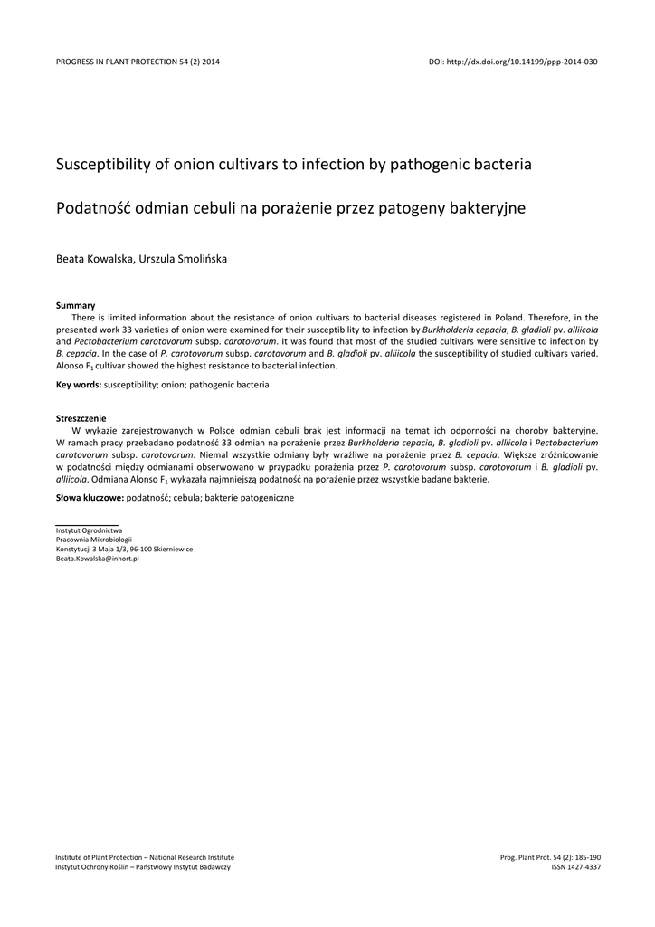 PROGRESS IN PLANT PROTECTION 54 (2) 2014 DOI: http://dx.doi.org/10.14199/ppp-2014-030 Susceptibility of onion cultivars to infection by pathogenic bacteria Podatność odmian cebuli na porażenie przez patogeny bakteryjne Beata Kowalska, Urszula Smolińska Summary There is limited information about the resistance of onion cultivars to bacterial diseases registered in Poland. Therefore, in the presented work 33 varieties of onion were examined for their susceptibility to infection by Burkholderia cepacia, B. gladioli pv. alliicola and Pectobacterium carotovorum subsp. carotovorum. It was found that most of the studied cultivars were sensitive to infection by B. cepacia. In the case of P. carotovorum subsp. carotovorum and B. gladioli pv. alliicola the susceptibility of studied cultivars varied. Alonso F1 cultivar showed the highest resistance to bacterial infection. Key words: susceptibility; onion; pathogenic bacteria Streszczenie W wykazie zarejestrowanych w Polsce odmian cebuli brak jest informacji na temat ich odporności na choroby bakteryjne. W ramach pracy przebadano podatność 33 odmian na porażenie przez Burkholderia cepacia, B. gladioli pv. alliicola i Pectobacterium carotovorum subsp. carotovorum. Niemal wszystkie odmiany były wrażliwe na porażenie przez B. cepacia. Większe zróżnicowanie w podatności między odmianami obserwowano w przypadku porażenia przez P. carotovorum subsp. carotovorum i B. gladioli pv. alliicola. Odmiana Alonso F1 wykazała najmniejszą podatność na porażenie przez wszystkie badane bakterie. Słowa kluczowe: podatność; cebula; bakterie patogeniczne Instytut Ogrodnictwa Pracownia Mikrobiologii Konstytucji 3 Maja 1/3, 96-100 Skierniewice [email protected] Institute of Plant Protection – National Research Institute Instytut Ochrony Roślin – Państwowy Instytut Badawczy Prog. Plant Prot. 54 (2): 185-190 ISSN 1427-4337 186 Susceptibility of onion to pathogenic bacteria / Podatność cebuli na patogeny bakteryjne Wstęp / Introduction Polska jest od wielu lat jednym z głównych producentów cebuli (Allium cepa L.) w Europie, zajmując trzecie miejsce pod względem wielkości produkcji. Powierzchnia uprawy tego warzywa w kraju w 2012 roku wynosiła 25,1 tys. ha, zbiory cebuli – 642,2 tys. ton, a eksport około 120 tys. ton (Analizy rynkowe 2013). Z tego względu cebula należy do najważniejszych gatunków warzyw uprawianych w naszym kraju (Knaflewski 2007). Od kilku lat w Polsce notuje się znaczny wzrost liczby chorób bakteryjnych na roślinach warzywnych. Poważne straty zauważalne są w uprawach polowych, w transporcie oraz szczególnie podczas przechowywania. Przyczyną nasilenia chorób bakteryjnych są między innymi warunki atmosferyczne – wysoka temperatura w okresie wegetacji warzyw, duże ilości opadów, gradobicia, silne wiatry i okresowe podtopienia pól. Ponadto, ze względu na brak wystarczająco skutecznych środków ochrony istnieją ogromne trudności w zapobieganiu tym chorobom. Bakteriozy rozwijają się bardzo szybko, a początkowy proces chorobowy jest trudno zauważalny. Cebula porażana jest przez następujące gatunki bakterii: Burkholderia gladioli pv. alliicola, B. cepacia, Pectobacterium carotovorum subsp. carotovorum, Pseudomonas marginalis pv. marginalis, P. viridiflava, P. fluorescens, P. aeruginosa, Serratia plymuthica, Enterobacter cloacae i Pantoea ananatis (Agrios 2005; Schwartz i Mohan 2008; Kowalska 2010). Gatunek B. cepacia znany jest jako sprawca bakteriozy na cebuli, w literaturze zwanej kwaśną skórką. Choroba ta stanowi poważny problem w warzywnictwie, gdyż prowadzi do dużych strat w plonie cebuli, czasami sięgających nawet 50% (Schwartz i Mohan 2008). Zniszczenia spowodowane przez tę bakterię zauważalne są często dopiero w przechowalniach, mimo że infekcja cebul występuje już na polu. Patogen obecny w glebie lub wodzie wnika do tkanek poprzez zranienia w okolicy szyjki lub na liściach, powstałe np. po załamaniu szczypioru lub wskutek mechanicznego uszkodzenia (Kawamoto i Lorbeer 1974) i przemieszcza się w tkankach szczypioru w kierunku główki cebuli. Zewnętrzne łuski stają się śluzowate, przybierają zabarwienie od jasnożółtego do jasnobrązowego. Wewnętrzne łuski oraz środkowa część cebuli pozostają niezasiedlone. Suche zewnętrzne łuski mogą łatwo ulec oddzieleniu podczas ręcznego wyrywania cebul, ukazując porażoną część cebuli. Temperatura sprzyjająca rozwojowi choroby to ponad 30°C. Czasami, szczególnie u młodych roślin, infekcja pozostaje utajona, a symptomy pojawiają się, gdy zaczyna tworzyć się cebula (Sobiczewski i Schollenberger 2002; Schwartz i Mohan 2008). B. gladioli pv. alliicola jest sprawcą miękkiej zgnilizny cebuli zaczynającej się od szyjki. Choroba ta często jest następstwem uszkodzeń szyjki, spowodowanych przez inne patogeny, np. Peronospora destructor lub przez czynniki atmosferyczne, np. grad. W latach obfitujących w deszcze, bakterioza może być obserwowana w końcowym etapie uprawy cebuli. We wczesnym stadium na powierzchni cebuli nie występują żadne widoczne zmiany, oprócz czasami miękkiej szyjki zauważalnej po naciśnięciu. Na przekroju można zaobserwować jedną lub dwie porażone wewnętrzne łuski mięsiste. Są one miękkie i wyglądają jak nasiąknięte wodą. Z czasem na gnijących łuskach pojawiają się ciemne przebarwienia oraz dochodzi do mięknięcia i gnicia całej cebuli. Bakteria P. carotovorum subsp. carotovorum wywołuje na cebuli mokrą zgniliznę. Początkowe objawy to małe plamki, wyglądające jakby były nasiąknięte wodą, które gwałtownie powiększają się i występują zarówno na powierzchni, jak i przenikają w głąb penetrowanej tkanki. Tkanka w obrębie porażonego fragmentu staje się kremowo zabarwiona, śluzowata i przekształca się w lekko ziarnistą masę. Powierzchnia porażonych cebul może pozostać nieuszkodzona, podczas gdy wewnętrzne tkanki zmienia