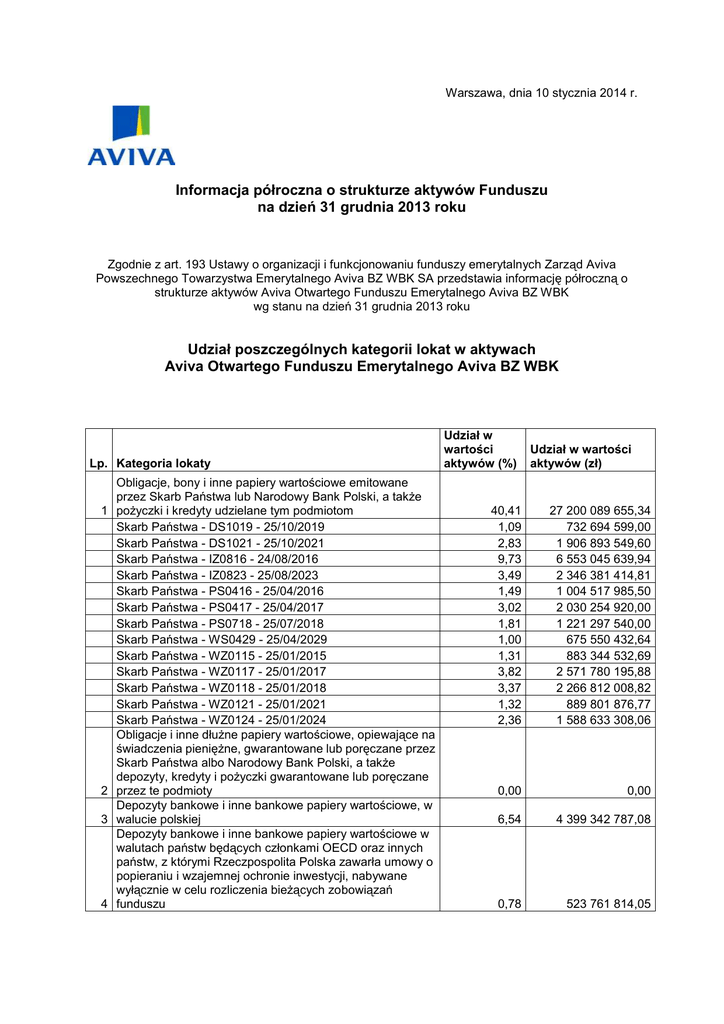 Warszawa, dnia 10 stycznia 2014 r. Informacja półroczna o strukturze aktywów Funduszu na dzień 31 grudnia 2013 roku Zgodnie z art. 193 Ustawy o organizacji i funkcjonowaniu funduszy emerytalnych Zarząd Aviva Powszechnego Towarzystwa Emerytalnego Aviva BZ WBK SA przedstawia informację półroczną o strukturze aktywów Aviva Otwartego Funduszu Emerytalnego Aviva BZ WBK wg stanu na dzień 31 grudnia 2013 roku Udział poszczególnych kategorii lokat w aktywach Aviva Otwartego Funduszu Emerytalnego Aviva BZ WBK Lp. Kategoria lokaty 1 2 3 4 Obligacje, bony i inne papiery wartościowe emitowane przez Skarb Państwa lub Narodowy Bank Polski, a także pożyczki i kredyty udzielane tym podmiotom Skarb Państwa - DS1019 - 25/10/2019 Skarb Państwa - DS1021 - 25/10/2021 Skarb Państwa - IZ0816 - 24/08/2016 Skarb Państwa - IZ0823 - 25/08/2023 Skarb Państwa - PS0416 - 25/04/2016 Skarb Państwa - PS0417 - 25/04/2017 Skarb Państwa - PS0718 - 25/07/2018 Skarb Państwa - WS0429 - 25/04/2029 Skarb Państwa - WZ0115 - 25/01/2015 Skarb Państwa - WZ0117 - 25/01/2017 Skarb Państwa - WZ0118 - 25/01/2018 Skarb Państwa - WZ0121 - 25/01/2021 Skarb Państwa - WZ0124 - 25/01/2024 Obligacje i inne dłużne papiery wartościowe, opiewające na świadczenia pieniężne, gwarantowane lub poręczane przez Skarb Państwa albo Narodowy Bank Polski, a także depozyty, kredyty i pożyczki gwarantowane lub poręczane przez te podmioty Depozyty bankowe i inne bankowe papiery wartościowe, w walucie polskiej Depozyty bankowe i inne bankowe papiery wartościowe w walutach państw będących członkami OECD oraz innych państw, z którymi Rzeczpospolita Polska zawarła umowy o popieraniu i wzajemnej ochronie inwestycji, nabywane wyłącznie w celu rozliczenia bieżących zobowiązań funduszu Udział w wartości aktywów (%) Udział w wartości aktywów (zł) 40,41 1,09 2,83 9,73 3,49 1,49 3,02 1,81 1,00 1,31 3,82 3,37 1,32 2,36 27 200 089 655,34 732 694 599,00 1 906 893 549,60 6 553 045 639,94 2 346 381 414,81 1 004 517 985,50 2 030 254 920,00 1 221 297 540,00 675 550 432,64 883 344 532,69 2 571 780 195,88 2 266 812 008,82 889 801 876,77 1 588 633 308,06 0,00 0,00 6,54 4 399 342 787,08 0,78 523 761 814,05 5 6 7 8 9 10 11 12 13 14 15 Akcje spółek notowanych na regulowanym rynku giełdowym, a także notowane na regulowanym rynku giełdowym prawa poboru, prawa do akcji oraz obligacje zamienne na akcje tych spółek BANK POLSKA KASA OPIEKI S.A. ING BANK ŚLĄSKI S.A. KGHM POLSKA MIEDŹ S.A. LPP S.A. MBANK S.A. PGE POLSKA GRUPA ENERGETYCZNA S.A. POLSKI KONCERN NAFTOWY ORLEN S.A. POLSKIE GÓRNICTWO NAFTOWE I GAZOWNICTWO S.A. POWSZECHNA KASA OSZCZĘDNOŚCI BANK POLSKI S.A. POWSZECHNY ZAKŁAD UBEZPIECZEŃ S.A. Akcje spółek notowanych na regulowanym rynku pozagiełdowym lub zdematerializowane zgodnie z przepisami ustawy z dnia 29 lipca 2005 r. o obrocie instrumentami finansowymi akcje spółek niebędące przedmiotem obrotu na rynku regulowanym, a także notowane na regulowanym rynku pozagiełdowym lub zdematerializowane, lecz nienotowane na rynku regulowanym, prawa poboru, prawa do akcji oraz obligacje zamienne na akcje tych spółek Akcje narodowych funduszy inwestycyjnych Certyfikaty inwestycyjne emitowane przez fundusze inwestycyjne zamknięte Jednostki uczestnictwa zbywane przez fundusze inwestycyjne otwarte lub specjalistyczne fundusze inwestycyjne otwarte Obligacje i inne dłużne papiery wartościowe emitowane przez jednostki samorządu terytorialnego, ich związki lub miasto stołeczne Warszawa, zdematerializowane zgodnie z przepisami ustawy z dnia 29 lipca 2005 r. o obrocie instrumentami finansowymi Inne niż zdematerializowane obligacje i inne dłużne papiery wartościowe emitowane przez jednostki samorządu terytorialnego, ich związki lub miasto stołeczne Warszawa Obligacje przychodowe, o których mowa w ustawie z dnia 29 czerwca 1995 roku o obligacjach Zdematerializowane zgodnie z przepisami ustawy z dnia 29 lipca 2005 r. o obrocie instrumentami finansowymi obligacje emitowane przez inne podmioty niż jednostki samorządu terytorialnego, ich związki, miasto stołeczne Warszawa, które zostały zabezpieczone w wysokości odpowiadającej pełnej wartości nominalnej i ewentualnemu oprocentowaniu Inne niż zdematerializowane obligacje i inne dłużne papiery wartościowe emitowane przez inne podmioty niż jednostki samorządu terytorialnego, ich związki, miasto stołeczne Warszawa, które zostały zabezpieczone w wysokości odpowiadającej pełnej wartości nominalnej i ewentualnemu oprocentowaniu Obligacje i inne dłużne papiery wartościowe emitowane przez spółki publiczne, inne niż papiery wartościowe, o których mowa w pkt. 13 i 14 41,16 3,33 1,27 1,24 1,93 1,60 1,51 2,09 27 708 385 618,81 2 240 799 974,40 858 151 808,69 837 872 018,95 1 301 396 455,84 1 078 137 865,74 1 016 909 076,37 1 403 929 525,92 1,01 681 126 638,22 5,09 2,49 3 429 087 554,64 1 675 736 168,46 0,03 0,00 17 680 529,54 0,00 0,06 37 117 612,80 0,00 0,00 0,20 131 668 351,18 0,00 0,00 0,09 61 984 543,50 0,00 0,00 0,00 0,00 0,79 533 107 405,00 16 17 18 19 20 21 Zdematerializowane zgodnie z przepisami ustawy z dnia 29 lipca 2005 r. o obrocie instrumentami finansowymi obligacje i inne dłużne papiery wartościowe inne niż w pkt. 10 i 13 Listy zastawne Kwity depozytowe, w rozumieniu ustawy z dnia 29 lipca 2005 r. o obrocie instrumentami finansowymi, dopuszczone do publicznego obrotu na rynku regulowanym na terytorium Rzeczpospolitej Polskiej Obligacje emitowane przez Bank Gospodarstwa Krajowego na zasadach określonych w ustawie z dnia 27/10/1994 o autostradach płatnych oraz o Krajowym Funduszu Drogowym BANK GOSPODARSTWA KRAJOWEGO S.A. - IDS1018 24/10/2018 BANK GOSPODARSTWA KRAJOWEGO S.A. - IPS1014 24/10/2014 Środki pieniężne Należności Katarzyna Skalska Główny Księgowy Funduszu 1,47 0,51 987 100 425,00 340 917 338,49 0,00 7,29 4 907 736 098,39 4,00 2 693 823 720,12 2,48 0,17 0,50 1 666 238 287,67 131 172 697,41 335 270 385