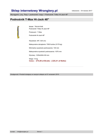 Sklep internetowy Wranglery.pl Wyciągarki, Liny, Pasy > podnośniki i trapy > Podnośnik T-Max Hi-Jack 48" Podnośnik T-Max Hi-Jack 48" Model : TM-AH1048 Podnośnik T-Max Hi-Jack 48" Producent : T-Max Podnośnik Hi-Jack 48" Wysokość: 48" (120 cm) Maksymalne obciążenie: 7000 funtów (3175 kg) Minimalna wysokość podnoszenia: 130 mm Maksymalna wysokość podnoszenia: 1070 mm Wymiary: 1235x245x140 mm Waga: 14 kg Cena : 275,00 zł Brutto ( 225,41 zł Netto) Dostępność: Produkt dostępny w naszym sklepie od 01 wrzesień 2010 kontakt : - [email protected] Strona 1 Utworzono : 04 marzec 2017