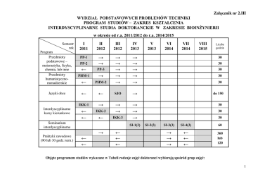 Załącznik nr 2.III WYDZIAŁ PODSTAWOWYCH PROBLEMÓW TECHNIKI PROGRAM STUDIÓW – ZAKRES KSZTAŁCENIA INTERDYSCYPLINARNE STUDIA DOKTORANCKIE W ZAKRESIE BIOINŻYNIERII w okresie od r.a. 2011/2012 do r.a. 2014/2015 Semestr rok Program Przedmioty podstawowe – matematyka, fizyka, chemia, lub inne Przedmioty humanistycznomenadżerskie Języki obce Interdyscyplinarne kursy kierunkowe I 2011 II 2012 III 2012 IV 2013 PP-1 PP-2 → → ← PP-3 PHM-1 → ← PHM-2 → → → → → → → → → → ← ← SJO → IKK-1 → ← ← IKK-2 → → ← IKK-3 → → → Seminarium interdyscyplinarne Praktyki zawodowe (90 lub 30 godz./sem.) SI-1(3) → ← ← ← ← ← V 2013 VI 2014 VII 2014 VIII 2015 Liczba godzin 30 30 30 30 30 do 150 30 30 30 SI-2(3) SI-3(3) SI-4(3) 60 → → → ← ← ← 360 lub 120 Objęte programem studiów wykazane w Tabeli rodzaje zajęć doktoranci wybierają spośród grup zajęć: 1 Załącznik nr 2.III WYDZIAŁ PODSTAWOWYCH PROBLEMÓW TECHNIKI PROGRAM STUDIÓW – ZAKRES KSZTAŁCENIA INTERDYSCYPLINARNE STUDIA DOKTORANCKIE W ZAKRESIE BIOINŻYNIERII PRZEDMIOTY PODSTAWOWE [PP] ( łącznie co najmniej 90 h) PP: 1-2-3 DCH01 Spektroskopia molekularna FZP9386 Modelowanie zjawisk i procesów fizycznych metodami algebry komputerowej (Maple, j. ang.) MAP9899 Wstęp do statystyki praktycznej (j. ang.) FZP9954 Procesy kinetyczne. Teoria i eksperyment. WIZP podstawowe wykłady Profesorów Wizytujących (organizowane w PWr.) lub inne kursy uzgodnione z Kierownikiem Studiów Doktoranckich INTERDYSCYPLINARNE KURSY KIERUNKOWE [IKK] (łącznie co najmniej 90 h) IKK: 1-2-3 NOWE KURSY OBLIGATORYJNE ISDK1 Rola inżynierii biomedycznej w medycynie opartej na przewidywaniu, prewencji i spersonalizowanym podejściu do pacjenta ISDK2 Biologiczne maszyny molekularne: nauka, ekonomia, społeczeństwo ISDK3 Fizykochemia diagnostyki i terapii antynowotworowej WIZK 30 h 30 h 30 h 30 h 30 h 30 h 30 h kierunkowe wykłady Profesorów Wizytujących (organizowane w PWr.) lub inne kursy uzgodnione z Kierownikiem Studiów Doktoranckich PRZEDMIOTY HUMANISTYCZNO-MENADŻERSKIE [PHM] PHM: 1-2 (łącznie co najmniej 60 h) NOWE KURSY E-LEARNINGOWE (co najmniej jeden obligatoryjny) ISDPHM-1 Estetyka przestrzeni rozwój zrównoważony. Aspekty kulturowe, socjologiczne i filozoficzne ISDPHM-2 Globalizacja mobilności: wyzwania i zagrożenia. Aspekty humanistyczne rozwoju środków transportu i technologii inżynierii środowiska ISDPHM-3 Inżynieria biomedyczna: Etyka i Prawo. Człowiek w perspektywie technologii biomedycznych 30 h 30 h 30 h 2 Załącznik nr 2.III WYDZIAŁ PODSTAWOWYCH PROBLEMÓW TECHNIKI PROGRAM STUDIÓW – ZAKRES KSZTAŁCENIA INTERDYSCYPLINARNE STUDIA DOKTORANCKIE W ZAKRESIE BIOINŻYNIERII KURSY STANDARDOWE MAP9923 Profesjonalny skład tekstu w systemie LaTex FZP9854 Historia nauk przyrodniczych JZL1179C Kultura języka. Poprawność językowa w pracy naukowej 30h DCH11 Etyczne problemy nauki 30 h 30 h 30 h lub inne kursy uzgodnione z Kierownikiem Studiów Doktoranckich SEMINARIUM: INTERDYSCYPLINARNE [SI] przygotowujące do złożenia rozprawy doktorskiej (łącznie 60 h) SI -1-2 ISDSI-1(3) Seminarium interdyscyplinarne w zakresie bioinżynierii ISDSI-2(3) Seminarium interdyscyplinarne w zakresie bioinżynierii ISDSI-3(3) Seminarium interdyscyplinarne w zakresie bioinżynierii ISDSI-4(3) Seminarium interdyscyplinarne w zakresie bioinżynierii 15 h/sem 15 h/sem 15 h/sem 15 h/sem Język obcy nowożytny w wymiarze do150 godzin – realizowany w Studium Języków Obcych [SJO], zakończony egzaminem. Praktyki zawodowe – w formie zajęć dydaktycznych prowadzonych samodzielnie przez doktoranta lub na zasadzie uczestniczenia w ich prowadzeniu – po 90 godzin w każdym roku akademickim, w którym doktorant otrzymuje stypendium w ramach Projektu „Młoda kadra 2015 plus”, lub stypendium doktoranckie, albo po 30 godzin w każdym roku akademickim, w którym doktorant nie otrzymuje żadnego z tych stypendiów. 3