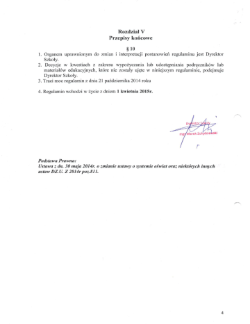 Rozdział V Przepisy końcowe §10 1. Organem uprawnionym do zmian i interpretacji postanowień regulaminu jest Dyrektor Szkoły. 2. Decyzje w kwestiach z zakresu wypożyczania lub udostępniania podręczników lub materiałów edukacyjnych, które nie zostały ujęte w niniejszym regulaminie, podejmuje Dyrektor Szkoły. 3. Traci moc regulamin z dnia 21 października 2014 roku 4. Regulamin wchodzi w życie z dniem 1 kwietnia 2015r. Podstawa Prawna: Ustawa z dn. 30 maja 2014r. o zmianie ustawy o systemie oświat oraz niektórych innych ustaw DZ. U. Z 2014rpoz.811. 4