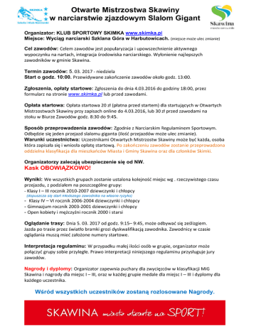 Otwar rte Misttrzostw wa Ska awiny w narrciarstw wie zjazzdowy ym Slalom Gig gant Organiza ator: KLUB B SPORTO OWY SKIM MKA www..skimka.pll Miejsce: W Wyciąg na arciarski Szklana S G Góra w Harrbutowicach. (miejscee może ulec zm mianie) Cel zawo odów: Celem zawodów w jest popullaryzacja i u upowszechn nienie aktyw wnego wypoczynkku na nartacch, integraccja środowisska narciarsskiego. Wyłonienie naj lepszych zawodnikó ów w gminiee Skawina. Termin za awodów: 5. 03. 2017 ‐ niedziela Start o go odz. 10:00 0. Przewidyw wane zakońńczenie zaw wodów około godz. 13:000. Zgłoszen nia, opłaty startowe:: Zgłoszeniaa do dnia 4.03.2016 do o godziny 188:00, przez formularz na stronie w www.skimk ka.pl lub prrzed zawodaami. O owa 20 zł (ppłatna przed d startem) d dla startująccych w Otw wartych Opłata sttartowa: Opłata starto Mistrzostw wach Skawin ny przy zapiisach onlinee do 4.03.20 016, lub 30 zł przed zaw wodami na stoku w Biurze Zawod dów godz. 8 8:30 do 9:455. Sposób p przeprowa adzenia za awodów: ZZgodnie z Narciarskim R Regulamineem Sportow wym. Odbędzie ssię jeden prrzejazd slalo omu gigantaa (ilość prze ejazdów mo oże ulec zmiianie). Warunki uczestnic ctwa: Uczesstnikami Ot wartych Miistrzostw Skkawiny możże być każdaa, osoba która zapissała się i wn niosła opłatę ę startową. Po zakończzeniu zawod dów zostan ie przeprow wadzona oddzielna kklasyfikacja dla mieszkkańców Mia sta i Gminyy Skawina orraz dla członnków Skimkki. Organiza atorzy zale ecają ubez zpieczenie e się od NW W. Kask OB BOWIĄZ ZKOWO! We wszystkiich grupach h zostanie usstalona kole ejność miejsc wg . rzecczywistego cczasu Wyniki: W przejazdu, z podziałem m na poszczzególne gru py: ‐ Klasy I – III rocznik 20 010‐2007 dziewczynki i chłopcy (dopuszcza się start młod dszego zawod dnika na własn ne ryzyko) - Klasy IV –– VI rocznikk 2006‐2004 4 dziewczynnki i chłopcyy - Gimnazju um rocznik 2 2003‐2001 dziewczynkki i chłopcy - Open kob biety i mężcczyźni roczn nik 2000 i st arsi Oglądanie trasy: Dnia 5. 03. 2017 od god z. 9:15– 9:4 45, może od dbywać się zześlizgiem. mki grozi dyyskwalifikaccją zawodnika. Zawodnnicy w czasie Jazda po trrasie przez śświatło bram oglądania muszą miećć założone n numery starrtowe. acja regulaminu: W przypadku małej ilości osób w grupie, organnizator może e Interpreta połączyć grupy sobie przyległe. P Prawo interppretacji niniejszego reg gulaminu prrzysługuje jury zawodów. Nagrody i dyplomy y: Organizator zapewnnia puchary dla zwycięzzców w klassyfikacji MiG G Skawina i n nagrody dlaa miejsc I – IIII, oraz w k ażdej grupie medale dla miejsc I –– III i dyplom my dla każdego ucczestnika. Wśrród wszy ystkich uczestnik ków zostaną rozlo osowane e Nagrod dy.