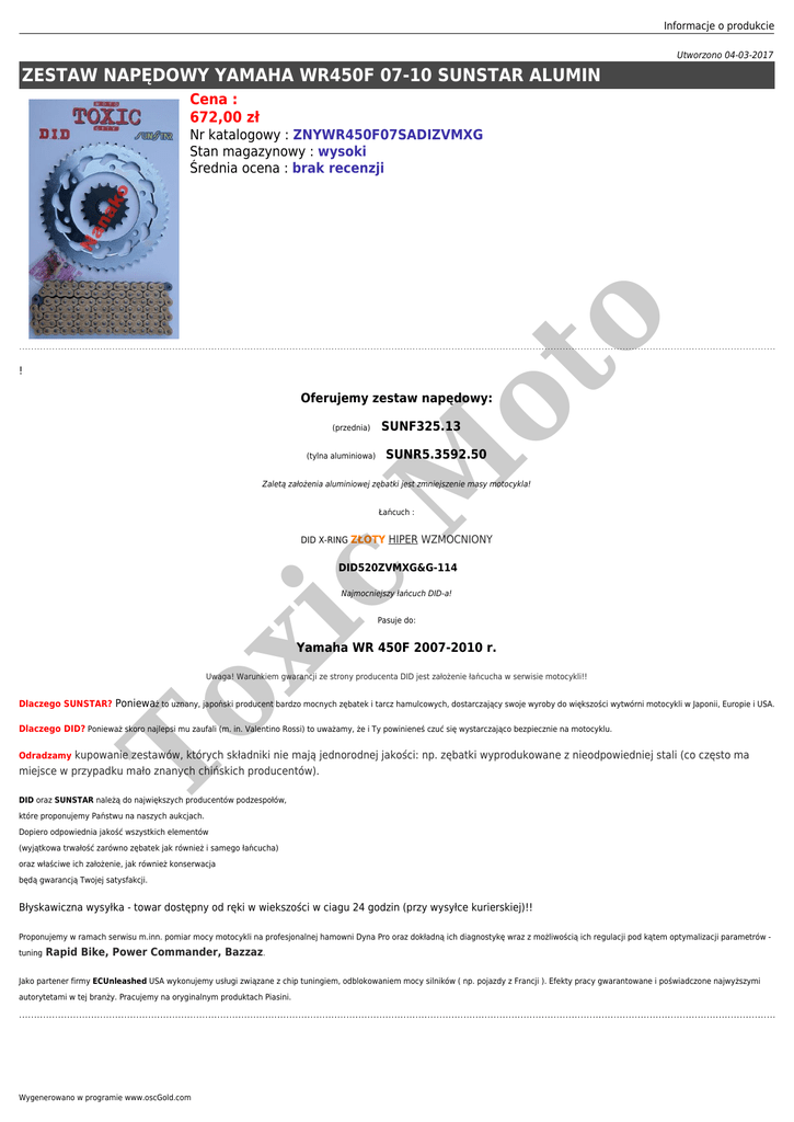 Informacje o produkcie Utworzono 04-03-2017 ZESTAW NAPĘDOWY YAMAHA WR450F 07-10 SUNSTAR ALUMIN Cena : 672,00 zł ot o Nr katalogowy : ZNYWR450F07SADIZVMXG Stan magazynowy : wysoki Średnia ocena : brak recenzji ! Oferujemy zestaw napędowy: (przednia) SUNR5.3592.50 M (tylna aluminiowa) SUNF325.13 Zaletą założenia aluminiowej zębatki jest zmniejszenie masy motocykla! Łańcuch : DID X-RING ZŁOTY HIPER WZMOCNIONY c DID520ZVMXG&G-114 xi Najmocniejszy łańcuch DID-a! Pasuje do: Yamaha WR 450F 2007-2010 r. Uwaga! Warunkiem gwarancji ze strony producenta DID jest założenie łańcucha w serwisie motocykli!! To Dlaczego SUNSTAR? Ponieważ to uznany, japoński producent bardzo mocnych zębatek i tarcz hamulcowych, dostarczający swoje wyroby do większości wytwórni motocykli w Japonii, Europie i USA. Dlaczego DID? Ponieważ skoro najlepsi mu zaufali (m. in. Valentino Rossi) to uważamy, że i Ty powinieneś czuć się wystarczająco bezpiecznie na motocyklu. Odradzamy kupowanie zestawów, których składniki nie mają jednorodnej jakości: np. zębatki wyprodukowane z nieodpowiedniej stali (co często ma miejsce w przypadku mało znanych chińskich producentów). DID oraz SUNSTAR należą do największych producentów podzespołów, które proponujemy Państwu na naszych aukcjach. Dopiero odpowiednia jakość wszystkich elementów (wyjątkowa trwałość zarówno zębatek jak również i samego łańcucha) oraz właściwe ich założenie, jak również konserwacja będą gwarancją Twojej satysfakcji. Błyskawiczna wysyłka - towar dostępny od ręki w wiekszości w ciagu 24 godzin (przy wysyłce kurierskiej)!! Proponujemy w ramach serwisu m.inn. pomiar mocy motocykli na profesjonalnej hamowni Dyna Pro oraz dokładną ich diagnostykę wraz z możliwością ich regulacji pod kątem optymalizacji parametrów tuning Rapid Bike, Power Commander, Bazzaz. Jako partener firmy ECUnleashed USA wykonujemy usługi związane z chip tuningiem, odblokowaniem mocy silników ( np. pojazdy z Francji ). Efekty pracy gwarantowane i poświadczone najwyższymi autorytetami w tej branży. Pracujemy na oryginalnym produktach Piasini. Wygenerowano w programie www.oscGold.com