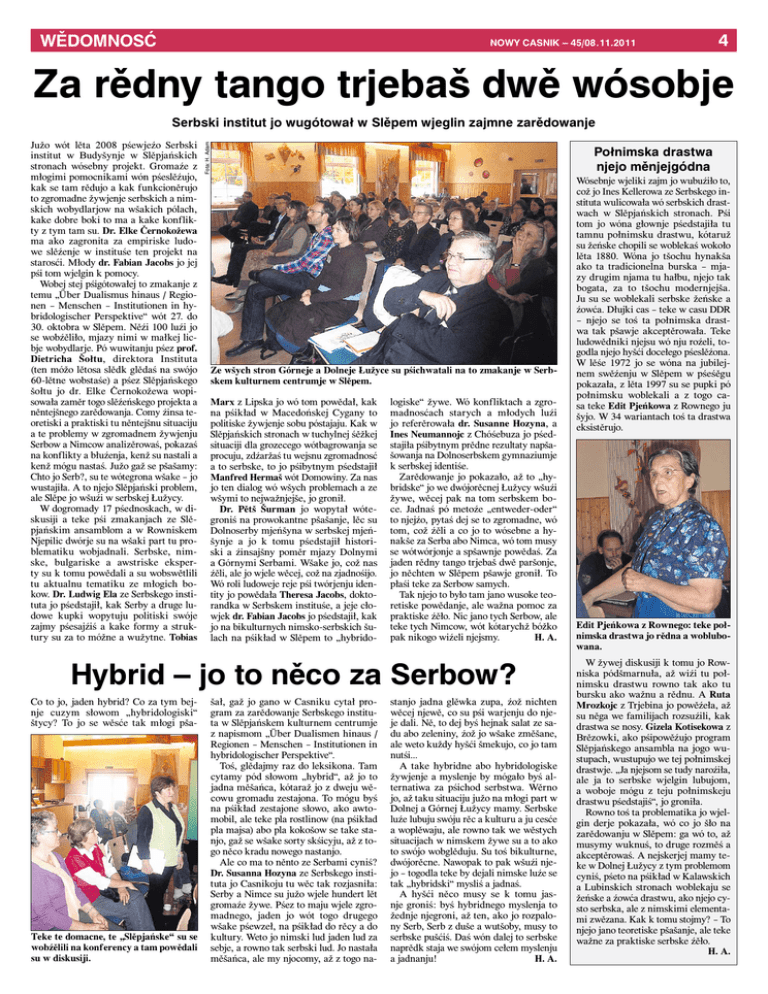 wědomnosć NOWY CASNIK – 45/08.11.2011 4 Za rědny tango trjebaš dwě wósobje Južo wót lěta 2008 pśewjeźo Serbski institut w Budyšynje w Slěpjańskich stronach wósebny projekt. Gromaźe z młogimi pomocnikami wón pśeslěźujo, kak se tam rědujo a kak funkcioněrujo to zgromadne žywjenje serbskich a nim skich wobydlarjow na wšakich pólach, kake dobre boki to ma a kake konflikty z tym tam su. Dr. Elke Černokožewa ma ako zagronita za empiriske ludowe slěźenje w instituśe ten projekt na starosći. Młody dr. Fabian Jacobs jo jej pśi tom wjelgin k pomocy. Wobej stej pśigótowałej to zmakanje z temu „Über Dualismus hinaus / Regio nen – Menschen – Institutionen in hy bridologischer Perspektive“ wót 27. do 30. oktobra w Slěpem. Něźi 100 luźi jo se wobźěliło, mjazy nimi w małkej lic bje wobydlarje. Pó wuwitanju pśez prof. Dietricha Šołtu, direktora Instituta (ten móžo lětosa slědk glědaś na swójo 60-lětne wobstaśe) a pśez Slěpjańskego šołtu jo dr. Elke Černokožewa wopi sowała zaměr togo slěźeńskego projekta a něntejšnego zarědowanja. Comy źinsa teoretiski a praktiski tu něntejšnu situaciju a te problemy w zgromadnem žywjenju Serbow a Nimcow analizěrowaś, pokazaś na konflikty a błuźenja, kenž su nastali a kenž mógu nastaś. Južo gaž se pšašamy: Chto jo Serb?, su te wótegrona wšake – jo wustajiła. A to njejo Slěpjański problem, ale Slěpe jo wšuźi w serbskej Łužycy. W dogromady 17 pśednoskach, w di skusiji a teke pśi zmakanjach ze Slě pjańskim ansamblom a w Rowniskem Njepilic dwórje su na wšaki part tu problematiku wobjadnali. Serbske, nim ske, bulgariske a awstriske eksperty su k tomu powědali a su wobswětlili tu aktualnu tematiku ze młogich bokow. Dr. Ludwig Ela ze Serbskego insti tuta jo pśedstajił, kak Serby a druge ludowe kupki wopytuju politiski swóje zajmy pśesajźiś a kake formy a struktury su za to móžne a wužytne. Tobias Fota: H. Adam Serbski institut jo wugótował w Slěpem wjeglin zajmne zarědowanje Połnimska drastwa njejo měnjejgódna Ze wšych stron Górneje a Dolneje Łužyce su pśichwatali na to zmakanje w Serb skem kulturnem centrumje w Slěpem. Marx z Lipska jo wó tom powědał, kak na pśikład w Macedońskej Cygany to politiske žywjenje sobu póstajaju. Kak w Slěpjańskich stronach w tuchylnej śěžkej situaciji dla grozecego wótbagrowanja se procuju, zdźaržaś tu wejsnu zgromadnosć a to serbske, to jo pśibytnym pśedstajił Manfred Hermaš wót Domowiny. Za nas jo ten dialog wó wšych problemach a ze wšymi to nejwažnjejše, jo gronił. Dr. Pětš Šurman jo wopytał wóte groniś na prowokantne pšašanje, lěc su Dolnoserby mjeńšyna w serbskej mjeń šynje a jo k tomu pśedstajił historiski a źinsajšny poměr mjazy Dolnymi a Górnymi Serbami. Wšake jo, což nas źěli, ale jo wjele wěcej, což na zjadnośijo. Wó roli ludoweje reje pśi twórjenju identity jo powědała Theresa Jacobs, dokto randka w Serbskem instituśe, a jeje cło wjek dr. Fabian Jacobs jo pśedstajił, kak jo na bikulturnych nimsko-serbskich šu lach na pśikład w Slěpem to „hybrido logiske“ žywe. Wó konfliktach a zgro madnosćach starych a młodych luźi jo referěrowała dr. Susanne Hozyna, a Ines Neumannojc z Chóśebuza jo pśed stajiła pśibytnym prědne rezultaty napša šowanja na Dolnoserbskem gymnaziumje k serbskej identiśe. Zarědowanje jo pokazało, až to „hybridske“ jo we dwójorěcnej Łužycy wšuźi žywe, wěcej pak na tom serbskem boce. Jadnaś pó metoźe „entweder-oder“ to njejźo, pytaś dej se to zgromadne, wó tom, což źěli a co jo to wósebne a hy nakše za Serba abo Nimca, wó tom musy se wótwórjonje a spšawnje powědaś. Za jaden rědny tango trjebaš dwě paršonje, jo něchten w Slěpem pšawje gronił. To płaśi teke za Serbow samych. Tak njejo to było tam jano wusoke teo retiske powědanje, ale wažna pomoc za praktiske źěło. Nic jano tych Serbow, ale teke tych Nimcow, wót kótarychž bóžko pak nikogo wiźeli njejsmy. H. A. Hybrid – jo to něco za Serbow? Co to jo, jaden hybrid? Co za tym bej nje cuzym słowom „hybridologiski“ štycy? To jo se wěsće tak młogi pša Teke te domacne, te „Slěpjańske“ su se wobźělili na konferency a tam powědali su w diskusiji. šał, gaž jo gano w Casniku cytał program za zarědowanje Serbskego instituta w Slěpjańskem kulturnem centrumje z napismom „Über Dualismen hinaus / Regionen – Menschen – Institutionen in hybridologischer Perspektive“. Toś, glědajmy raz do leksikona. Tam cytamy pód słowom „hybrid“, až jo to jadna měšańca, kótaraž jo z dweju wě cowu gromadu zestajona. To mógu byś na pśikład zestajone słowo, ako awtomobil, ale teke pla rostlinow (na pśikład pla majsa) abo pla kokošow se take sta njo, gaž se wšake sorty skśicyju, až z togo něco kradu nowego nastanjo. Ale co ma to něnto ze Serbami cyniś? Dr. Susanna Hozyna ze Serbskego instituta jo Casnikoju tu wěc tak rozjasniła: Serby a Nimce su južo wjele hundert lět gromaźe žywe. Pśez to maju wjele zgromadnego, jaden jo wót togo drugego wšake pśewzeł, na pśikład do rěcy a do kultury. Weto jo nimski lud jaden lud za sebje, a rowno tak serbski lud. Jo nastała měšańca, ale my njocomy, až z togo na- stanjo jadna glěwka zupa, źož nichten wěcej njewě, co su pśi warjenju do njeje dali. Ně, to dej byś hejnak salat ze sadu abo zeleniny, źož jo wšake změšane, ale weto kuždy hyšći šmekujo, co jo tam nutśi... A take hybridne abo hybridologiske žywjenje a myslenje by mógało byś alternatiwa za pśichod serbstwa. Wěrno jo, až taku situaciju južo na młogi part w Dolnej a Górnej Łužycy mamy. Serbske luźe lubuju swóju rěc a kulturu a ju cesće a woplěwaju, ale rowno tak we wěstych situacijach w nimskem žywe su a to ako to swójo wobglěduju. Su toś bikulturne, dwójorěcne. Nawopak to pak wšuźi njejo – togodla teke by deja