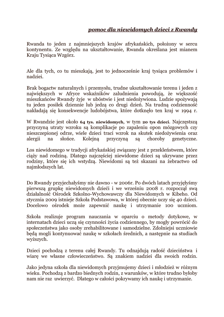 pomoc dla niewidomych dzieci z Rwandy Rwanda to jeden z najmniejszych krajów afrykańskich, położony w sercu kontynentu. Ze względu na ukształtowanie, Rwanda określana jest mianem Kraju Tysiąca Wzgórz. Ale dla tych, co tu mieszkają, jest to jednocześnie kraj tysiąca problemów i nadziei. Brak bogactw naturalnych i przemysłu, trudne ukształtowanie terenu i jeden z największych w Afryce wskaźników zaludnienia powodują, że większość mieszkańców Rwandy żyje w ubóstwie i jest niedożywiona. Ludzie spożywają tu jeden posiłek dziennie lub jedzą co drugi dzień. Na trudną codzienność nakładają się konsekwencje ludobójstwa, które dotknęło ten kraj w 1994 r. W Rwandzie jest około 64 tys. niewidomych, w tym 20 tys dzieci. Najczęstszą przyczyną utraty wzroku są komplikacje po zapaleniu opon mózgowych czy nieszczepionej odrze, wiele dzieci traci wzrok na skutek niedożywienia oraz alergii na słońce. Kolejną przyczyną są choroby genetyczne. Los niewidomego w tradycji afrykańskiej związany jest z przekleństwem, które ciąży nad rodziną. Dlatego najczęściej niewidome dzieci są ukrywane przez rodziny, które się ich wstydzą. Niewidomi są też skazani na żebractwo od najmłodszych lat. Do Rwandy przyjechałyśmy nie dawno - w 2006r. Po dwóch latach przyjęłyśmy pierwszą grupkę niewidomych dzieći i we wrześniu 2008 r. rozpoczął swą działalność Ośrodek Szkolno-Wychowawczy dla Niewidomych w Kibeho. Od stycznia 2009 istnieje Szkoła Podstawowa, w której obecnie uczy się 40 dzieci. Docelowo ośrodek może zapewnić naukę i utrzymanie 100 uczniom. Szkoła realizuje program nauczania w oparciu o metody dotykowe, w internatach dzieci uczą się czynności życia codziennego, by mogły powrócić do społeczeństwa jako osoby zrehabilitowane i samodzielne. Zdolniejsi uczniowie będą mogli kontynuować naukę w szkołach średnich, a następnie na studiach wyższych. Dzieci pochodzą z terenu całej Rwandy. Tu odnajdują radość dzieciństwa i wiarę we własne człowieczeństwo. Są znakiem nadziei dla swoich rodzin. Jako jedyna szkoła dla niewidomych przyjmujemy dzieci i młodzież w różnym wieku. Pochodzą z bardzo biednych rodzin, z warunków, w które trudno byłoby nam nie raz uwierzyć. Dlatego w całości pokrywamy ich naukę i utrzymanie. Miesięczny koszt utrzymania jednego dziecka w naszym ośrodku wynosi 120 PLN. Pragniemy wykształcić jak najwięcej niewidomych dzieci w Rwandzie, ale przede wszystkim otoczyć je miłością i pewnością, że pomimo swego kalectwa są kochane i godne miłości. Nie będzie to jednak możliwe bez wsparcia ludzi o otwartych sercach i dobrej woli. Ci z Państwa, którzy zechcieliby zaangażować sie w dzieło pomocy dla naszych niewidomych dzieci z Rwandy, zapraszamy, by złożyli swój dar wpłacając na konto lub wybierając formę adopcji serca. Dla tych, którzy deklarują pomoc w formie adopcji serca - wysyłamy regularne informacje pocztą elektroniczną. Zawierają one informacje o podopiecznym wraz ze zdjęciami, a kiedy dziecko nauczy się pisać - samo tez bierze udział w korespondencji ze swoim adopcyjnym rodzicem. W tym wypadku nie jest to więc bezimienny dar ale żywy kontakt z konkretnym dzieckiem. Dzieci codziennie modlą sie za swoich adopcyjnych rodziców, a co pewien są za nich sprawowane Msze Święte z udziałem dzieci. Jeżeli dla kogoś jest to zbyt duży koszt, można adoptować jedno dziecko wspólnie (w rodzinie, w klasie, we wspólnocie). Będziemy wdzięczni nawet za pomoc tylko w części utrzymania. Dzięki adopcji serca dziecko otrzyma wsparcie i możliwość kształcenia się, a my - ogromną pomoc, by otaczając je miłością dla zrodzenia w nich pewności, że pomimo swego kalectwa, sa kochane i godne miłosci - zapewnić im to co niezbędne do życia i rozwoju w pełni człowieczeństwa. Osoby zainteresowane ADOPCJĄ SERCA prosimy o kontakt: s. Jana Maria Educational Institute for Blind Kibeho B. P. 449 Butare, Rwanda Africa Centrale e-mail: [email protected] Wszystkim tym, którzy pragną nam pomóc i współpracować z nami w zapewnieniu szczęśliwego i godnego dzieciństwa jak i nadziei na lepszą przyszłość niewidomych dzieci w Rwandzie, składamy serdeczne Bóg zapłać i obiecujemy wdzięczna pamięć w naszych modlitwach. źródło: http://www.triuno.pl/afryka-rwanda.html