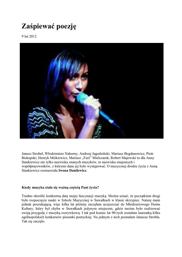 Zaśpiewać poezję 9 lut 2012 Janusz Strobel, Włodzimierz Nahorny, Andrzej Jagodziński, Mariusz Bogdanowicz, Piotr Biskupski, Henryk Miśkiewicz, Mariusz „Fazi” Mielczarek, Robert Majewski to dla Anny Stankiewicz nie tylko nazwiska znanych muzyków, to nazwiska znajomych i współpracowników, z którymi dane jej było występować. O muzycznej drodze życia z Anną Stankiewicz rozmawiała Iwona Danilewicz. Kiedy muzyka stała się ważną częścią Pani życia? Trudno określić konkretną datę mojej fascynacji muzyką. Można uznać, że początkiem drogi było rozpoczęcie nauki w Szkole Muzycznej w Suwałkach w klasie skrzypiec. Naturę mam jednak poszukującą, więc kilka lat później zaczęłam uczęszczać do Młodzieżowego Domu Kultury, który był chyba w Suwałkach jedynym miejscem, gdzie można było realizować swoją przygodę z muzyką rozrywkową. I tak pod koniec lat 90-tych zostałam laureatką kilku ogólnopolskich konkursów piosenki poetyckiej. Na jednym z nich poznałam Janusza Strobla. Tak się zaczęło. A w tej chwili na jakim etapie „muzycznej ścieżki” znajduje się Pani? Nagrywa Pani płytę, koncertuje, może planuje Pani wyjechać za granicę? Koncertów nigdy dość. Nie narzekam na brak pracy. Im jest jej więcej, tym mam większą motywację do działania i natchnienie do realizacji dalszych pomysłów. Co do wyjazdów za granicę, nie wiąże ich z zawodem. Chyba, że koncertuję dla środowisk polonijnych, a to dlatego, że z wyboru śpiewam po polsku. Śpiewam teksty poetyckie, które bardzo trudno jest przetłumaczyć w taki sposób, żeby oddać sens, jaki za sobą niosą i wrażliwość autora – to wszystko, co jest między wierszami. Jeśli chodzi o moją drogę muzyczną, to niewiele się zmieniło, jestem tylko na innym jej etapie. Poszukuję nadal, z tym, że zupełnie innych rzeczy niż na początku. Rzeczywiście, przede mną praca nad płytą. Pracę nad tym materiałem zaczęłam już jakiś czas temu. Jest to płyta zawierająca piosenki Janusza Strobla do tekstów Jonasza Kofty i Jana Wołka. Będzie to pierwsza płyta, która scala piosenkarską twórczość Janusza Strobla. Co ciekawe – w większości zawierać będzie utwory, które wcześniej nigdy nie były realizowane, pomimo iż Jonasz Kofta nie żyje już od 24 lat. Cieszę się, że Janusz Strobel trzymał je tak długo w przysłowiowej szufladzie. Niezwykle nobilitujący jest dla mnie fakt, że Jan Wołek kilka nowych piosenek na tę płytę napisał specjalnie dla mnie. Czy płyta ma już tytuł? Na razie został jej nadany tytuł: „STROBEL KOFTA WOŁEK – PIOSENKI w wykonaniu Anny Stankiewicz”. Wiem, że te nazwiska na pewno pojawią się na okładce płyty. Jak się Pani współpracuje z tak znanymi artystami? Czy można porównać to doświadczenie z pracą w Suwałkach? W Suwałkach nie pracowałam z profesjonalistami. Była to raczej grupa nie tyle amatorów, bo to słowo niesie za sobą negatywne konotacje, ile młodych osób, które chciały grać. Współpracowałam z pianistą Radkiem Szulcem i Wiesławem Jarmocem, który jako instruktor z MDK wziął to pod swoją opiekę. Moje profesjonalne śpiewanie zaczęło się od współpracy z Januszem Stroblem. Za tym otworzyła się furtka do grania z takimi artystami jak Włodzimierz Nahorny, Andrzej Jagodziński i jego trio, Mariusz Bogdanowicz, Piotr Biskupski, Henryk Miśkiewicz, Mariusz „Fazi” Mielczarek, Robert Majewski. Z większością z nich aktualnie nagrywam płytę. Czy można tę pracę rozpatrywać w kategoriach wyzwania? Oczywiście. Praca z tak wybitnymi, legendarnymi wręcz muzykami to wyzwanie i przeżycie. Muzyka jest w pewnym sensie językiem, jest zapisywalna, można ją odtwarzać. Wyzwaniem jest tworzenie, a nie odtwarzanie tego, co zapisane. Myślę, że tak jest zarówno dla instrumentalistów, którzy „rozkodowują” nutowy język i dla piosenkarzy, którzy – poza muzyką, przekazują napisany tekst. Ja mam szczęście obserwować, jak wspaniałą muzykę Janusza Strobla tworzą wybitni artyści, sama zaś mam przyjemność tworzyć siebie w znakomitych tekstach Jana Wołka i Jonasza Kofty. Fot. Archiwum prywatne Anny Stankiewicz