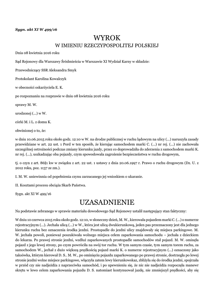 Sygn. akt XI W 499/16 WYROK W IMIENIU RZECZYPOSPOLITEJ POLSKIEJ Dnia 08 kwietnia 2016 roku Sąd Rejonowy dla Warszawy Śródmieścia w Warszawie XI Wydział Karny w składzie: Przewodniczący SSR Aleksandra Smyk Protokolant Karolina Kowalczyk w obecności oskarżyciela E. K. po rozpoznaniu na rozprawie w dniu 08 kwietnia 2016 roku sprawy M. W. urodzonej (...) w W. córki M. i L. z domu K. obwinionej o to, że: w dniu 10.06.2015 roku około godz. 12:10 w W. na drodze publicznej w ruchu lądowym na ulicy (...) naruszyła zasady przewidziane w art. 22 ust. 1 Pord w ten sposób, że kierując samochodem marki C. (...) nr rej. (...) nie zachowała szczególnej ostrożności podczas zmiany kierunku jazdy, przez co doprowadziła do zderzenia z samochodem marki K. nr rej. (...), uszkadzając oba pojazdy, czym spowodowała zagrożenie bezpieczeństwa w ruchu drogowym, tj. o czyn z art. 86§1 kw w związku z art. 22 ust. 1 ustawy z dnia 20.06.1997 r. Prawo o ruchu drogowym (Dz. U. z 2012 roku, poz. 1137 ze zm.). I. M. W. uniewinnia od popełnienia czynu zarzucanego jej wnioskiem o ukaranie. II. Kosztami procesu obciąża Skarb Państwa. Sygn. akt XI W 499/16 UZASADNIENIE Na podstawie zebranego w sprawie materiału dowodowego Sąd Rejonowy ustalił następujący stan faktyczny: W dniu 10 czerwca 2015 roku około godz. 12:10, w słoneczny dzień, M. W., kierowała pojazdem marki C. (...) o numerze rejestracyjnym (...). Jechała ulicą (...) w W., która jest ulicą dwukierunkową, jeden pas przeznaczony jest dla jednego kierunku ruchu bez oznaczenia środka jezdni. Prostopadle do jezdni ulicy znajdowały się miejsca parkingowe. M. W. jechała powoli, ponieważ poszukiwała wolnego miejsca celem zaparkowania samochodu – jechała z dzieckiem do lekarza. Po prawej stronie jezdni, wzdłuż zaparkowanych prostopadle samochodów stał pojazd. M. W. ominęła pojazd z jego lewej strony, po czym powróciła na swój tor ruchu. W tym samym czasie, tym samym torem ruchu, za samochodem W., jechał z dużo większą prędkością pojazd marki K. o numerze rejestracyjnym (...) oznaczony jako taksówka, którym kierował D. S.. M. W., po ominięciu pojazdu zaparkowanego po prawej stronie, dostrzegła po lewej stronie jezdni wolne miejsce parkingowe, włączyła zatem lewy kierunkowskaz, zbliżyła się do środka jezdni, spojrzała w przód czy nie nadjeżdża z naprzeciwka samochód, i po upewnieniu się, że nic nie nadjeżdża rozpoczęła manewr skrętu w lewo celem zaparkowania pojazdu D. S. natomiast kontynuował jazdę, nie zmniejszył prędkości, aby się zatrzymać i rozpoczął manewr wyprzedzania pojazdu sygnalizującego zamiar skręcenia w lewo z jego lewej strony. Na pasie ruchu przeciwnym do kierunku ruchu pojazdów doszło do ich zderzenia. W samochodzie marki C. (...) doszło do wgniecenia oraz obtarcia powłoki lakierniczej na przednim błotniku lewym i lewym progu na długości od przedniego lewego koła do połowy drzwi przednich lewych, na wysokości błotnika do kierunkowskazu bocznego oraz na wysokości drzwi do lusterka bocznego. W samochodzie marki K. natomiast uszkodzeniu, wgnieceniu i obtarciu uległa powłoka lakiernicza prawego przedniego błotnika na długości od osi koła do klosza lampy przedniej. Ponadto nastąpiło obtarcie i wgniecenie przedniego zderzaka oraz klosza lampy przedniej prawej, obtarcie opony prawej przedniej, obtarcie i pęknięcie kołpaka koła przedniego, obtarcie i wgniecenie klapy silnika nad kloszem świateł przednim prawym, pęknięcie zderzaka przy atrapie silnika oraz wybicie atrapy z mocowania. O. kierowcy byli trzeźwi. Powyższy stan faktyczny ustalono na podstawie: - wyjaśnień obwinionej M. W. (k.48), - nagrania na płycie CD (k.18), - protokołów oględzin (k. 4, 5), - protokołów z przebiegu badania stanu trzeźwości urządzeniem elektronicznym (k.6, 7), - notatki urzędowej (k.1) oraz innych dowodów zawnioskowanych wnioskiem o ukaranie do przeprowadzenia na rozprawie. Obwiniona M. W. przyznała się do popełnienia zarzucanego jej czynu, lecz wyjaśniła, iż zapamiętała zdarzenie inaczej niż jest to przedstawione we wniosku o ukaranie. Jednak z filmu, który przedstawił drugi uczestnik i ze słów policjantki zdarzenie wyglądało jeszcze inaczej, dlatego przyznała się do popełnienia czynu i poddała karze. Wyjaśniła, że nie widziała kierującego, który jechał za nią. Podała, że w dniu zdarzenia jechała dosyć wolno z chorym dzieckiem do lekarza i szukała wolnego miejsca do parkowania, a gdy je zobaczyła włączyła kierunkowskaz, zobaczyła, że z naprzeciwka nic nie jedzie i rozpoczęła manewr. Zanim doszło do zdarzenia musiała ominąć samochód stojący po prawej stronie jezdni, a po jego ominięciu wróciła na swój pas. Miała wątpliwości czy kierujący samochodem K., który ją wyprzedzał „na trzeciego”, nie widząc tego co jest przed nią działa prawidłowo. Została jednak poinformowana o swojej winie przez policjantkę konsultującą sprawę z innym funkcjonariuszem. Obwiniona wyjaśniła ponadto, że na miejsce kolizji przybyli policjanci, którzy nie stwierdzili jej winy, zaproponowali zaś mandat kierującemu pojazdem K., lecz on odmówił jego przyjęcia. Podała także, że po zdarzeniu podeszło do niej dwóch mężczyzn, którzy widzieli zdarzenie i stwierdzili do niej, że była to wina taksówkarza. Chciała wezwania Policji po wizycie z dzieckiem u lekarza, natomiast drugi uczestnik kolizji wezwał Policję podczas jej pobytu u lekarza. Podała zapamiętane uszkodzenia pojazdów, dodatkowo wyjaśniła, że na jezdni nie ma wymalowanych pasów ruchu, a ulica jest dwukierunkowa, jeden pas dla jednego kierunku ruchu. Sąd dał wiarę wyjaśnieniom obwinionej albowiem znajdują one potwierdzenie w pozostałym materiale dowodowym zebranym w sprawie, a w szczególności w pełni korespondują z nagraniem znajdującym się na płycie CD przedstawiającym faktyczny i rzeczywisty przebieg zdarzen