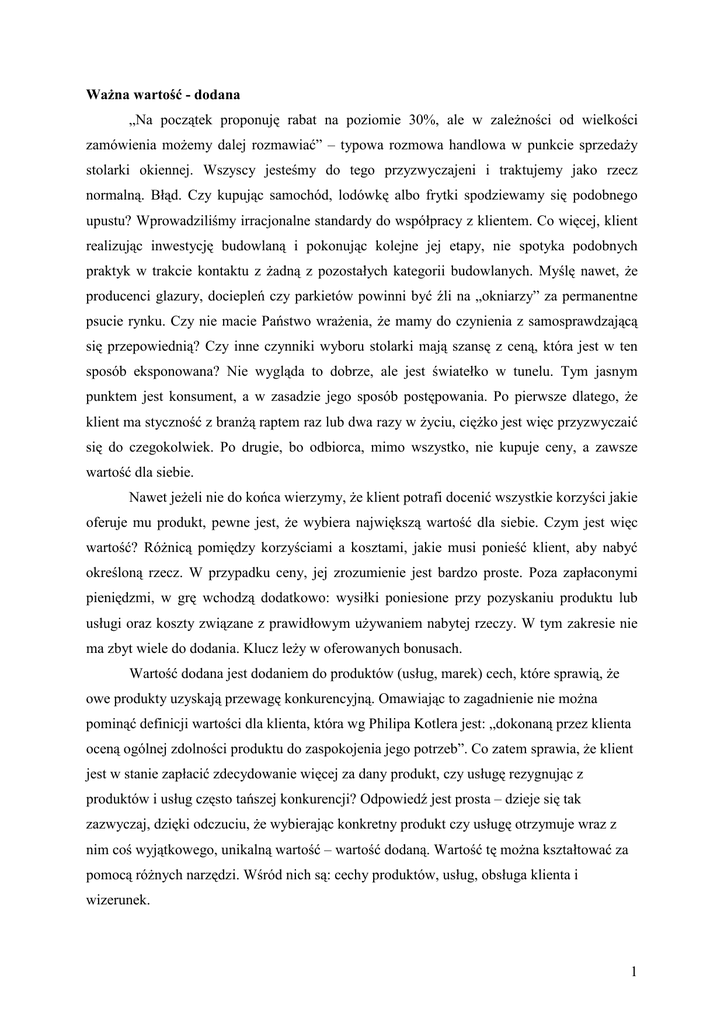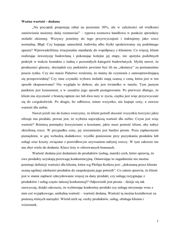 WaŜna wartość - dodana „Na początek proponuję rabat na poziomie 30%, ale w zaleŜności od wielkości zamówienia moŜemy dalej rozmawiać” – typowa rozmowa handlowa w punkcie sprzedaŜy stolarki okiennej. Wszyscy jesteśmy do tego przyzwyczajeni i traktujemy jako rzecz normalną. Błąd. Czy kupując samochód, lodówkę albo frytki spodziewamy się podobnego upustu? Wprowadziliśmy irracjonalne standardy do współpracy z klientem. Co więcej, klient realizując inwestycję budowlaną i pokonując kolejne jej etapy, nie spotyka podobnych praktyk w trakcie kontaktu z Ŝadną z pozostałych kategorii budowlanych. Myślę nawet, Ŝe producenci glazury, dociepleń czy parkietów powinni być źli na „okniarzy” za permanentne psucie rynku. Czy nie macie Państwo wraŜenia, Ŝe mamy do czynienia z samosprawdzającą się przepowiednią? Czy inne czynniki wyboru stolarki mają szansę z ceną, która jest w ten sposób eksponowana? Nie wygląda to dobrze, ale jest światełko w tunelu. Tym jasnym punktem jest konsument, a w zasadzie jego sposób postępowania. Po pierwsze dlatego, Ŝe klient ma styczność z branŜą raptem raz lub dwa razy w Ŝyciu, cięŜko jest więc przyzwyczaić się do czegokolwiek. Po drugie, bo odbiorca, mimo wszystko, nie kupuje ceny, a zawsze wartość dla siebie. Nawet jeŜeli nie do końca wierzymy, Ŝe klient potrafi docenić wszystkie korzyści jakie oferuje mu produkt, pewne jest, Ŝe wybiera największą wartość dla siebie. Czym jest więc wartość? RóŜnicą pomiędzy korzyściami a kosztami, jakie musi ponieść klient, aby nabyć określoną rzecz. W przypadku ceny, jej zrozumienie jest bardzo proste. Poza zapłaconymi pieniędzmi, w grę wchodzą dodatkowo: wysiłki poniesione przy pozyskaniu produktu lub usługi oraz koszty związane z prawidłowym uŜywaniem nabytej rzeczy. W tym zakresie nie ma zbyt wiele do dodania. Klucz leŜy w oferowanych bonusach. Wartość dodana jest dodaniem do produktów (usług, marek) cech, które sprawią, Ŝe owe produkty uzyskają przewagę konkurencyjną. Omawiając to zagadnienie nie moŜna pominąć definicji wartości dla klienta, która wg Philipa Kotlera jest: „dokonaną przez klienta oceną ogólnej zdolności produktu do zaspokojenia jego potrzeb”. Co zatem sprawia, Ŝe klient jest w stanie zapłacić zdecydowanie więcej za dany produkt, czy usługę rezygnując z produktów i usług często tańszej konkurencji? Odpowiedź jest prosta – dzieje się tak zazwyczaj, dzięki odczuciu, Ŝe wybierając konkretny produkt czy usługę otrzymuje wraz z nim coś wyjątkowego, unikalną wartość – wartość dodaną. Wartość tę moŜna kształtować za pomocą róŜnych narzędzi. Wśród nich są: cechy produktów, usług, obsługa klienta i wizerunek. 1 NaleŜy podkreślić, Ŝe wartość dodana kreowana przez firmę i postrzegana przez klientów nie musi być toŜsama. Nasze, jako producenta, przekonanie o wspaniałej ofercie jaką mamy dla odbiorcy to za mało. To rynek weryfikuje, czy tak jest w rzeczywistości. Bardzo często o tym zapominamy. Marketingowa wartość dodana to pojęcie bardzo abstrakcyjne, które moŜna interpretować subiektywnie. Podobnie jest z wartością konsumencką - poziomem standardu produktów i usług jak i systematyzowaniem pozycji marki. Dla jednego klienta standardem moŜe być czterostrefowa klimatyzacja i telefon z wbudowanym aparatem fotograficznym, a dla drugiego samochód z ręcznym nawiewem i komórka, która jedynie mieści się w kieszeni.. Wartość dodana zmienia się równieŜ w czasie. To co dziś uchodzi za luksus, za chwilę moŜe być jedynie standardem. Samochód w wersji podstawowej i ten sam samochód posiadający elektrycznie regulowane szyby róŜnią się ceną – to oczywiste. Bardzo często dzieje się tak, Ŝe cena tego drugiego nie wynika jedynie z kosztów uŜytych materiałów i robocizny. Samochód z elektrycznymi szybami moŜe kosztować więcej, poniewaŜ oferuje konsumentowi wartość dodaną jaką w tym przypadku jest „uwolnienie od kręcenia korbą”. Oczywiście dobry sprzedawca będzie potrafił przedstawić wiele argumentów przemawiających za elektrycznie sterowanymi szybami. Przykładowo: odsuwanie w trakcie jazdy szyby od strony pasaŜera moŜe uchronić samotnie jadącego kierowcę przed przeziębieniem, otworzenie w czasie postoju wszystkich szyb zajmie jedynie kilka sekund itd. Ten prosty przykład pokazuje, iŜ marketing w dzisiejszych czasach to przede wszystkim sprzedaŜ marzeń. Podobnie jest ze sprzedaŜą wartości dodanej i ukazaniem jej konsumentowi. Oprócz zwiększania wartości uŜytkowej produktów, ulepszaniu opakowań itp. firmy tworzą wartość dodaną oferując klientowi - piękno. Przedmioty projektowane przez znanych stylistów często osiągają duŜo wyŜsze ceny od tradycyjnych. Podobnie jest z poziomem marŜy (uwzględniając oczywiście płace projektantów). Dobrym przykładem tworzenia wartości dodanej poprzez wzornictwo jest działalność giganta branŜy meblowej - IKEA. Wiele wyrobów IKEA jest produkowanych przez popularnych stylistów. Za sprawą tego produkty zdobywają uznanie wielu odbiorców i osiągają wyŜszy poziom marŜ. Z drugiej jednak strony, przewagą konkurencyjną szwedzkiego giganta jest cały system sprzedaŜy. To równieŜ ma ogromne znaczenie dla konsumenta. Wykreowanie wartości dodanej usług jest często waŜniejsze niŜ wykreowanie wartości dodanej produktów. Wartość dodana instytucji finansowych i ubezpieczeniowych to przede wszystkim tradycja, zaufanie lub zindywidualizowane podejście do klienta. Szczególnie 2 zaufanie posiada tą właściwość, Ŝe moŜna je szybko stracić i nigdy nie odzyskać. Firmy usługowe powinny pamiętać więc o nieustannej potrzebie budowania wartości dodanej. Wartość dodana budowana przez cechy i jakość produktów jest bardzo waŜna. Firmy, które o niej zapominają mogą przegrać w batalii o konsumenta. Jest zrozum