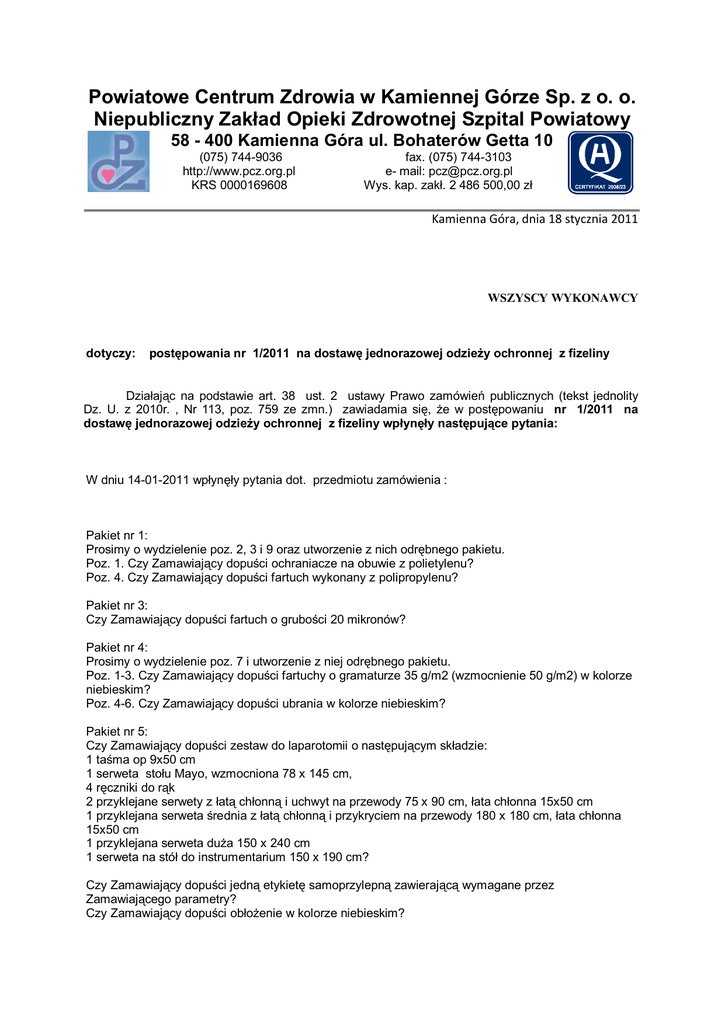 Powiatowe Centrum Zdrowia w Kamiennej Górze Sp. z o. o. Niepubliczny Zakład Opieki Zdrowotnej Szpital Powiatowy 58 - 400 Kamienna Góra ul. Bohaterów Getta 10 (075) 744-9036 http://www.pcz.org.pl KRS 0000169608 fax. (075) 744-3103 e- mail: [email protected] Wys. kap. zakł. 2 486 500,00 zł Kamienna Góra, dnia 18 stycznia 2011 WSZYSCY WYKONAWCY dotyczy: postępowania nr 1/2011 na dostawę jednorazowej odzieży ochronnej z fizeliny Działając na podstawie art. 38 ust. 2 ustawy Prawo zamówień publicznych (tekst jednolity Dz. U. z 2010r. , Nr 113, poz. 759 ze zmn.) zawiadamia się, że w postępowaniu nr 1/2011 na dostawę jednorazowej odzieży ochronnej z fizeliny wpłynęły następujące pytania: W dniu 14-01-2011 wpłynęły pytania dot. przedmiotu zamówienia : Pakiet nr 1: Prosimy o wydzielenie poz. 2, 3 i 9 oraz utworzenie z nich odrębnego pakietu. Poz. 1. Czy Zamawiający dopuści ochraniacze na obuwie z polietylenu? Poz. 4. Czy Zamawiający dopuści fartuch wykonany z polipropylenu? Pakiet nr 3: Czy Zamawiający dopuści fartuch o grubości 20 mikronów? Pakiet nr 4: Prosimy o wydzielenie poz. 7 i utworzenie z niej odrębnego pakietu. Poz. 1-3. Czy Zamawiający dopuści fartuchy o gramaturze 35 g/m2 (wzmocnienie 50 g/m2) w kolorze niebieskim? Poz. 4-6. Czy Zamawiający dopuści ubrania w kolorze niebieskim? Pakiet nr 5: Czy Zamawiający dopuści zestaw do laparotomii o następującym składzie: 1 taśma op 9x50 cm 1 serweta stołu Mayo, wzmocniona 78 x 145 cm, 4 ręczniki do rąk 2 przyklejane serwety z łatą chłonną i uchwyt na przewody 75 x 90 cm, łata chłonna 15x50 cm 1 przyklejana serweta średnia z łatą chłonną i przykryciem na przewody 180 x 180 cm, łata chłonna 15x50 cm 1 przyklejana serweta duża 150 x 240 cm 1 serweta na stół do instrumentarium 150 x 190 cm? Czy Zamawiający dopuści jedną etykietę samoprzylepną zawierającą wymagane przez Zamawiającego parametry? Czy Zamawiający dopuści obłożenie w kolorze niebieskim? Pakiet nr 6: Prosimy o wydzielenie poz. 2 i utworzenie z niej odrębnego pakietu. Poz. 1. Czy zgodnie z wymogami minimalnymi zawartymi w SIWZ Zamawiający dopuści serwetę dwuwarstwową z otworem 6x8 cm? W załączniku „g” zawarty jest wymóg serwety trójwarstwowej. Poz. 3. Czy zgodnie z wymogami minimalnymi zawartymi w SIWZ Zamawiający dopuści serwetę dwuwarstwową o wymiarach 50x60 cm lub 75x90 cm? W załączniku „g” zawarty jest wymóg serwety trójwarstwowej. Poz. 4. Czy zgodnie z wymogami minimalnymi zawartymi w SIWZ Zamawiający dopuści serwetę dwuwarstwową o wymiarach 50x60 cm? W załączniku „g” zawarty jest wymóg serwety trójwarstwowej. Poz. 5. Czy Zamawiający dopuści serwetę na stolik Mayo o wymiarach 78x145 cm? Pakiet nr 7: Czy Zamawiający dopuści osłonę na kończynę o gramaturze 60 g/m2, grubości folii 33 mikronów i pakowaną po 2 szt. z odpowiednim przeliczeniem? Pakiet nr 9: Czy Zamawiający dopuści zestaw do cięcia cesarskiego o następującym składzie: 1 serweta stołu Mayo 78 x 145 cm, wzmocniona 4 ręczniki do rąk 1 taśma op 9 x 50 cm 1 prześcieradło dla dziecka 75 x 120 cm 1 serweta do cięcia cesarskiego 330x230 cm, torebka na płyny, warstwa ochronna z otworem 36 x 36 cm, uchwyt na przewody 1 serweta na stół do instrumentarium 150 x 190 cm oraz fartuchy pakowane osobno (1 szt./opakowanie jednostkowe) i wliczone w cenę pozycji? W tym samym dniu wpłynęły kolejne pytania: Pytania 1 Pakiet 5 pozycja 1 Czy Zamawiający dopuści obłożenie o składzie: 1 x Serweta na stolik 150 x 190cm 1 x Pokrowiec na stolik Mayo 80 x 140 cm 1 x Serweta samoprzylepna 2-warstwy, 150 x 180cm 1 x Serweta samoprzylepna 2-warstwy, 150 x 240cm 2 x Serweta samoprzylepna 2-warstwy, 75 x 90cm 2 x Ręcznik do rąk 30 x 30cm? Pytania 2 Pakiet 6 pozycja 1 Czy Zamawiający dopuści serwetę w rozmiarze 50 x 75cm, spełniającą pozostałe wymagania SIWZ? Pytania 3 Pakiet 6 pozycja 2 Czy Zamawiający dopuści serwetę samoprzylepną, dwuwarstwową w rozmiarze 50 x 75 cm z otworem ø7cm? Pytania 4 Pakiet 6 pozycja 2 Czy Zamawiający dopuści serwetę samoprzylepną, dwuwarstwową w rozmiarze 50 x 75 cm z otworem 6x8cm? Pytania 5 Pakiet 6 pozycja 3 Czy Zamawiający dopuści serwetę w rozmiarze 50 x 70cm, spełniającą pozostałe wymagania SIWZ? Pytania 6 Pakiet 6 pozycja 5 Czy Zamawiający dopuści serwetę na stolik Mayo w rozmiarze 80 x 140 cm? Pytania 7 Pakiet 7 pozycja 1 Czy Zamawiający dopuści osłonę na kończynę wykonaną z włókniny SMS o wadze 50 g/m2? Pytania 8 Pakiet 7 pozycja 1 Czy Zamawiający dopuści osłonę na kończynę w rozmiarze 70 x 120 cm w opakowaniu a’ 2 szt z przeliczeniem podanych ilości? Odpowiedzi nastąpią w terminie późniejszym. Z poważaniem Prezes Zarządu mgr Wiktor Król