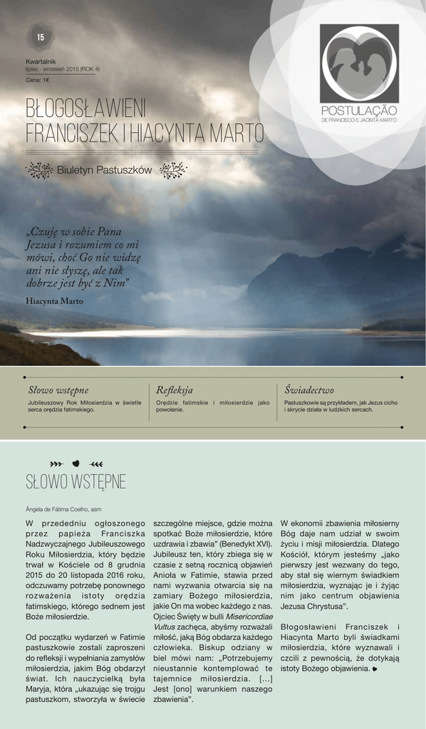 15 Kwartalnik lipiec · wrzesień 2015 (ROK 4) Cena: 1€ BŁOGOSŁAWIENI FRANCISZEK i HIACYNTA MARTO Biuletyn Pastuszków „Czuję w sobie Pana Jezusa i rozumiem co mi mówi, choć Go nie widzę ani nie słyszę, ale tak dobrze jest być z Nim” Hiacynta Marto Słowo wstępne Jubileuszowy Rok Miłosierdzia w świetle serca orędzia fatimskiego. Refleksja Orędzie fatimskie i miłosierdzie jako powołanie. Świadectwo Pastuszkowie są przykładem, jak Jezus cicho i skrycie działa w ludzkich sercach. Słowo wstępne Ângela de Fátima Coelho, asm W przededniu ogłoszonego pr zez papieża Franciszka Nadzwyczajnego Jubileuszowego Roku Miłosierdzia, który będzie trwał w Kościele od 8 grudnia 2015 do 20 listopada 2016 roku, odczuwamy potrzebę ponownego rozważenia istoty orędzia fatimskiego, którego sednem jest Boże miłosierdzie. Od początku wydarzeń w Fatimie pastuszkowie zostali zaproszeni do refleksji i wypełniania zamysłów miłosierdzia, jakim Bóg obdarzył świat. Ich nauczycielką była Maryja, która „ukazując się trojgu pastuszkom, stworzyła w świecie szczególne miejsce, gdzie można spotkać Boże miłosierdzie, które uzdrawia i zbawia” (Benedykt XVI). Jubileusz ten, który zbiega się w czasie z setną rocznicą objawień Anioła w Fatimie, stawia przed nami wyzwania otwarcia się na zamiary Bożego miłosierdzia, jakie On ma wobec każdego z nas. Ojciec Święty w bulli Misericordiae Vultus zachęca, abyśmy rozważali miłość, jaką Bóg obdarza każdego człowieka. Biskup odziany w biel mówi nam: „Potrzebujemy nieustannie kontemplować te tajemnice miłosierdzia. […] Jest [ono] warunkiem naszego zbawienia”. W ekonomii zbawienia miłosierny Bóg daje nam udział w swoim życiu i misji miłosierdzia. Dlatego Kościół, którym jesteśmy „jako pierwszy jest wezwany do tego, aby stał się wiernym świadkiem miłosierdzia, wyznając je i żyjąc nim jako centrum objawienia Jezusa Chrystusa”. Błogosławieni Franciszek i Hiacynta Marto byli świadkami miłosierdzia, które wyznawali i czcili z pewnością, że dotykają istoty Bożego objawienia. BIULETYN PASTUSZKÓW • LIPIEC · WRZESIEŃ Refleksja „Chce przez was okazać światu wiele miłosierdzia” Pięć chlebów i dwie ryby, czyli miłosierdzie jako powołanie. „Duch Pana Boga nade mną […] aby obwieszczać rok łaski Pańskiej” (Iz 61, 1-2) Pedro Valinho Gomes N ie znamy jego imienia. Nie znamy imienia chłopca, który podążał za Jezusem na drugi brzeg Jeziora Galilejskiego; szedł wraz z tłumem głodnym słowa wiekuistego, spragnionym sensu w świecie jałowym i targanym konwulsjami (por. J 6, 5-15). W tłumie był także ten bezimienny chłopiec. Nic nie wyróżniało go spośród innych wygłodniałych i spragnionych ludzi. Nic, tylko te pięć chlebów i dwie ryby. Ale mimo, że miał chleby i ryby, ten chłopiec także był głodny i spragniony. Inaczej głodny i inaczej spragniony. Oddając chleby i ryby w ręce Jezusa – aby celebrować rozmnożenie, które daje życie w obfitości – chłopiec oddaje wszystko. Ten prosty gest jest jak pokorne i ufne fiat. Być może ten chłopiec wiedział, że prawdziwie głodny jest innej strawy, że prawdziwie pragnie innego napoju. Być może, patrząc wnikliwe w głąb siebie, widział, że chleby i ryby mogą zaspokoić ten prawdziwy głód, tylko wtedy, gdy zostaną dotknięte przez Źródło Życia; że pożywienie zaspokaja prawdziwy głód tylko wtedy, gdy jest podzielone ze współczuciem i miłosierdziem. Chleby i ryby, naznaczone przemieniającym błogosławieństwem Jezusa, są widocznym i skutecznym znakiem innego chleba, który zaspokaja inny, bardziej fundamentalny głód – głód samego Boga. Łucja, Franciszek i Hiacynta reagują tak samo jak bezimienny chłopiec. Znamy ich imiona dlatego, że dzieci te wszystko ofiarowały Bogu, który przez nich chciał „okazać światu miłosierdzie” (Wspomnienia siostry Łucji, s. 81) i uczynić cud pomnożenia daru. W ich zwyczajnym życiu ofiarowanie się Bogu za innych czynione jest przez proste gesty, a to dlatego, że cud miłości podzielonej między ludzi buduje się poprzez siłę Boga działającego w Tak jak chłopiec z pięcioma chlebami i dwoma rybami, mali pasterze z Fatimy mają świadomość, że dar jaki mają do ofiarowania jest skromny: „Jak mamy pełnić ofiary? Co my mamy, aby ofiarować?” (por. Wspomnienia siostry Łucji, s. 81). Ale wiedzą także – jak wie ewangeliczny chłopiec – że Bóg o nic więcej ich nie prosi, tylko o dar z siebie, który zostanie pomnożony przez dotknięcie Boga. I to wszystko. Ufne i pokorne oddanie się Bogu, który staje się obecny, da – dzięki pomnażającej sile miłości – początek uczcie, która nakarmi wielu. Bo chleb dotknięty przez Boga zaspakaja ten prawdziwy, podstawowy i zasadniczy głód. Życie małych pasterzy, życie każdego człowieka dotknięte przez światło Boga, staje się chlebem, który zaspokoi głód wieczności u wielu. Wyrazić słabościach i niedostatkach (por. 2 Kor 12, 10). Chleb i ryby, czułość dzieci i szczodrość maluczkich… Widzący z Fatimy czynią tak jak bezimienny chłopiec, który w pięciu chlebach i dwóch rybach dzieli się sobą z głodnym tłumem. Są naznaczeni zamysłami miłosierdzia, a jest to Boże miłosierdzie, które wyznaczy granice ich oddania. Dzieci miłują Tego, który jest miłosierdziem; w żarliwym dialogu między ich sercami a sercem Boga wcielają w życie Jego współczucie dla ludzi; pragną intensywnie być dla bliźnich znakiem Bożej miłości, a u Boga wstawiać się za nimi. Wezwane, aby być na obraz i podobieństwo (por. Gen 1, 26) tego, który jest Miłością (por. 1 J 4, 8), żyją miłosierdziem, które uzupełnia niedostatki miłości. “Są naznaczeni zamysłami miłosierdzia, a jest to Boże miłosierdzie, które wyznaczy granice ich oddania.” zgodę na to, by stać się chlebem to przyjąć logikę inną niż t