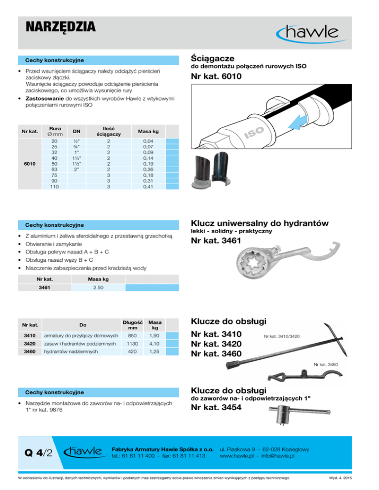 NARZĘDZIA Ściągacze Cechy konstrukcyjne • Przed wsunięciem ściągaczy należy odciążyć pierścień zaciskowy złączki. Wsunięcie ściągaczy powoduje odciążenie pierścienia zaciskowego, co umożliwia wysunięcie rury do demontażu połączeń rurowych ISO Nr kat. 6010 • Zastosowanie do wszystkich wyrobów Hawle z wtykowymi połączeniami rurowymi ISO Nr kat. 6010 Rura Ø mm 20 25 32 40 50 63 75 90 110 Ilość ściągaczy 2 2 2 2 2 2 3 3 3 DN ½" ¾" 1" 1¼" 1½" 2" O Masa kg IS 0,04 0,07 0,09 0,14 0,19 0,36 0,18 0,31 0,41 Klucz uniwersalny do hydrantów Cechy konstrukcyjne • Z aluminium i żeliwa sferoidalnego z przestawną grzechotką • Otwieranie i zamykanie lekki - solidny - praktyczny Nr kat. 3461 • Obsługa pokryw nasad A + B + C • Obsługa nasad węży B + C • Niszczenie zabezpieczenia przed kradzieżą wody Nr kat. Masa kg 3461 2,50 Nr kat. Do Długość mm Masa kg 3410 armatury do przyłączy domowych 850 1,90 3420 zasuw i hydrantów podziemnych 1130 4,10 3460 hydrantów nadziemnych 420 1,25 Klucze do obsługi Nr kat. 3410 Nr kat. 3420 Nr kat. 3460 Nr kat. 3410/3420 Nr kat. 3460 Klucze do obsługi Cechy konstrukcyjne • Narzędzie montażowe do zaworów na- i odpowietrzających 1" nr kat. 9876 Q 4/2 do zaworów na- i odpowietrzających 1" Nr kat. 3454 Fabryka Armatury Hawle Spółka z o.o. tel.: 61 81 11 400 - fax: 61 81 11 413 ul. Piaskowa 9 - 62-028 Koziegłowy www.hawle.pl - [email protected] W odniesieniu do ilustracji, danych technicznych, wymiarów i podanych mas zastrzegamy sobie prawo wnoszenia zmian wynikających z postępu technicznego. Wyd. 4. 2015
