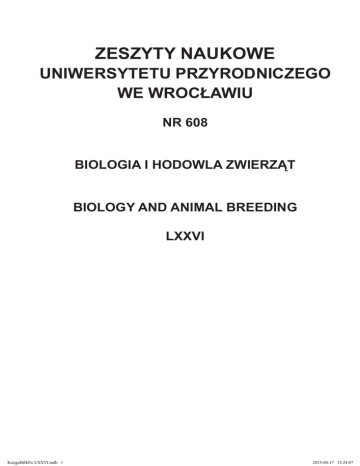 ZESZYTY NAUKOWE uniwersytetu przyrodniczego WE WROCŁAWIU nr 608 Biologia i hodowla zwierząt biology and animal breeding LXXVI KsięgaBiHZw LXXVI.indb 1 2015-04-17 13:24:07 KsięgaBiHZw LXXVI.indb 2 2015-04-17 13:24:07 ZESZYTY NAUKOWE uniwersytetu przyrodniczego WE WROCŁAWIU nr 608 Biologia i hodowla zwierząt biology and animal breeding LXXVI WROCŁAW 2015 KsięgaBiHZw LXXVI.indb 3 2015-04-17 13:24:08 Redaktor merytoryczny dr hab. inż. Wojciech Kruszyński Redaktor statystyczny dr Roman Dąbrowski Redakcja Elżbieta Winiarska-Grabosz Korekta Magdalena Kozińska Łamanie Teresa Alicja Chmura Projekt okładki Grażyna Kwiatkowska Covered by: Agro, Index Copernicus, EBSCO, Zoological Record © Copyright by Uniwersytet Przyrodniczy we Wrocławiu, Wrocław 2015 Print edition is an original (reference) edition ISSN 1897–208X ISSN 1897–8223 WYDAWNICTWO UNIWERSYTETU PRZYRODNICZEGO WE WROCŁAWIU Redaktor Naczelny – prof. dr hab. inż. Andrzej Kotecki ul. Sopocka 23, 50-344 Wrocław, tel./fax 71 328 12 77 e-mail: [email protected] Nakład 100 + 16 egz. Ark. druk. 3,0. Ark. wyd. 2,6 Druk i oprawa: BETA-DRUK Bernadeta Rękas ul. Tęczowa 84, 53-603 Wrocław KsięgaBiHZw LXXVI.indb 4 2015-04-17 13:24:08 Spis treści Słowo wstępne................................................................................................................... 7 1. K. Górski, L. Saba – Wpływ dodatku mieszanki mineralnej na poziom wybranych mikroelementów w sierści krów mlecznych rasy polskiej holsztyńsko-fryzyjskiej.............................................................................................. 9 2. P. Indykiewicz, L. Jerzak, R. Graczyk – Częstotliwość karmienia piskląt wróbla Passer domesticus (l.) i mazurka Passer montanus (L.) a kompensacja niedoboru pokarmu ................................................................................................. 19 3. R. Niżnikowski, G. Czub, J. Kamiński, M. Nieradko, M. Świątek, K. Głowacz, M. Ślęzak – Polimorfizm genu kodującego brązowe umaszczenie tyrp-1 w pozycji 215 u owiec utrzymywanych na podlasiu............................................... 31 4. W.S. Proskura, A. Dybus, A. Łukaszewicz, E. Hardziejewicz, E. Pawlina – Polimorfizm pojedynczego nukleotydu w genach dehydrogenazy mleczanowej a (ldha) i kreatyny piór (f-ker) a wyniki lotowe gołębia domowego................ 37 KsięgaBiHZw LXXVI.indb 5 2015-04-17 13:24:08 Contents Introduction........................................................................................................................ 8 1. K. Górski, L. Saba – Influence of a mineral mixture on the level of selected microelements in hair of Polish holstein-friesian cows............................................. 9 2. P. Indykiewicz, L. Jerzak, R. Graczyk – Frequency of feeding nestlings by house sparrow Passer domesticus (l.) and tree sparrow Passer montanus (l.) and food compensation deficiency after periods of stress ...................................... 19 3. R. Niżnikowski, G. Czub, J. Kamiński, M. Nieradko, M. Świątek, K. Głowacz, M. Ślęzak – Polymorphism of TYRP-1 gene in position 215 in sheep brreds from Podlaskie Voivodeship.................................................................................... 31 4. W.S. Proskura, A. Dybus, A. Łukaszewicz, E. Hardziejewicz, E. Pawlina – The single nucleotide polymorphisms in lactate dehydrogenase-a (ldha) and feather keratin (f-ker) genes and racing performance of domestic pigeon 37 KsięgaBiHZw LXXVI.indb 6 2015-04-17 13:24:08 Szanowni Czytelnicy, Oddajemy do Waszych rąk kolejny zeszyt LXXVI/2015 Biologia i Hodowla Zwierząt, publikowany w serii Zeszyty Naukowe Uniwersytetu Przyrodniczego we Wrocławiu. Zeszyt ten, tak jak poprzednie, poświęcony jest szerokiej tematyce przyrodniczej. Zamieszczone prace uzyskały pozytywną recenzję naukową wydaną przez uznane autorytety w każdej z dziedzin. Czasopismo naukowe Uniwersytetu Przyrodniczego we Wrocławiu jest kwartalnikiem. Podstawową formą wydawniczą czasopisma jest tradycyjna forma drukowana, lecz jest ono także widoczne w Internecie, a jego upowszechnianie wspierają światowe instytucje indeksujące takie jak: Agro, Index Copernicus, EBSCO, Zoological Record. Obecnie w rankingu Komitetu Badań Naukowych polskich czasopism naukowych czasopismo zostało wycenione na 7 pkt. Zachęcamy Państwa do współpracy z naszą serią oraz do jej upowszechniania w szerokim środowisku naukowym i zawodowym. Z poważaniem, Wydawnictwo KsięgaBiHZw LXXVI.indb 7 2015-04-17 13:24:08 Dear Readers, It is our great pleasure to present you the latest issue of the Scientific Journal of Wrocław University of Environmental and Life Sciences: LXXVI/2015 Biology and Animal Breeding. Like the previous issues, it contains publications on a wide range of topics from the field of natural sciences. All published papers received positive non-anonymous reviews of relevant scientific authorities. The Scientific Journal of Wrocław University of Environmental and Life Sciences is a quarterly. Our journal is available not only in a printed format, but also on the Internet and it may be accessed via such database services as Agro, Index Copernicus, EBSCO, Zoological Record. In recognition of our achievements, we have been granted 7 points in the scientific journal ranking of the State Committee for Scientific Research. We kindly invite you to cooperate with us and we would like to encourage you to promote our journal among the members of your scientific and professional community. With best regards, Publishing House Team KsięgaBiHZw LXXVI.indb 8 2015-04-17 13:24:08 ZESZYTY NAUKOWE UNIWERSYTETU PRZYRODNICZEGO WE WROCŁAWIU 2015 BIOLOGIA I HODOWLA ZWIERZĄT LXXVI NR 608 Krzysztof Górski1, Leon Saba2 WPŁYW DODATKU MIESZANKI MINERALNEJ NA POZIOM WYBRANYCH MIKROELEMENTÓW W SIERŚCI KRÓW MLECZNYCH RASY POLSKIEJ HOLSZTYŃSKO-FRYZYJSKIEJ1 INFLUENCE OF A MINERAL MIXTURE ON THE LEVEL OF SELEC