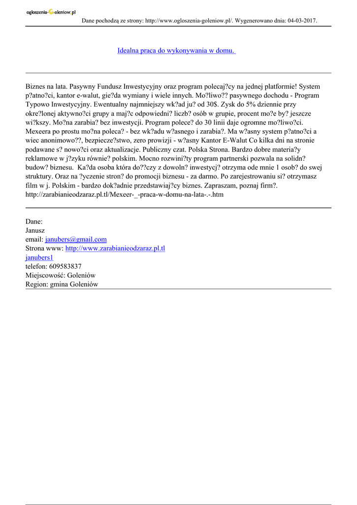 Dane pochodzą ze strony: http://www.ogloszenia-goleniow.pl/. Wygenerowano dnia: 04-03-2017. Idealna praca do wykonywania w domu. Biznes na lata. Pasywny Fundusz Inwestycyjny oraz program polecaj?cy na jednej platformie! System p?atno?ci, kantor e-walut, gie?da wymiany i wiele innych. Mo?liwo?? pasywnego dochodu - Program Typowo Inwestycyjny. Ewentualny najmniejszy wk?ad ju? od 30$. Zysk do 5% dziennie przy okre?lonej aktywno?ci grupy a maj?c odpowiedni? liczb? osób w grupie, procent mo?e by? jeszcze wi?kszy. Mo?na zarabia? bez inwestycji. Program polece? do 30 linii daje ogromne mo?liwo?ci. Mexeera po prostu mo?na poleca? - bez wk?adu w?asnego i zarabia?. Ma w?asny system p?atno?ci a wiec anonimowo??, bezpiecze?stwo, zero prowizji - w?asny Kantor E-Walut Co kilka dni na stronie podawane s? nowo?ci oraz aktualizacje. Publiczny czat. Polska Strona. Bardzo dobre materia?y reklamowe w j?zyku równie? polskim. Mocno rozwini?ty program partnerski pozwala na solidn? budow? biznesu. Ka?da osoba która do??czy z dowoln? inwestycj? otrzyma ode mnie 1 osob? do swej struktury. Oraz na ?yczenie stron? do promocji biznesu - za darmo. Po zarejestrowaniu si? otrzymasz film w j. Polskim - bardzo dok?adnie przedstawiaj?cy biznes. Zapraszam, poznaj firm?. http://zarabianieodzaraz.pl.tl/Mexeer-_-praca-w-domu-na-lata-.-.htm Dane: Janusz email: [email protected] Strona www: http://www.zarabianieodzaraz.pl.tl janubers1 telefon: 609583837 Miejscowość: Goleniów Region: gmina Goleniów