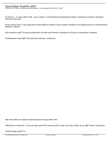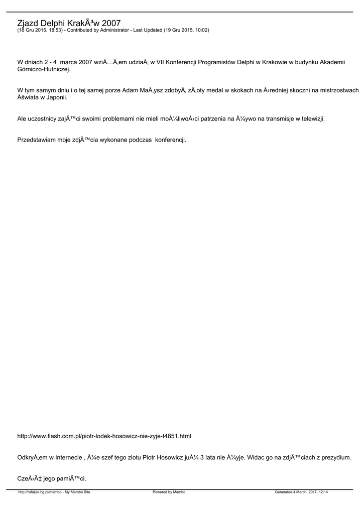 Zjazd Delphi Kraków 2007 (18 Gru 2015, 18:53) - Contributed by Administrator - Last Updated (19 Gru 2015, 10:02) W dniach 2 - 4 marca 2007 wziÄ…Å‚em udziaÅ‚ w VII Konferencji Programistów Delphi w Krakowie w budynku Akademii Górniczo-Hutniczej. W tym samym dniu i o tej samej porze Adam MaÅ‚ysz zdobyÅ‚ zÅ‚oty medal w skokach na Å›redniej skoczni na mistrzostwach Åšwiata w Japonii. Ale uczestnicy zajÄ™ci swoimi problemami nie mieli możliwoÅ›ci patrzenia na żywo na transmisje w telewizji. Przedstawiam moje zdjÄ™cia wykonane podczas konferencji. http://www.flash.com.pl/piotr-lodek-hosowicz-nie-zyje-t4851.html OdkryÅ‚em w Internecie , że szef tego zlotu Piotr Hosowicz już 3 lata nie żyje. Widac go na zdjÄ™ciach z prezydium. Cześć jego pamiÄ™ci. http://rafaljak.hg.pl/mambo - My Mambo Site Powered by Mambo Generated:4 March, 2017, 12:14