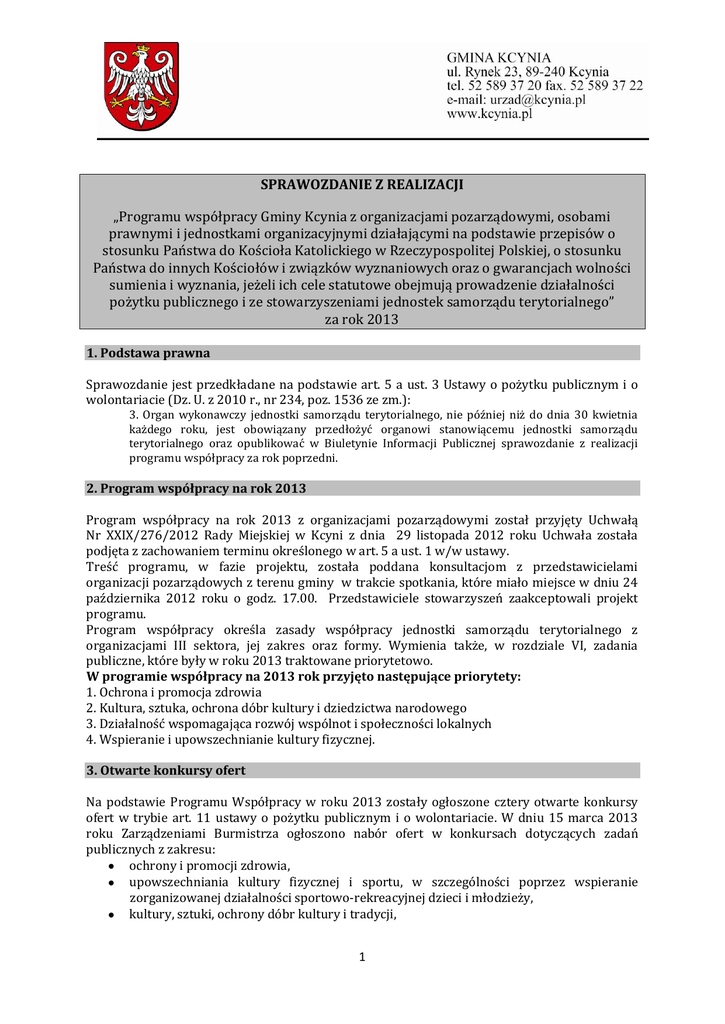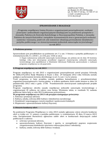 SPRAWOZDANIE Z REALIZACJI „Programu współpracy Gminy Kcynia z organizacjami pozarządowymi, osobami prawnymi i jednostkami organizacyjnymi działającymi na podstawie przepisów o stosunku Państwa do Kościoła Katolickiego w Rzeczypospolitej Polskiej, o stosunku Państwa do innych Kościołów i związków wyznaniowych oraz o gwarancjach wolności sumienia i wyznania, jeżeli ich cele statutowe obejmują prowadzenie działalności pożytku publicznego i ze stowarzyszeniami jednostek samorządu terytorialnego” za rok 2013 1. Podstawa prawna Sprawozdanie jest przedkładane na podstawie art. 5 a ust. 3 Ustawy o pożytku publicznym i o wolontariacie (Dz. U. z 2010 r., nr 234, poz. 1536 ze zm.): 3. Organ wykonawczy jednostki samorządu terytorialnego, nie później niż do dnia 30 kwietnia każdego roku, jest obowiązany przedłożyć organowi stanowiącemu jednostki samorządu terytorialnego oraz opublikować w Biuletynie Informacji Publicznej sprawozdanie z realizacji programu współpracy za rok poprzedni. 2. Program współpracy na rok 2013 Program współpracy na rok 2013 z organizacjami pozarządowymi został przyjęty Uchwałą Nr XXIX/276/2012 Rady Miejskiej w Kcyni z dnia 29 listopada 2012 roku Uchwała została podjęta z zachowaniem terminu określonego w art. 5 a ust. 1 w/w ustawy. Treść programu, w fazie projektu, została poddana konsultacjom z przedstawicielami organizacji pozarządowych z terenu gminy w trakcie spotkania, które miało miejsce w dniu 24 października 2012 roku o godz. 17.00. Przedstawiciele stowarzyszeń zaakceptowali projekt programu. Program współpracy określa zasady współpracy jednostki samorządu terytorialnego z organizacjami III sektora, jej zakres oraz formy. Wymienia także, w rozdziale VI, zadania publiczne, które były w roku 2013 traktowane priorytetowo. W programie współpracy na 2013 rok przyjęto następujące priorytety: 1. Ochrona i promocja zdrowia 2. Kultura, sztuka, ochrona dóbr kultury i dziedzictwa narodowego 3. Działalność wspomagająca rozwój wspólnot i społeczności lokalnych 4. Wspieranie i upowszechnianie kultury fizycznej. 3. Otwarte konkursy ofert Na podstawie Programu Współpracy w roku 2013 zostały ogłoszone cztery otwarte konkursy ofert w trybie art. 11 ustawy o pożytku publicznym i o wolontariacie. W dniu 15 marca 2013 roku Zarządzeniami Burmistrza ogłoszono nabór ofert w konkursach dotyczących zadań publicznych z zakresu: ochrony i promocji zdrowia, upowszechniania kultury fizycznej i sportu, w szczególności poprzez wspieranie zorganizowanej działalności sportowo-rekreacyjnej dzieci i młodzieży, kultury, sztuki, ochrony dóbr kultury i tradycji, 1 działalności wspomagającej rozwój wspólnot i społeczności lokalnych. Podjęto następujące zarządzenia: Zarządzenie Nr 10/2013 Burmistrza Kcyni z dnia 17 stycznia 2013 roku w sprawie ogłoszenia otwartego konkursu ofert nr 1/2013 na wykonanie zadania publicznego w zakresie kultury, sztuki, ochrony dóbr kultury i tradycji, w szczególności poprzez wspieranie działalności orkiestry dętej. W dniu 27 lutego 2013 roku o godz. 14.00 odbyło się posiedzenie komisji konkursowej powołanej Zarządzeniem Burmistrza Kcyni Nr 38/2013 z dnia 22 lutego 2013 roku oraz Zarządzeniem nr 40/2013 z dnia 25 lutego 2013 roku. Komisja została powołana do rozpatrzenia ofert na realizację zadania publicznego w zakresie kultury, sztuki, ochrony dóbr kultury i tradycji. Wpłynęła jedna oferta OSP Kcynia na „Prowadzenie orkiestry dętej przy OSP Kcynia”. Oferent otrzymał dofinansowanie w kwocie 30.000,00 zł. W toku realizacji zadania aneksem Nr 1 z dnia 18 kwietnia 2013 roku do umowy 48/2013 z dnia 5 marca 2013 roku zmieniony został nr konta bankowego zleceniobiorcy. Pozostałe warunki umowy pozostały bez zmian. Ponadto wnioskodawca pismem z dnia 15 listopada 2013 roku zwrócił się z prośbą o wyrażenie zgody na przesunięcie części wkładu własnego z pozycji 7 na pozycję 6 i 8. Zgodnie z umową par. 9 ust. 4-6. ograniczenia co do możliwości przesunięć środków dotyczą tylko i wyłącznie dotacji. Istnieje dowolność w tym zakresie jeśli chodzi o wkład własny. Informację przekazano po akceptacji pisma – wnioskodawcy. Nie przeszkodziło to w prawidłowej realizacji zadania i osiągnięciu zamierzonych rezultatów. Sprawozdanie końcowe stowarzyszenia wpłynęło do Urzędu w terminie określonym w umowie tj. 14 stycznia 2014 roku. Sprawozdanie zostało zaakceptowane „Protokołem kontroli realizacji zadania na podstawie sprawozdania końcowego” (załącznik do zarządzenia nr 190/2013 z dnia 15 października 2013). W uwagach do części kontroli formalno – rachunkowej zapisano, iż zleceniodawca zobowiązany jest do zwrotu zgodnie z umową niewykorzystanej kwoty dotacji w wysokości – 120,00 zł plus odsetki. Zarządzenie Nr 47/2013 Burmistrza Kcyni z dnia 15 marca 2013 roku w sprawie ogłoszenia otwartego konkursu ofert nr 2/2013 na wykonanie zadania publicznego w zakresie ochrony i promocji zdrowia. W dniu 17 kwietnia 2013 roku o godz. 14.30 odbyło się posiedzenie komisji konkursowej powołanej Zarządzeniem Burmistrza Kcyni Nr 70/2013 z dnia 11 kwietnia 2013 roku. Komisja została powołana do rozpatrzenia ofert złożonych w 3 otwartych konkursach ofert: w zakresie ochrony i promocji zdrowia, upowszechniania kultury fizycznej i sportu oraz działalności na rzecz wspólnot lokalnych. Na konkurs wpłynęła jedna oferta pt. „Akademia zdrowia i urody”. Oferta KujawskoPomorskiego Stowarzyszenia Kobiet w Żninie Koło Terenowe Górki Zagajne spełniała wymogi formalne i merytoryczne. Oferent otrzymał wnioskowane 2.000,00 zł. 2 W ramach projektu mieszkanki wsi Górki Zagajne i Górki Dąbskie (ok. 25 osób) w okresie od maja do września 2013 roku brały udział w systematycznych ćwiczeniach fizycznych pod okiem instruktora (2 x w tygodniu przez 1,5 godz.) Uzupełnieniem ćwiczeń były zajęcia edukacyjne d