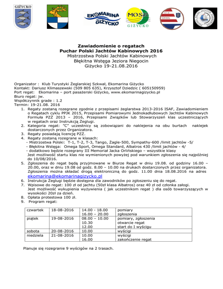 Zawiadomienie o regatach Puchar Polski Jachtów Kabinowych 2016 Mistrzostwa Polski Jachtów Kabinowych Błękitna Wstęga Jeziora Niegocin Giżycko 19-21.08.2016 Organizator : Klub Turystyki Żeglarskiej Szkwał, Ekomarina Giżycko Kontakt: Dariusz Klimaszewski (509 805 635), Krzysztof Dziedzic ( 605150959) Port regat: Ekomarina – port pasażerski Giżycko, www.ekomarinagizycko.pl Biuro regat: jw. Współczynnik grade : 1.2 Termin: 19-21.08. 2016 1. Regaty zostaną rozegrane zgodnie z przepisami żeglarstwa 2013-2016 ISAF, Zawiadomieniem o Regatach cyklu PPJK 2015, Przepisami Pomiarowymi Jednokadłubowych Jachtów Kabinowych Formuła PZŻ 2013 – 2016, Przepisami Związków lub Stowarzyszeń klas uczestniczących w regatach oraz Instrukcją Żeglugi. 2. Kategoria regat: ”C” uczestnicy są zobowiązani do naklejenia na obu burtach naklejek dostarczonych przez Organizatora. 3. Regaty posiadają licencję PZŻ. 4. Regaty zostaną rozegrane w klasach: - Mistrzostwa Polski: T-1, T-2, T-3, Tango, Żagle-500, Sympathy-600 /limit jachtów -5/ - Błękitna Wstęga: Omega Sport, Omega Standard, Albatros 430 /limit jachtów - 4/ - dodatkowo będzie rozegrany III Memoriał Jacka Orlińskiego – wszystkie klasy Jest możliwość startu klas nie wymienionych powyżej pod warunkiem zgłoszenia się najpóźniej do 10/08/2016. 5. Zgłoszenia do regat będą przyjmowane w Biurze Regat w dniu 19.08. od godziny 16.00 – 20.00, oraz w dniu 19.08 od godz. 8.00 – 10.00 na drukach dostarczonych przez organizatora. Zgłoszenia można składać drogą elektroniczną do godz. 11.00 dnia 18.08.2016 na adres [email protected] 6. Instrukcja Żeglugi będzie dostępna dla zawodników po zgłoszeniu się do regat. 7. Wpisowe do regat: 100 zł od jachtu (50zł klasa Albatros) oraz 40 zł od członka załogi. Jest możliwość wykupienia wyżywienia ( jak uczestnikom regat ) dla osób towarzyszących w wysokości 20zł za dzień. 8. Opłata protestowa 100 zł. 9. Program regat: czwartek 18-08-2016 piątek 19-08-2016 sobota niedziela 20-08-2016 21-08-2016 14.00 - 18.00 16.00 – 20.00 08.00 – 10.00 10.30 12.00 10.00 10.00 16.00 Planuje się rozegranie 9 wyścigów na 2 trasach. pomiary zgłoszenia pomiary, zgłoszenia otwarcie regat start do I wyścigu wyścigi wyścigi zakończenie regat 10. Jachty startujące w regatach: muszą posiadać widoczne oznakowanie identyfikacyjne w postaci numerów startowych dostarczonych przez Organizatora, naklejonych na obu burtach w części dziobowej jachtu. 11. Kontrola sprzętu w zakresie zgodności jachtu z przepisami klasowymi może zostać dokonana w dowolnym czasie podczas regat. Osobami uprawnionymi do przeprowadzenia kontroli zgodności parametrów jachtu z wielkościami zadeklarowanymi przez zawodnika w klasach T oraz przepisami pomiarowymi klas uczestniczących są: Wojciech Caban i Jarosław Bazyłko. 12. Ubezpieczenie: sternicy jachtów zgłoszonych do regat muszą posiadać ważną na czas wyścigów polisę OC, obejmującą w swym zakresie zdarzenia wynikłe podczas wyścigów. Brak ważnej polisy OC będzie skutkował nie przyjęciem zgłoszenia do regat. Organizator zapewnia przed regatami możliwości dokonania ubezpieczeń na czas regat. 13. Warunki pobytu: całkowite zwolnienie z opłat za korzystanie ze slipu(bez bramownicy), postój jachtów, przyczep i samochodów, WC. Opłaty zniżkowe na: slipowanie za pomocą bramownicy – 90 zł., karta portowa 8 zł./doba/osoba (prysznice, kuchnia, pralnia). 14. Nagrody: według uznania organizatora. 15. Zakwaterowanie i wyżywienie: Centrum Promocji i Informacji Turystycznej w Giżycku tel. 87 4285265, www.gizycko.turystyka.pl, LOK Giżycko tel. 87 428 1408, Tawerna Marina Tel.512 087 120, Tawerna Siwa Czapla Tel.668314477, Tawerna Kajuta Tel.606839880 16. Ważenie jachtów przed regatami - port LOK - 30 zł – Tel. kontaktowy 603770891 Zapraszamy Prezes KTŻ Szkwał - Krzysztof Dziedzic Kierownik Portu Ekomarina - Dariusz Klimaszewski YACHT SERWIS Sygnowski