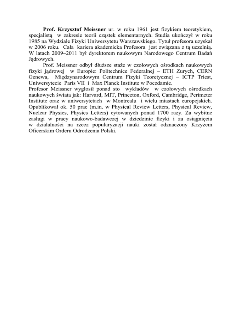 Prof. Krzysztof Meissner ur. w roku 1961 jest fizykiem teoretykiem, specjalistą w zakresie teorii cząstek elementarnych. Studia ukończył w roku 1985 na Wydziale Fizyki Uniwersytetu Warszawskiego. Tytuł profesora uzyskał w 2006 roku. Cała kariera akademicka Profesora jest związana z tą uczelnią. W latach 2009–2011 był dyrektorem naukowym Narodowego Centrum Badań Jądrowych. Prof. Meissner odbył dłuższe staże w czołowych ośrodkach naukowych fizyki jądrowej w Europie: Politechnice Federalnej – ETH Zurych, CERN Genewa, Międzynarodowym Centrum Fizyki Teoretycznej – ICTP Triest, Uniwersytecie Paris VII i Max Planck Institute w Poczdamie. Profesor Meissner wygłosił ponad sto wykładów w czołowych ośrodkach naukowych świata jak: Harvard, MIT, Princeton, Oxford, Cambridge, Perimeter Institute oraz w uniwersytetach w Montrealu i wielu miastach europejskich. Opublikował ok. 50 prac (m.in. w Physical Review Letters, Physical Review, Nuclear Physics, Physics Letters) cytowanych ponad 1700 razy. Za wybitne zasługi w pracy naukowo-badawczej w dziedzinie fizyki i za osiągnięcia w działalności na rzecz popularyzacji nauki został odznaczony Krzyżem Oficerskim Orderu Odrodzenia Polski.
